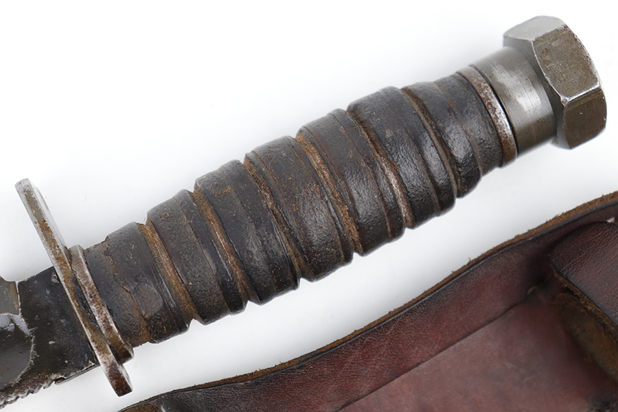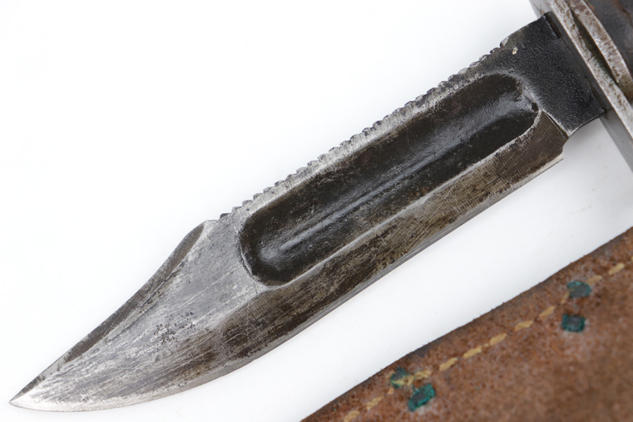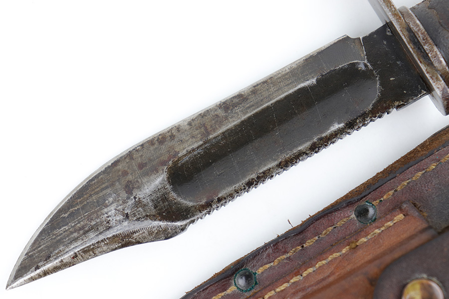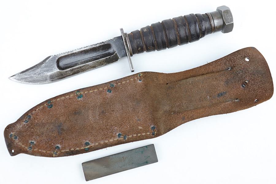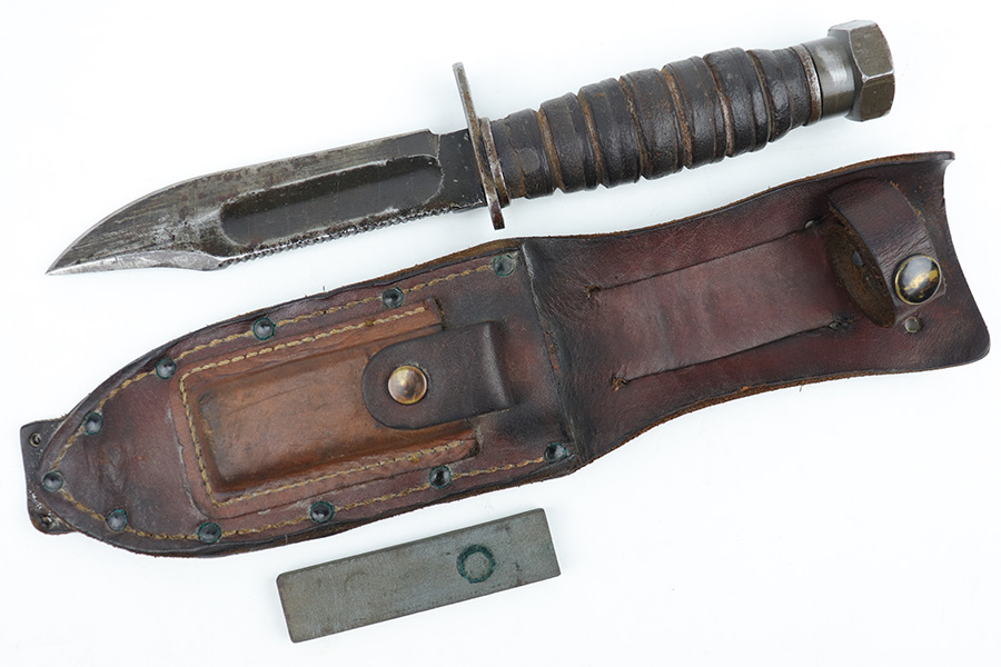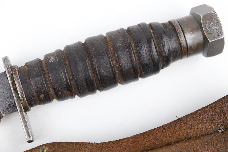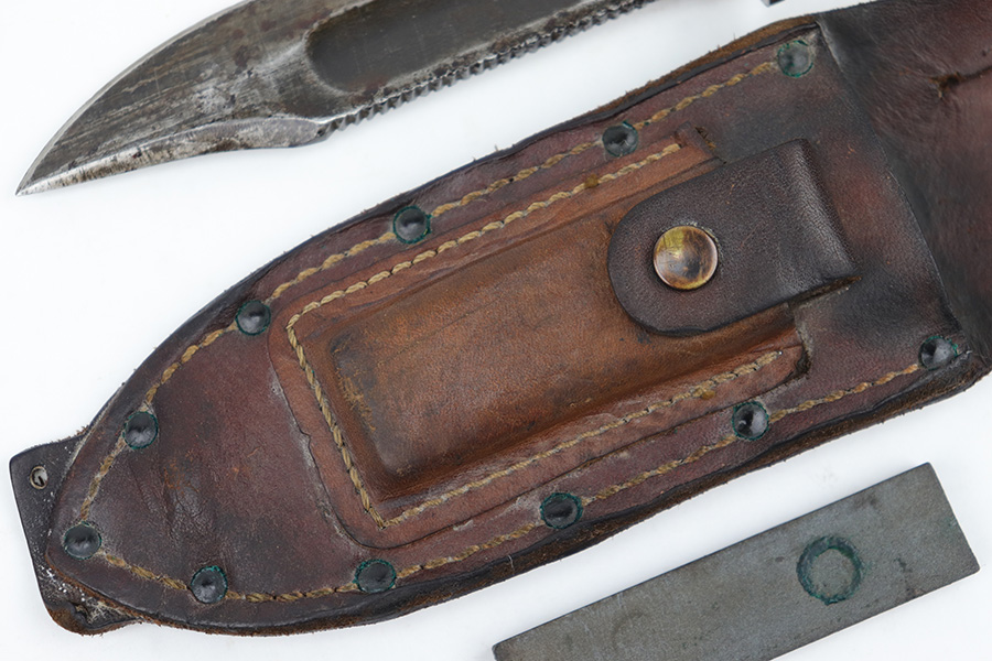 3/29/23 – This is an original I-1967 Camillus Survival Knife. This was an early Vietnam era utility knife used by US Pilots. This example is in great overall condition with some honest wear throughout the blade. This is mostly finish loss and dark patina near the tip and serrated spine of the blade. Signs of sharpening and honest use along the edge. The handle is in great condition. The metal hand guard and pommel show typical surface patina. Comes with an original scabbard in great condition with included sharpening stone in the front pocket.