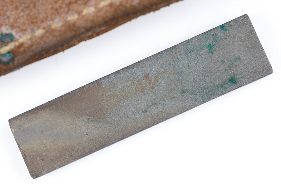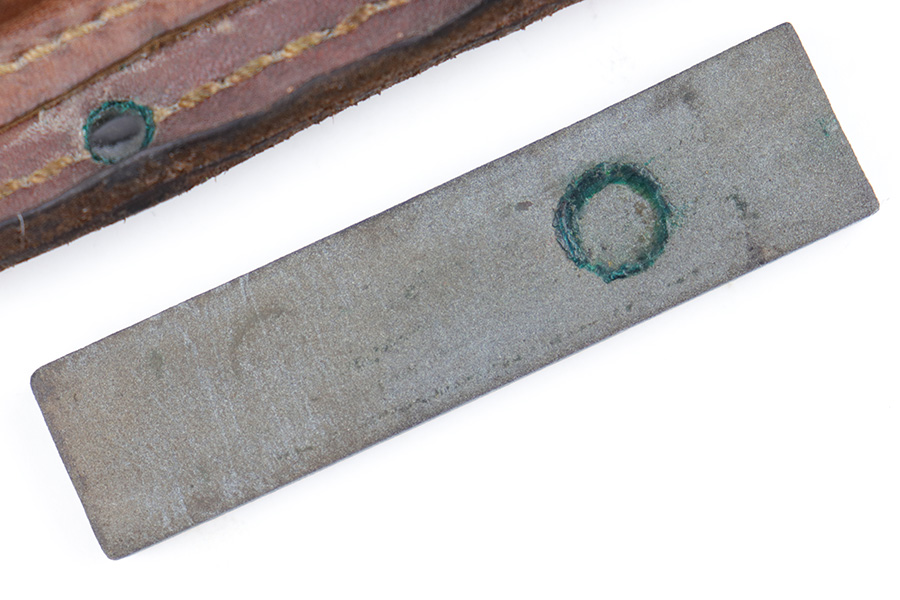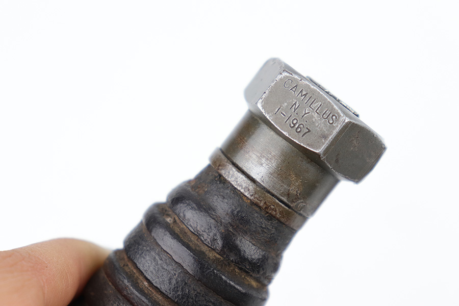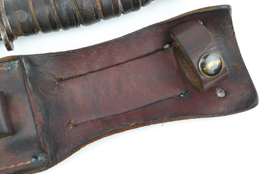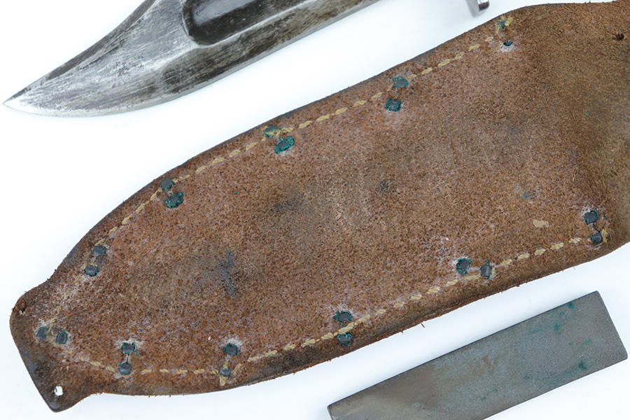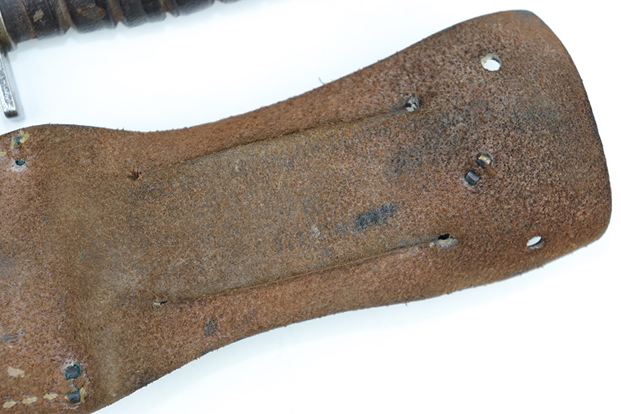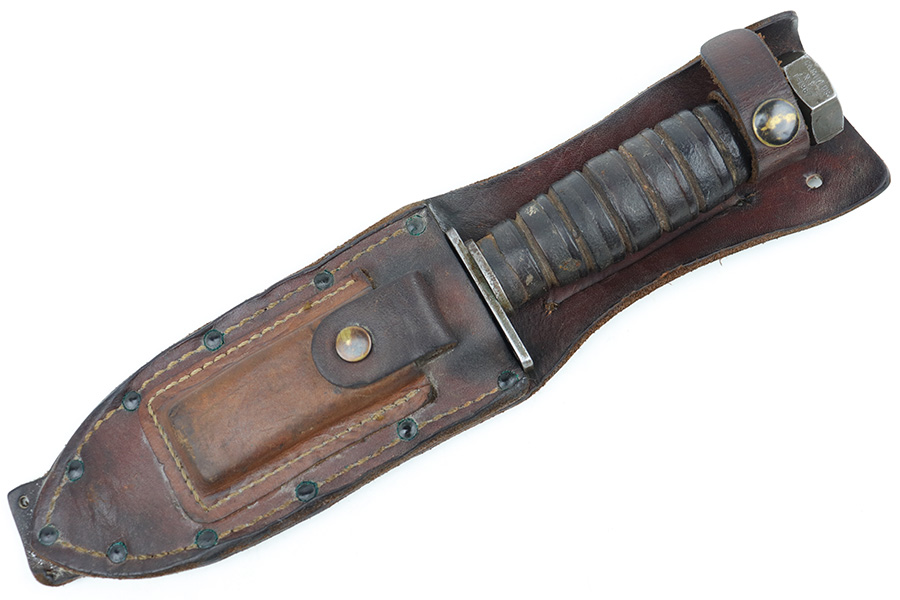 3/29/23 – This is an original I-1967 Camillus Survival Knife. This was an early Vietnam era utility knife used by US Pilots. This example is in great overall condition with some honest wear throughout the blade. This is mostly finish loss and dark patina near the tip and serrated spine of the blade. Signs of sharpening and honest use along the edge. The handle is in great condition. The metal hand guard and pommel show typical surface patina. Comes with an original scabbard in great condition with included sharpening stone in the front pocket.