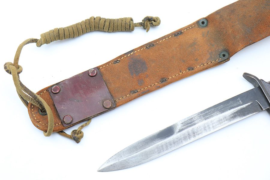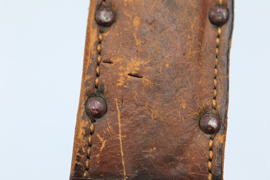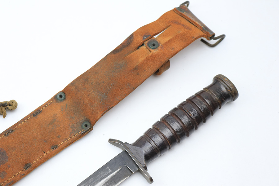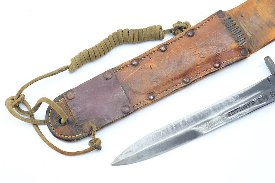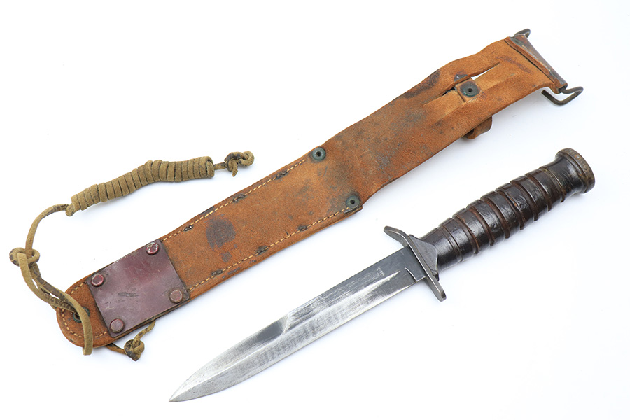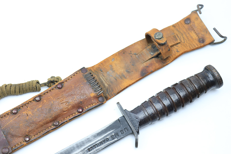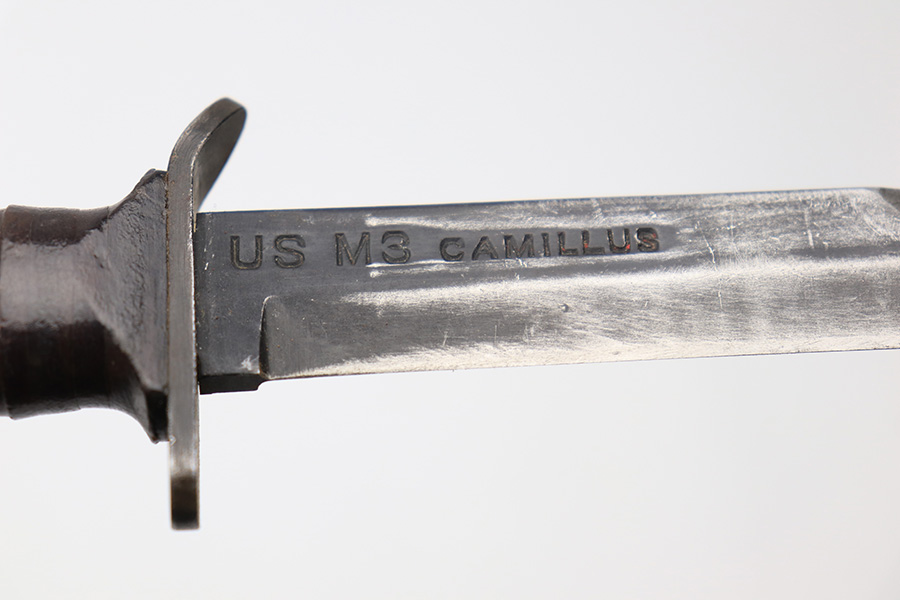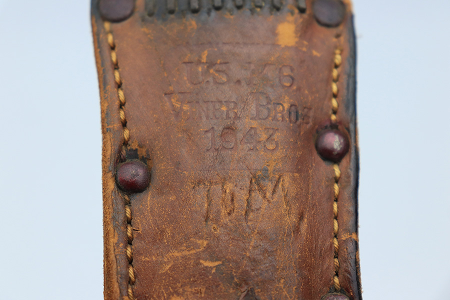 3/16/22 – This is an original US M3 fighting knife by Camillus. The blade is maker stamped, which means this is a late 1943 or early 1944 production. The blade has no rust or pitting but is missing about half of the finish towards the tip. The handle is in excellent condition and the pommel has a strong ordnance stamp. Comes with a Viner Bros M6 leather scabbard that’s 1943 dated. The scabbard has surface wear throughout but is unaltered and completely intact with all original stitching and metal fixtures.