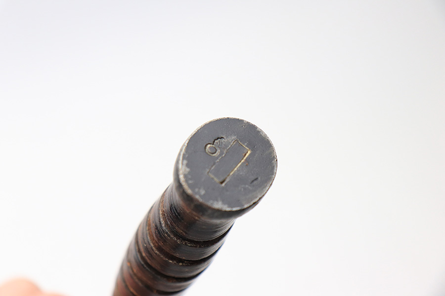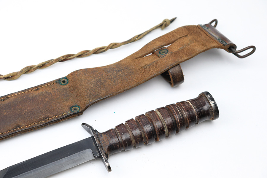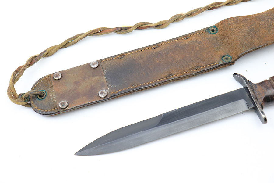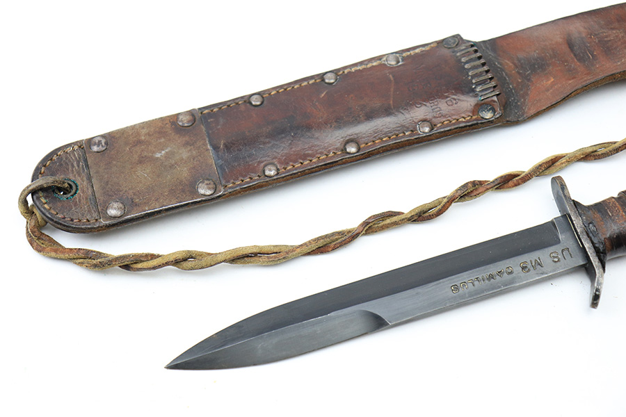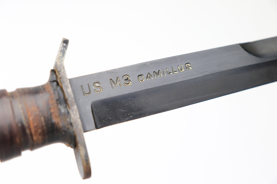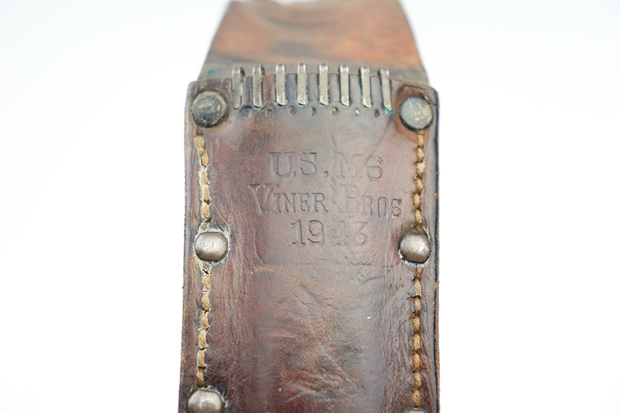 5/31/22 – This is an original US M3 fighting knife with an early 1943 dated leather M6 scabbard. The knife is blade marked by Camillus, and has a dark blued finish throughout. The finish is excellent but we believe this is a post-factory refinish. There is minimal scabbard wear and no signs of sharpening on the edge. The hand guard and pommel have a black painted finish and some mild patina throughout. The pommel is ordnance stamped. The leather handle has some mild surface wear and a few scuffs but is generally tight and in great condition. The scabbard is excellent and maker stamped by Viner Bros on the front. No stitching issues and nice leather throughout.