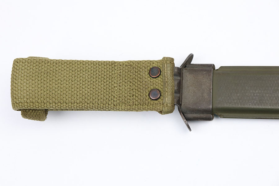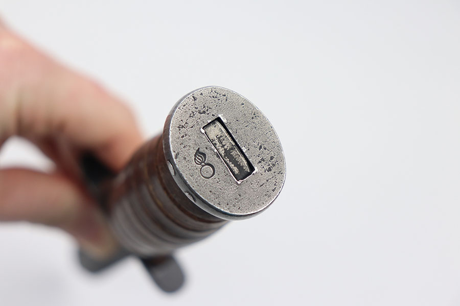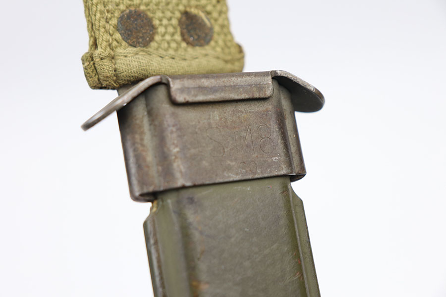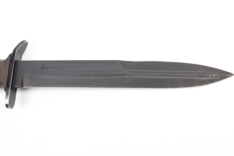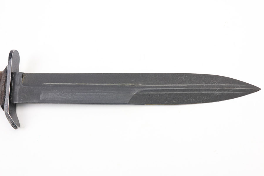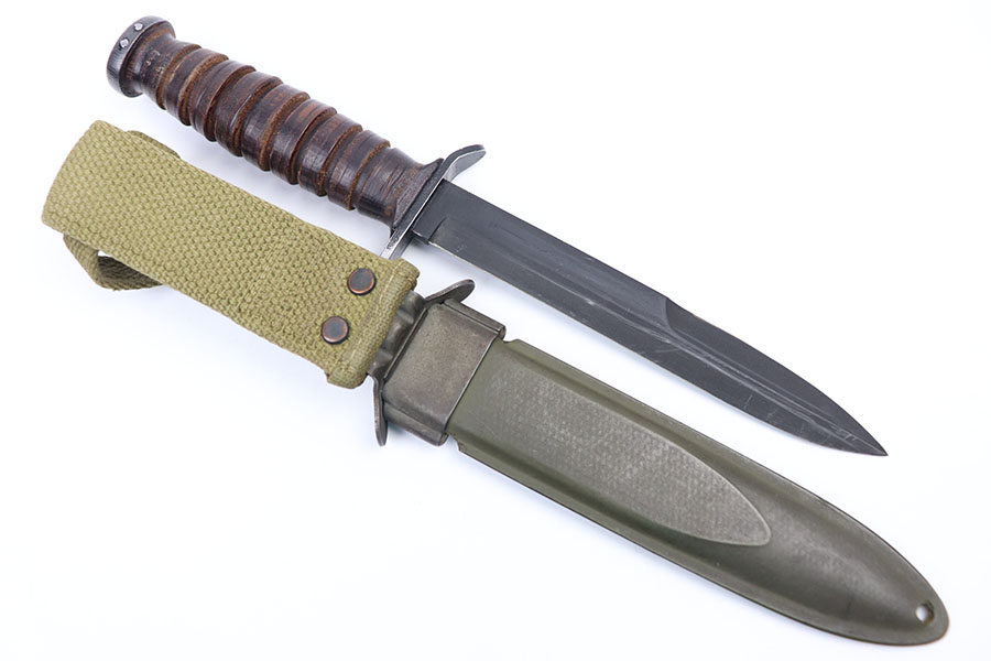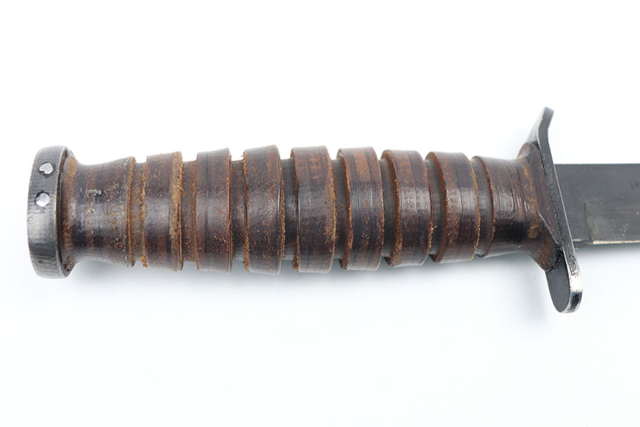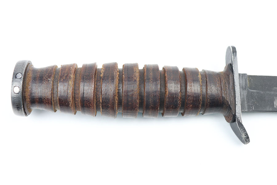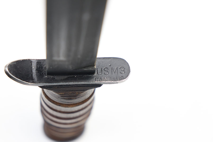 1/27/21 – This is a WW2 era production US M3 fighting knife. Made by Camillus and stamped on the hand guard. The handguard appears to be painted black, which isn’t the original finish. The blade is unsharpened and in excellent condition. The handle is also excellent. Ordnance stamped on the pommel. The sheath is marked US M8 and is in great overall condition.