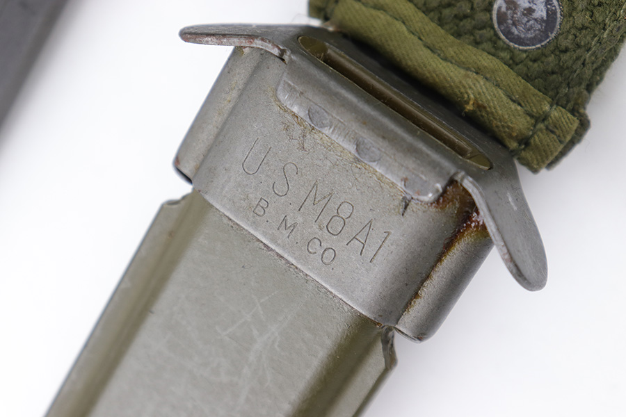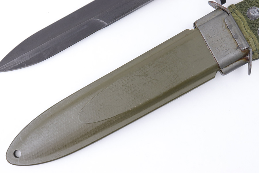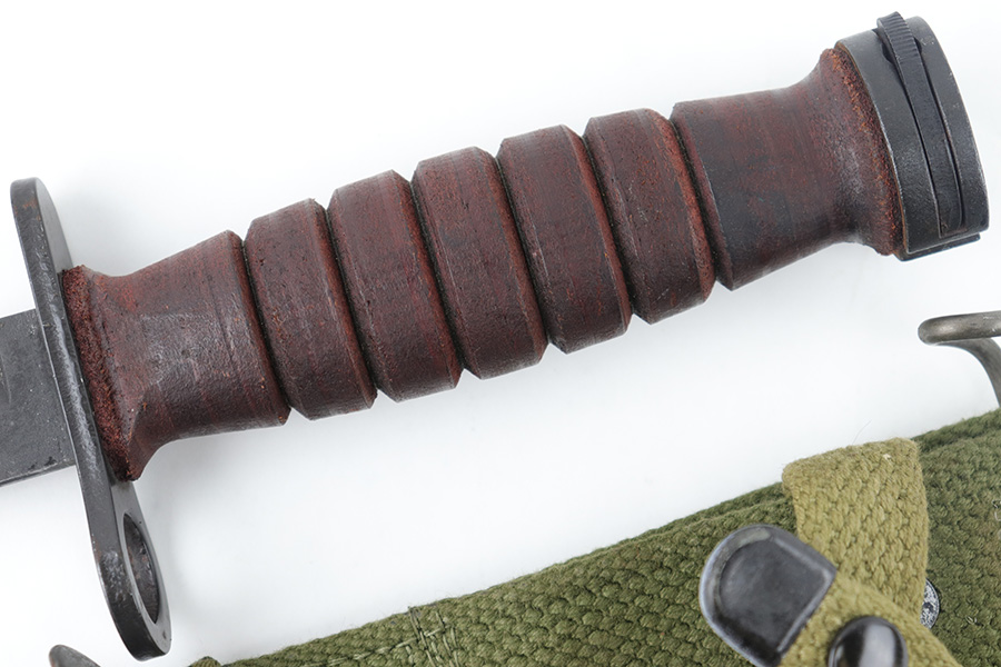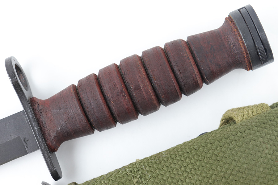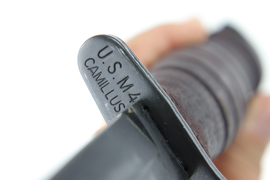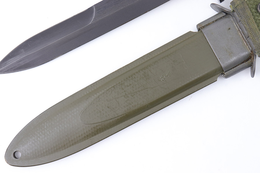 7/11/23 – This is an excellent condition Camillus US M4 bayonet for an M1 Carbine rifle. The bayonet is in excellent condition with a parkerized blade that has some mild scabbard rub wear. The hand guard is maker stamped “U.S. M4 Camillus”. The leather handle is excellent and clean. Comes with an original US M8A1 scabbard. No ordnance proof stamps indicate this was made after WW2.