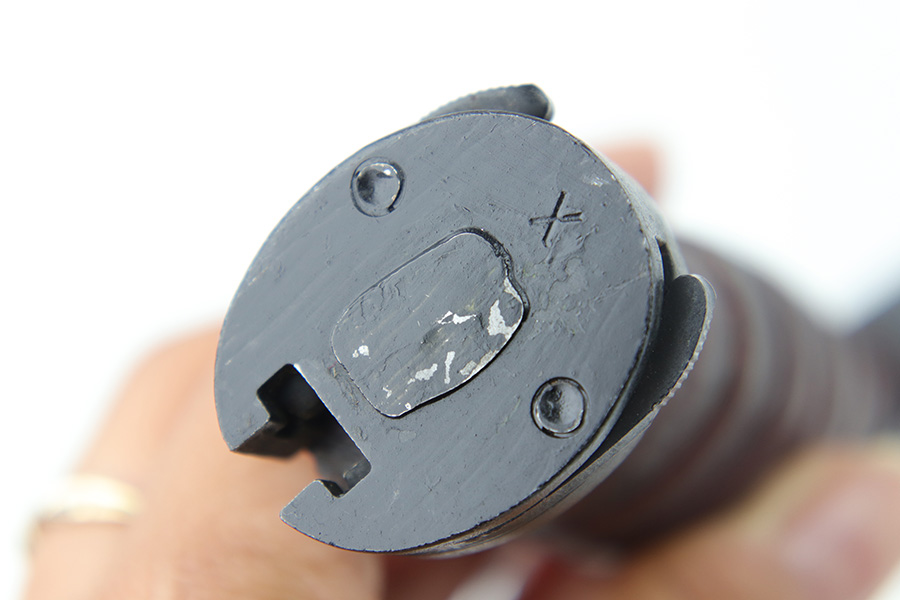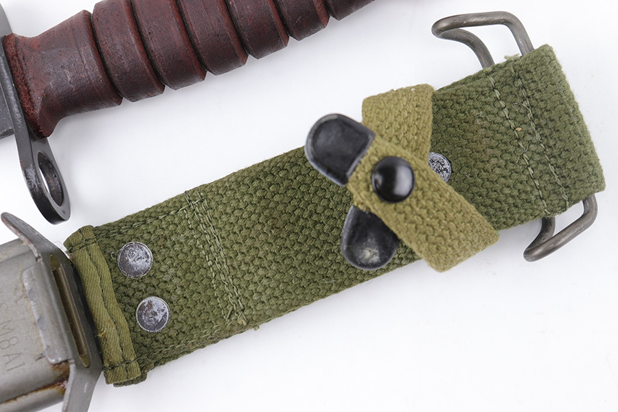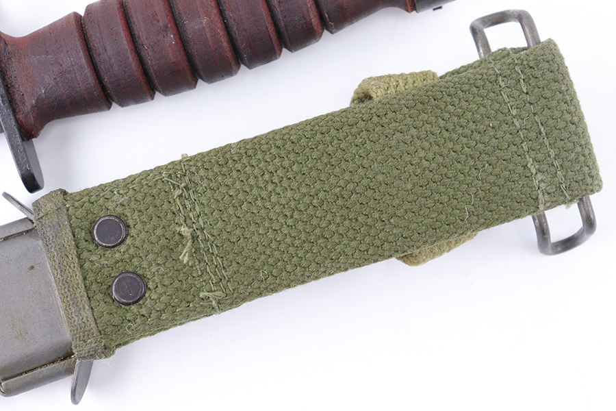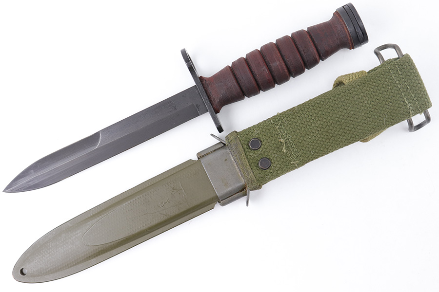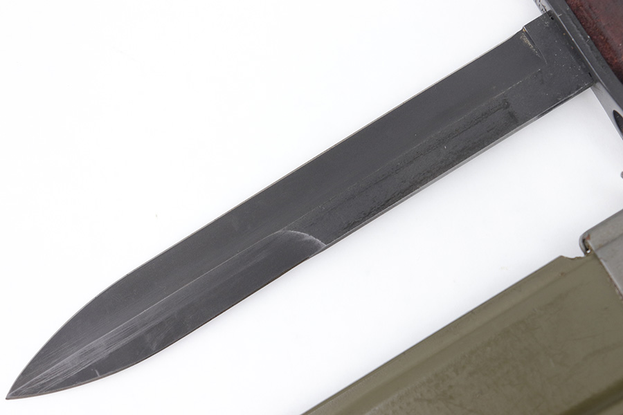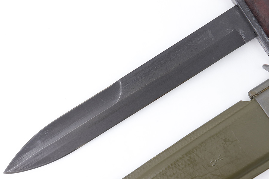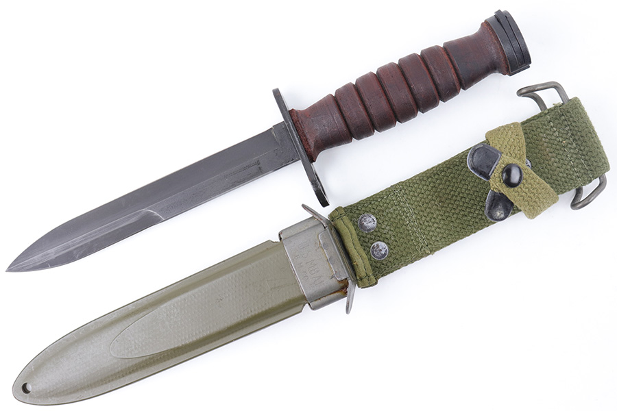 7/11/23 – This is an excellent condition Camillus US M4 bayonet for an M1 Carbine rifle. The bayonet is in excellent condition with a parkerized blade that has some mild scabbard rub wear. The hand guard is maker stamped “U.S. M4 Camillus”. The leather handle is excellent and clean. Comes with an original US M8A1 scabbard. No ordnance proof stamps indicate this was made after WW2.