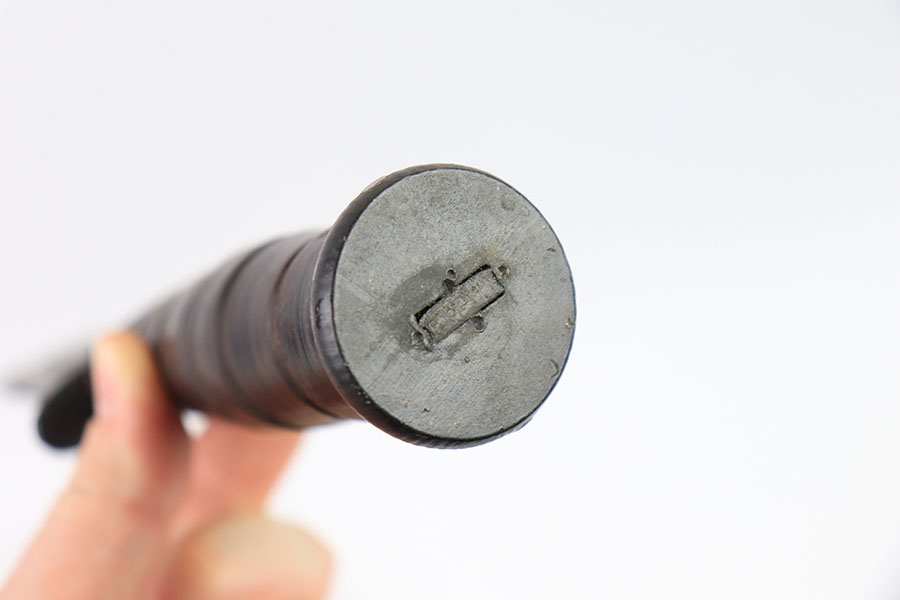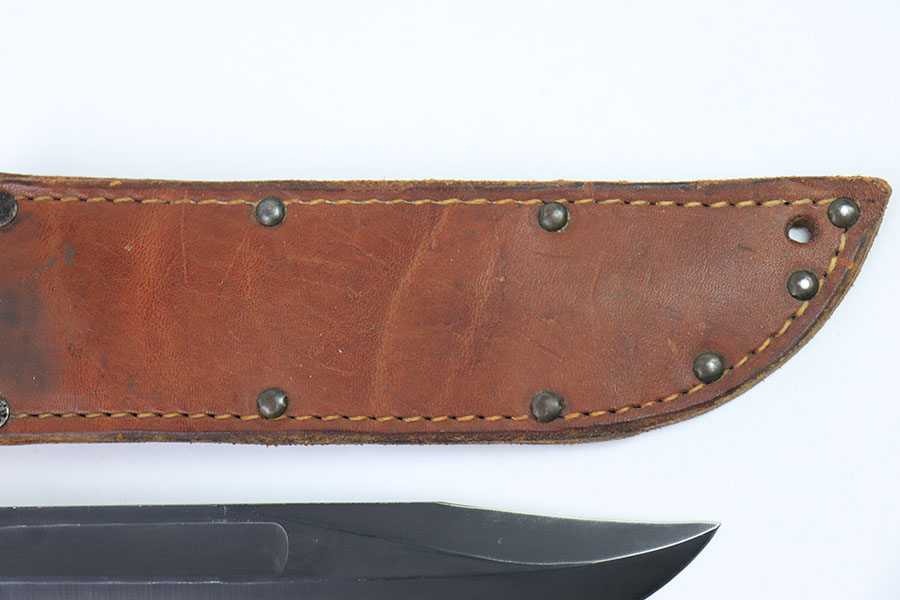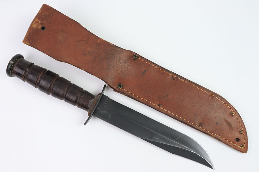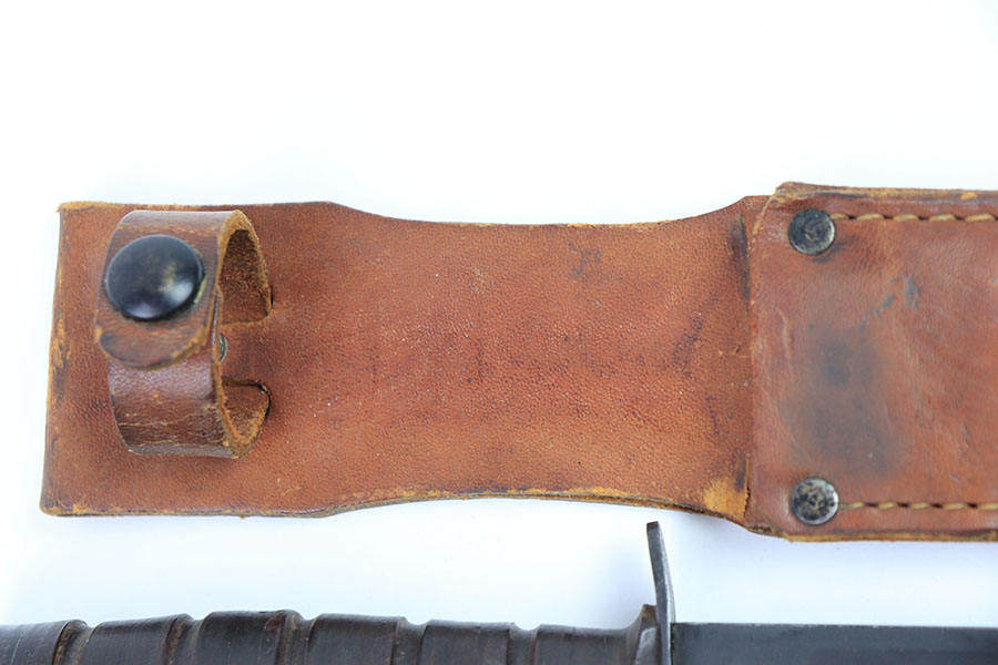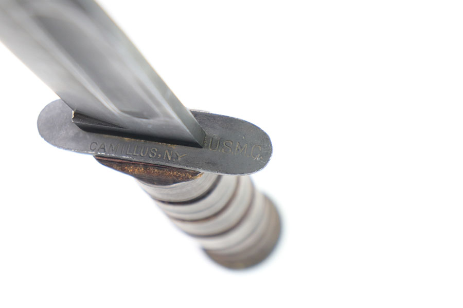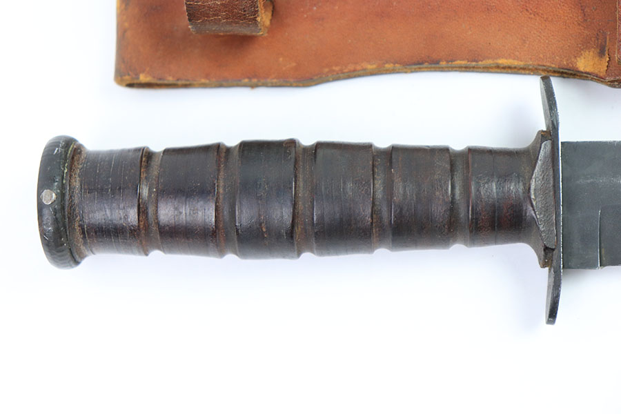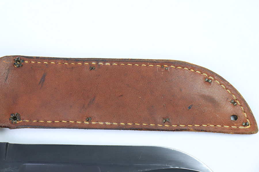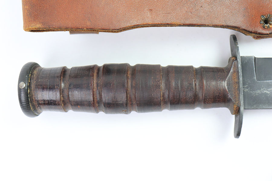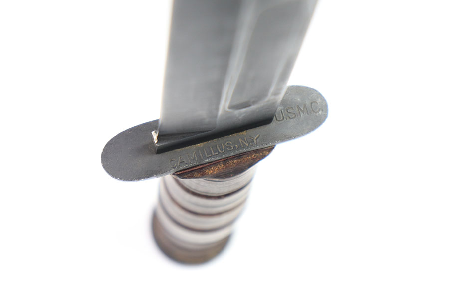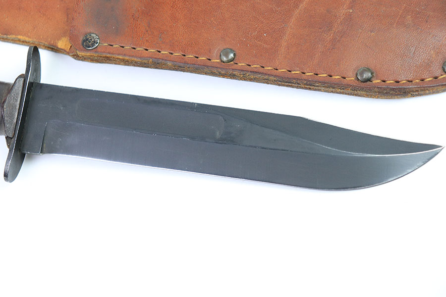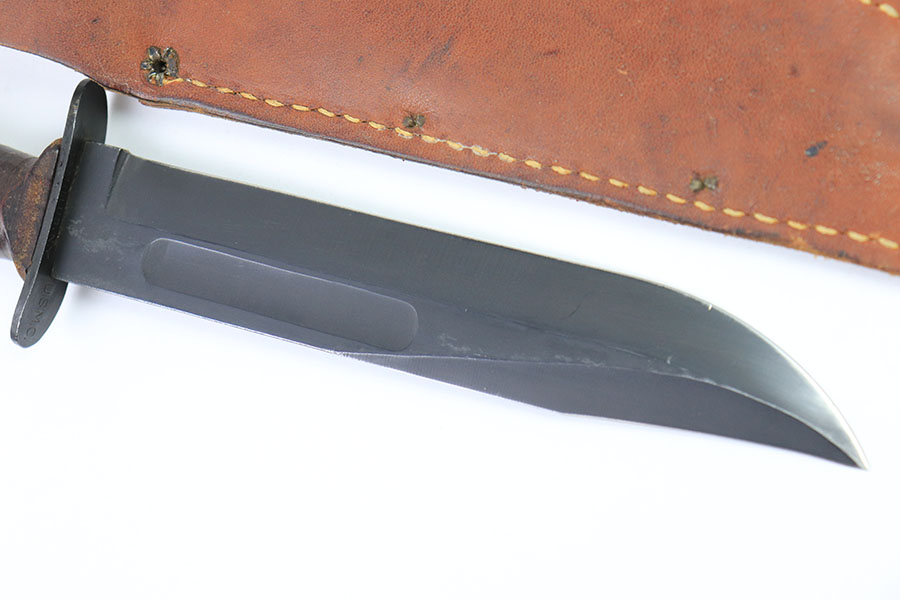 7/19/21 – This is an excellent USMC fighting knife by Camillus. Likely a late WW2 production. The blade is excellent with crisp, clean bluing and some mild steel coloring along the edge. The hand guard is USMC Camillus maker stamped. Excellent leather handle. Comes with an unmarked leather sheath in excellent condition as well.
