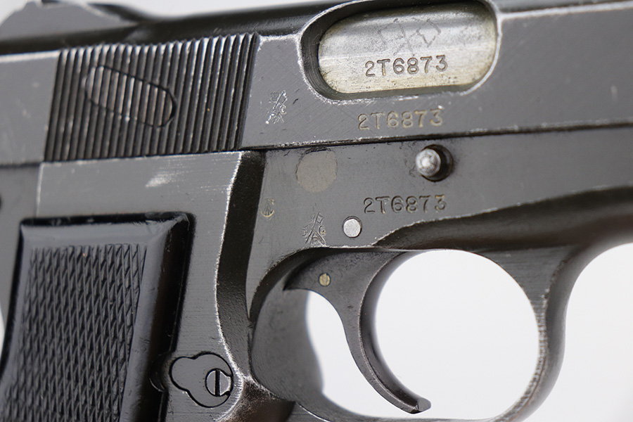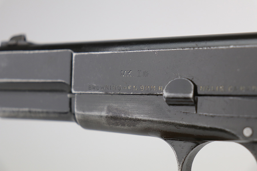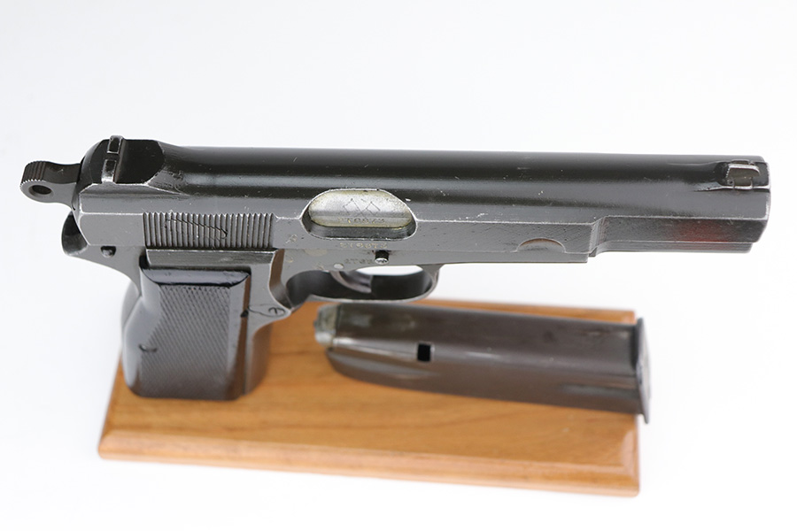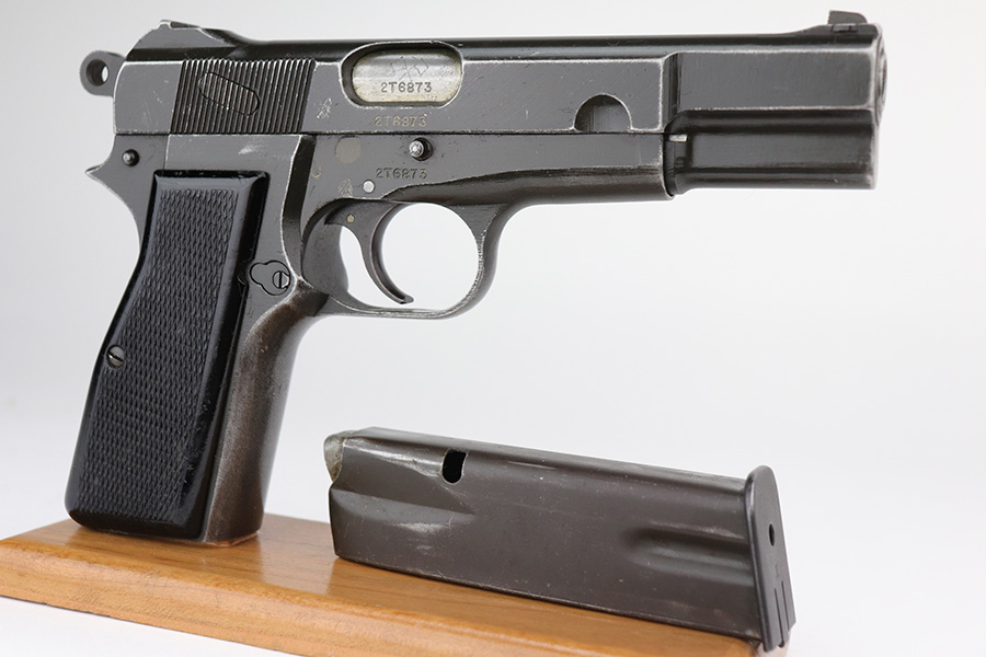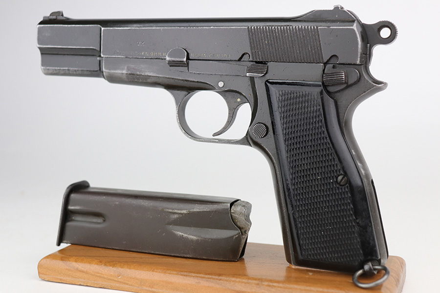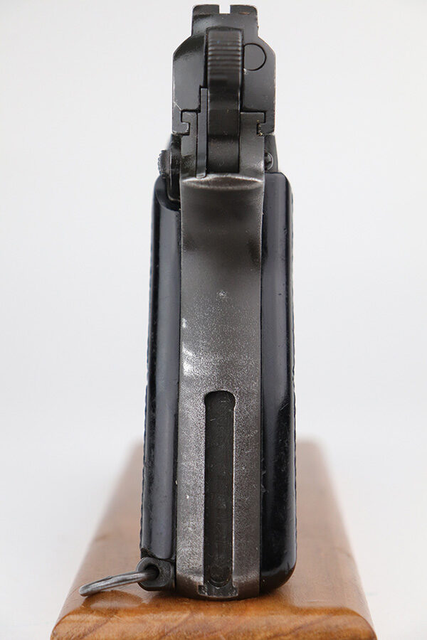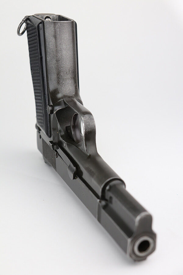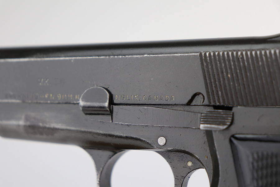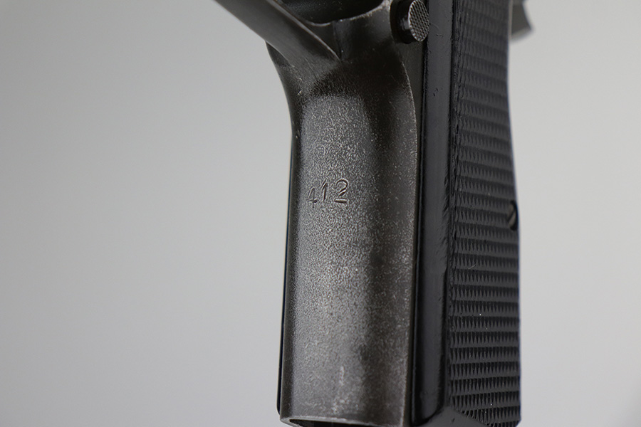9/16/21 – This is a nice example of an Inglis Hi Power issued to the Canadian Armed Forces in October of 1944. It is all matching and has the proper Candian military proofs. There is no Canadian Maple leaf insignia on the front strap. There is, however, a “412” marking on the front strap. We’re not sure of the meaning – could be a unit marking. It has retained about 85% of its finish. There is minor wear around the high edges and thinning on the whole underside of the frame, including the front strap. Also some thinning on the back strap. There is an area of oxidation toward the front of the left side of the frame. Lanyard ring is intact. Comes with excellent black bakelite grips and a proper “JI” marked Inglis magazine. The bore has strong rifling with very minor pin-pricking throughout.