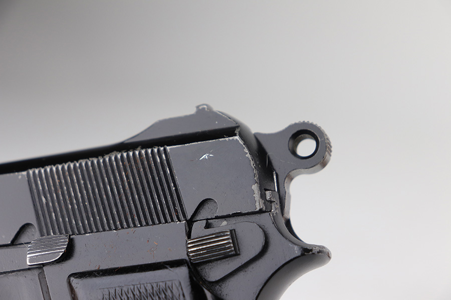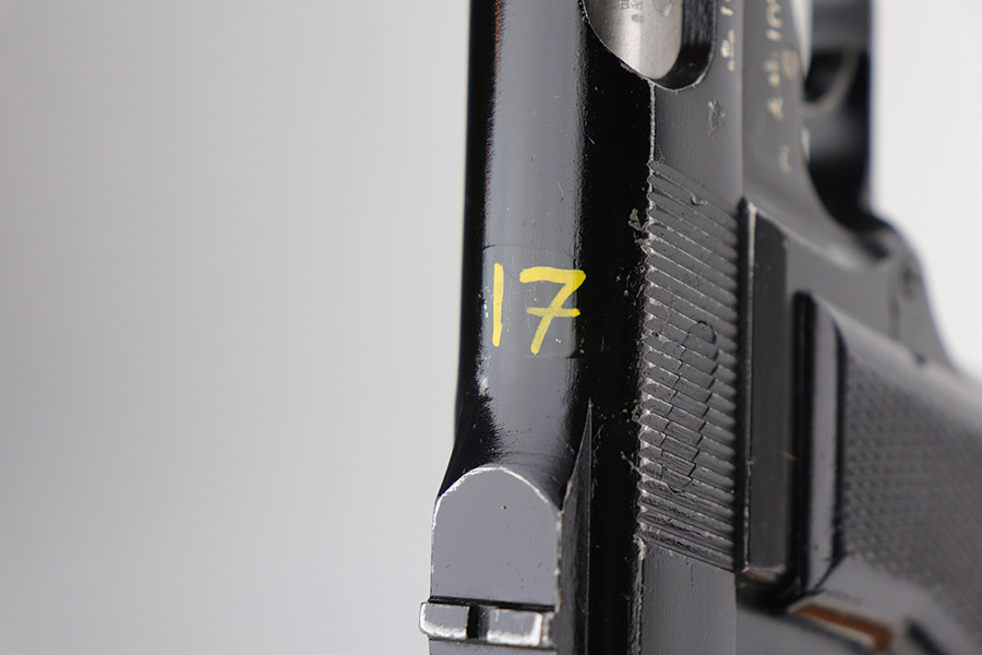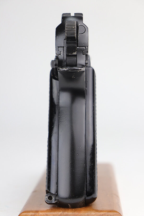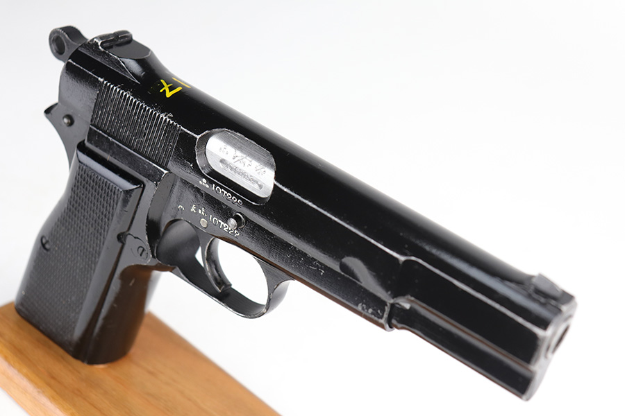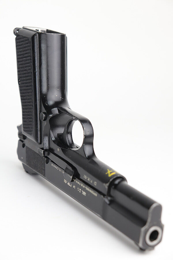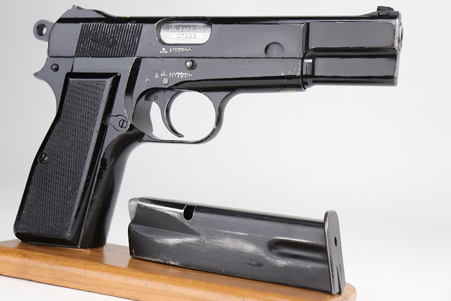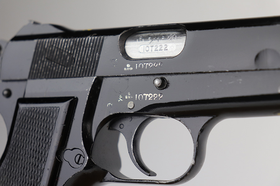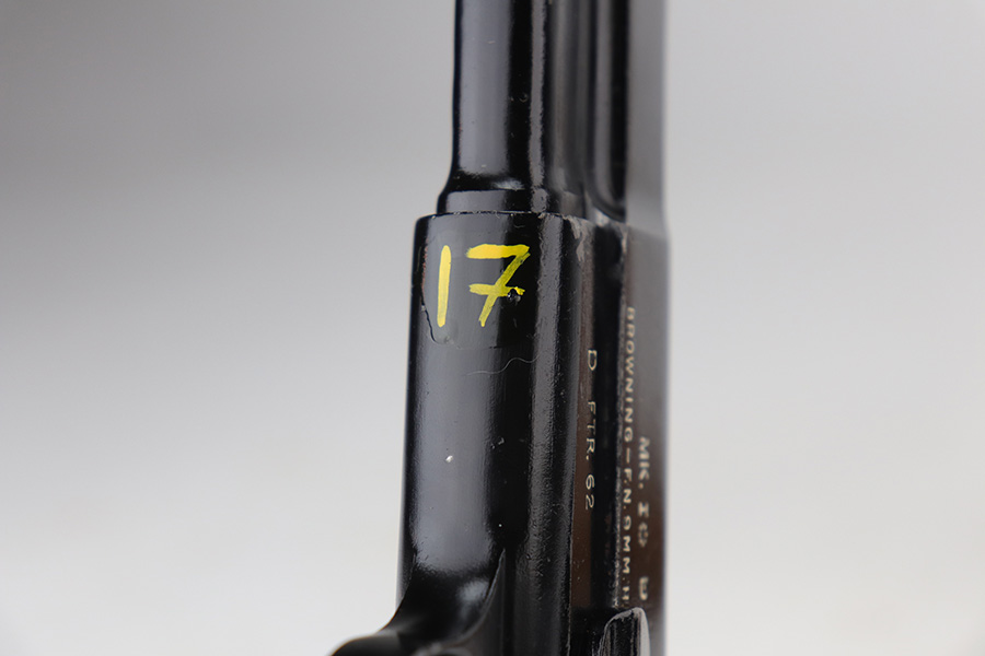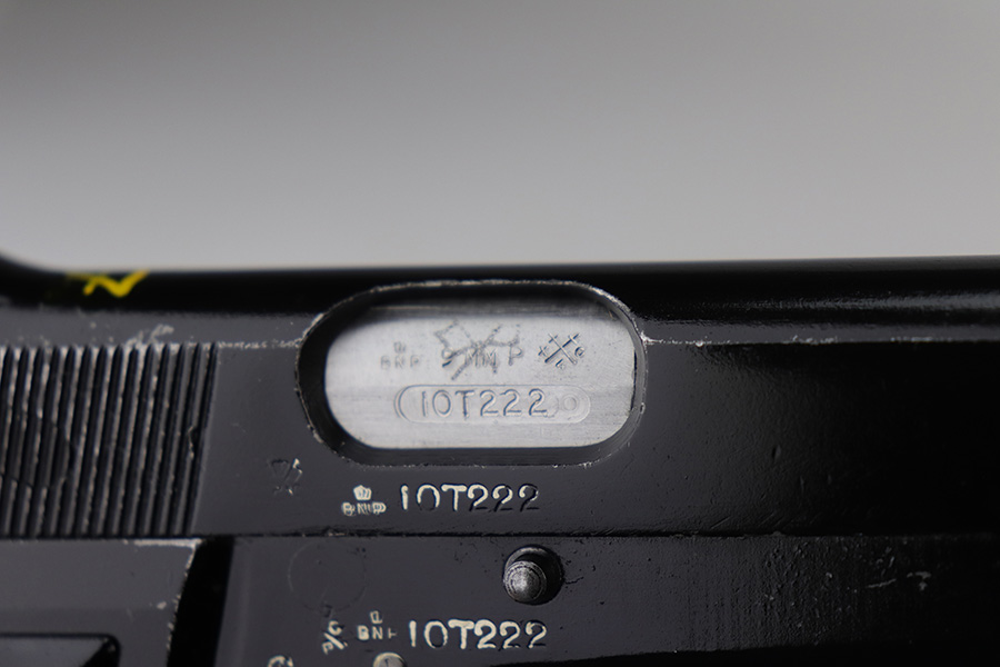 10/21/21 – This is a very nice and interesting example of a Canadian Inglis Hi Power that was manufactured in 1944. The British proofs on the right side of the gun indicate it was likely delivered to the British military. It is in the “10T” serial number range. This serial range is a curiosity. There is a span of about 500 guns where the factory accidentally duplicated “0T” serial numbers. To remedy this, they added a panographed “1” in front of the serials. The “1” usually looks a little different from the rest of the numbers. It is a little difficult to tell on this particular gun because the markings have been filled in with wax pencil. There are also “D FTR 62” markings on the left side of both the slide and frame. This indicates that the gun was reworked (FTR = Factory Thorough Repair) at RSAF Enfield in 1962. It was then that the barrel was likely replaced and numbered to match the rest of the gun. At the same time, it was probably given the additional British proof at the back left of the slide (typically seen with FTR guns). The number “17” is painted in yellow on the top of the slide and underside of the frame. After the British military considered these obsolete, many of them were stored and ended up in the US. So the yellow numbers are likely rack or storage numbers. The gun is all matching and has retained about 93% of its black painted finish. No import mark. There are small chips in the paint throughout, concentrated on the high edges, around the muzzle, and on the front strap. Comes with nice black bakelite grips and a proper “JI”-marked magazine. The bore is near-mint. No lanyard ring.