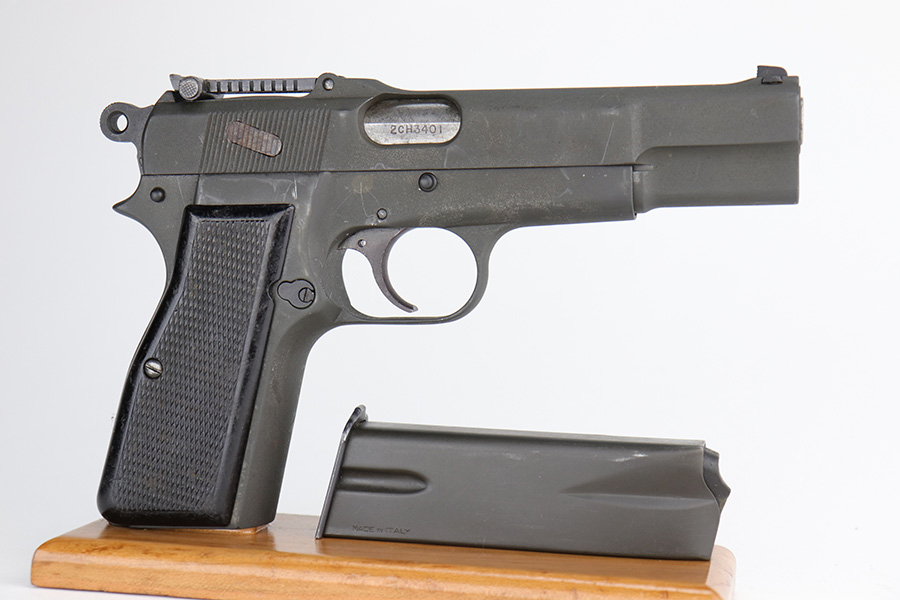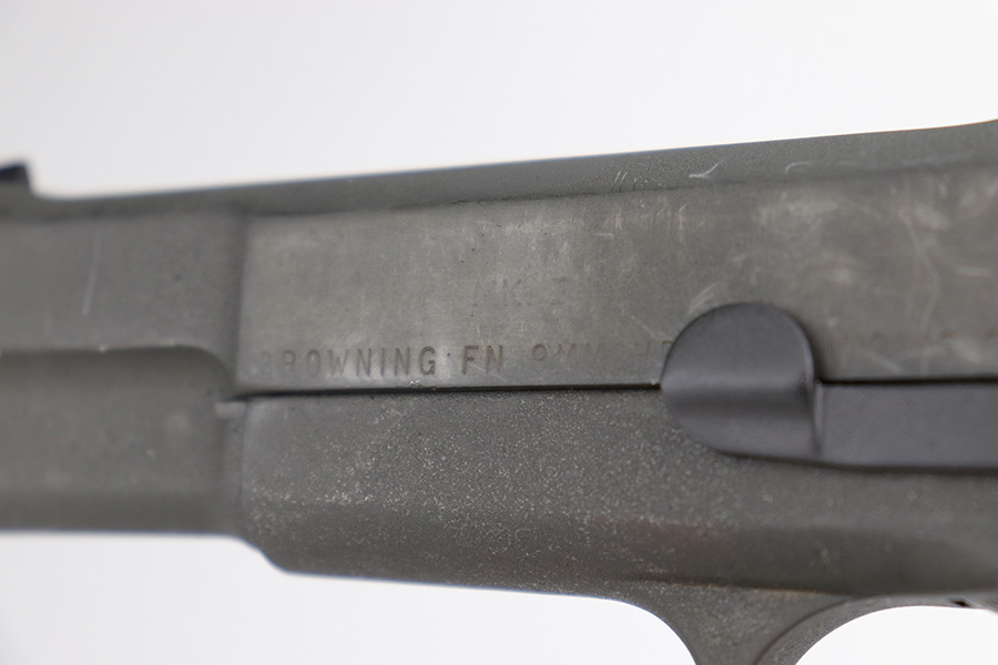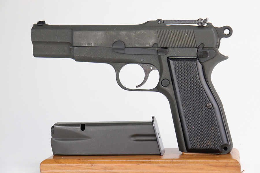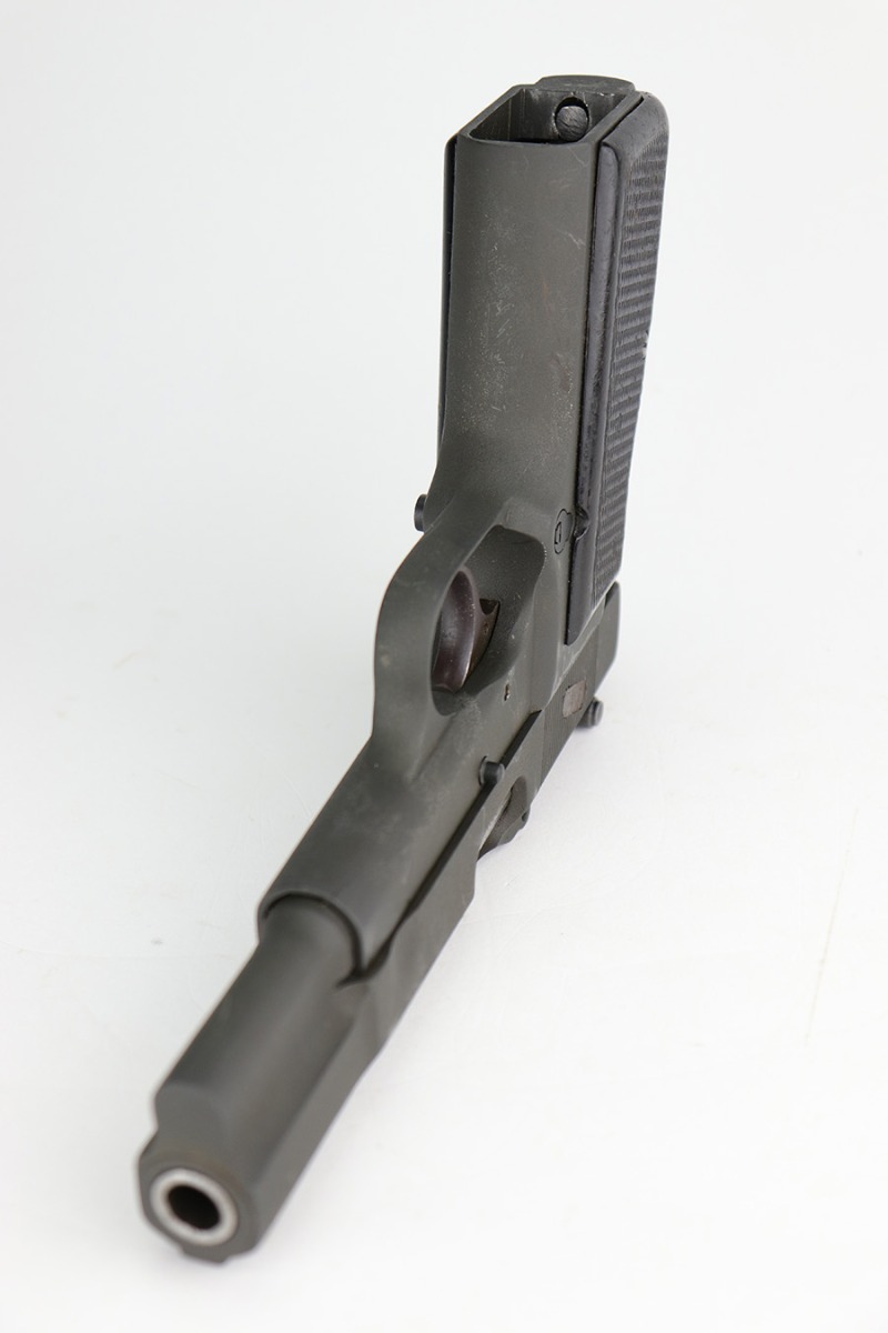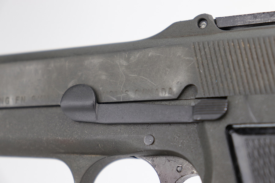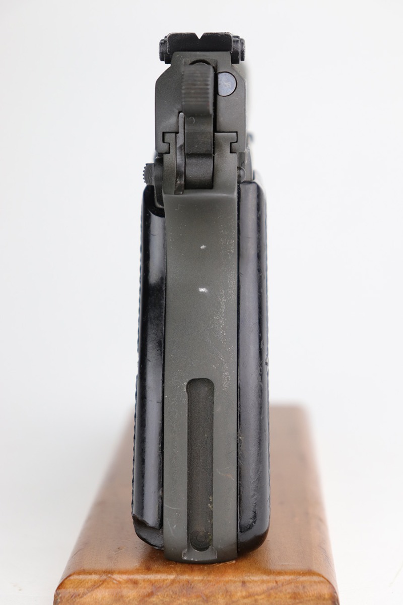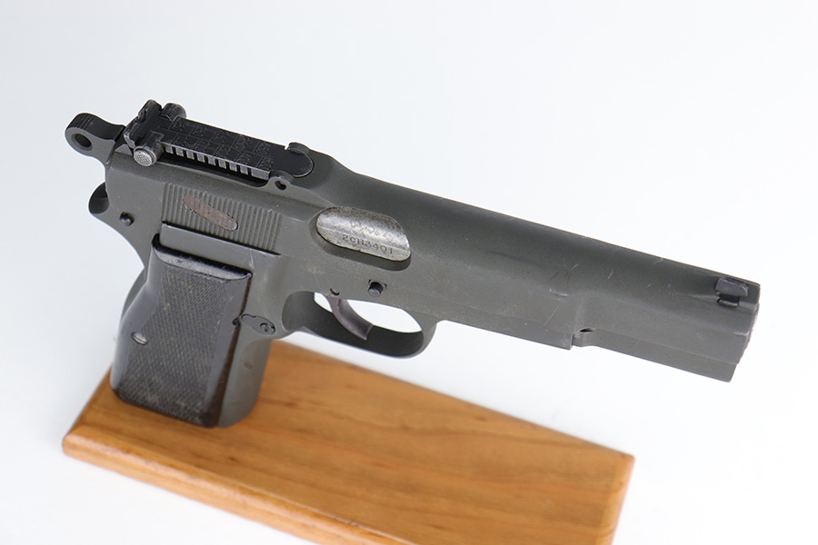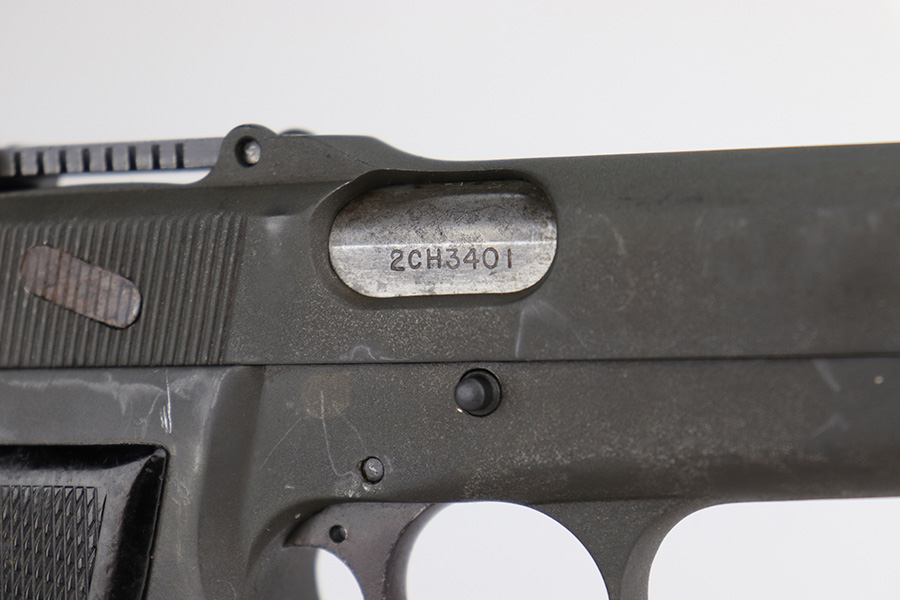12/17/22 – This is a very nice example of an Inglis Hi Power Mk 1* issued to the Canadian military during WW2. This particular gun has a fairly late serial number and was made in August of 1945. The entire gun has been arsenal refurbished and refinished with a dull parkerization. The serial numbers and military proofs on the right side of the slide and frame have been buffed out. It has retained virtually all of its new finish with some light surface scuffs here and there. Fitted with an excellent set of period-correct black bakelite grips and comes with one post-war magazine. Very nice bore with great rifling. The lanyard ring on the frame is missing.