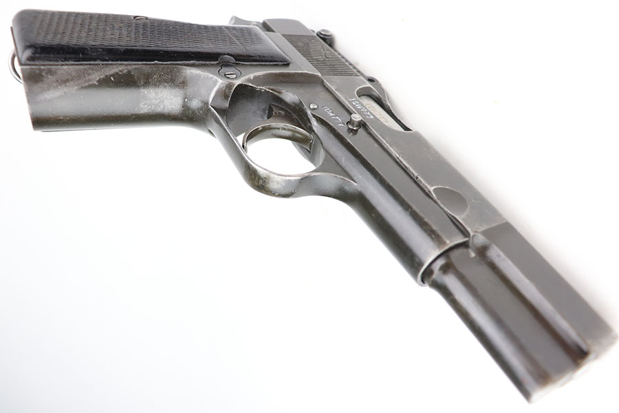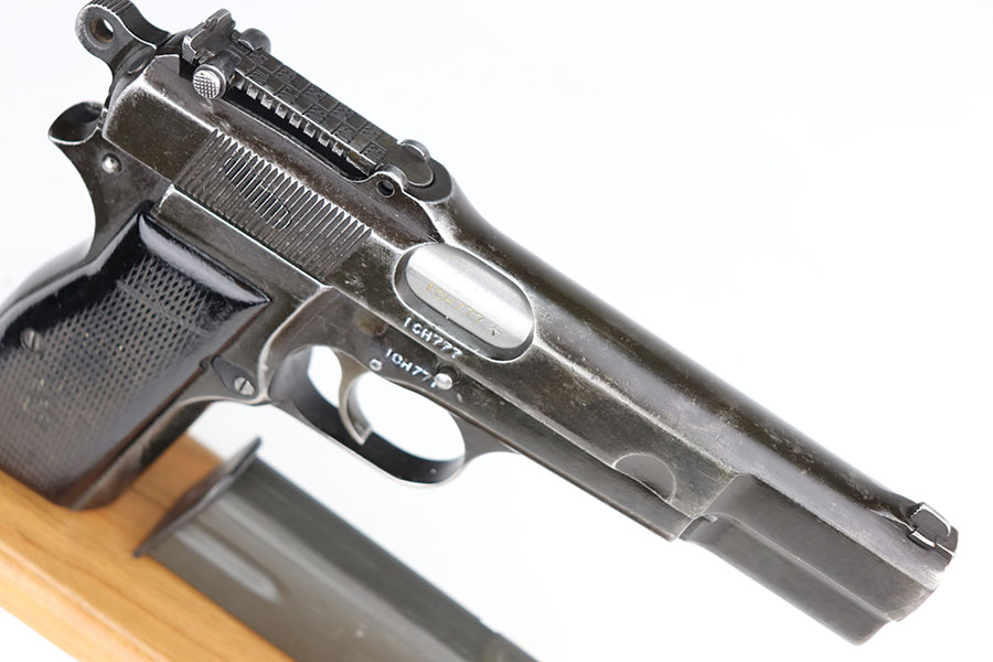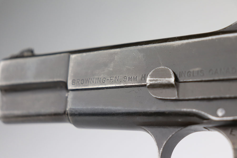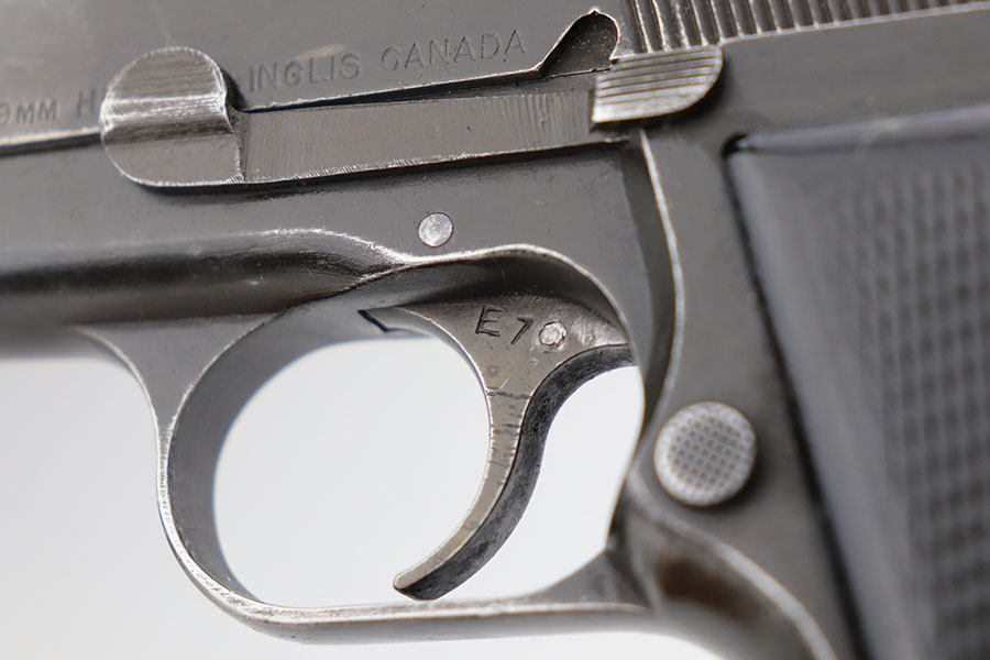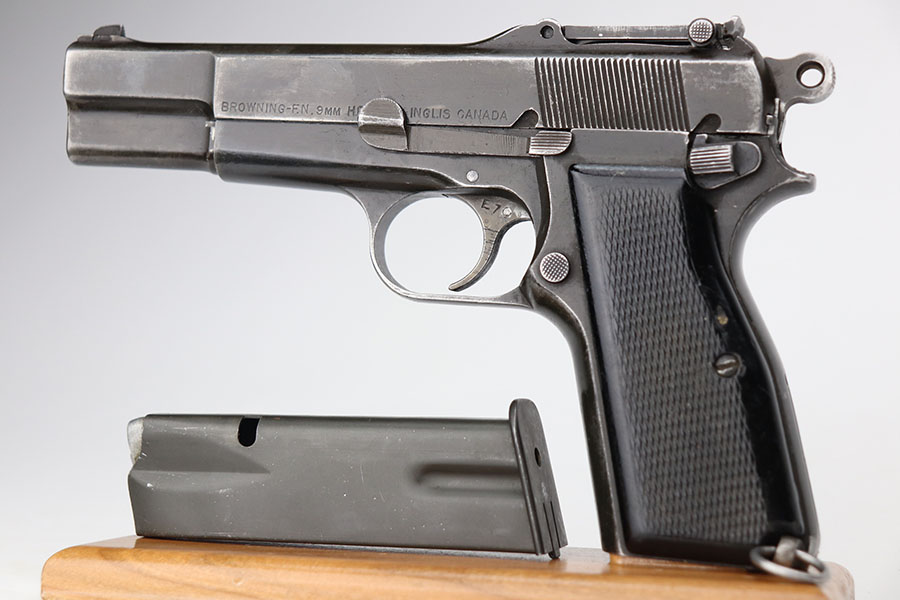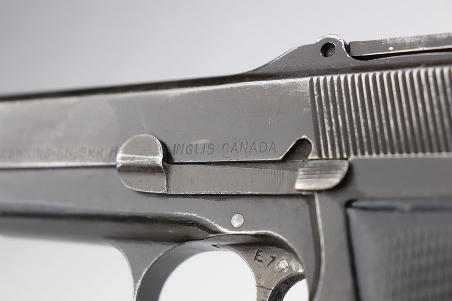 2/10/21 – This is a nice example of an Inglis High Power issued to the Canadian military in 1944. It is all matching and has no maple leaf insignia on the front strap. It has retained about 80% of its blued finish. There is minor wear around the muzzle and high edges of the slide. Spotty wear on both straps. There are areas of spotty discoloration throughout. Excellent black bakelite grips. It comes with a proper Inglis magazine. Excellent bore – shiny with strong rifling.