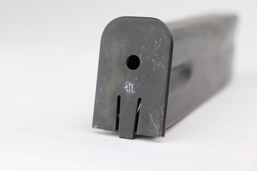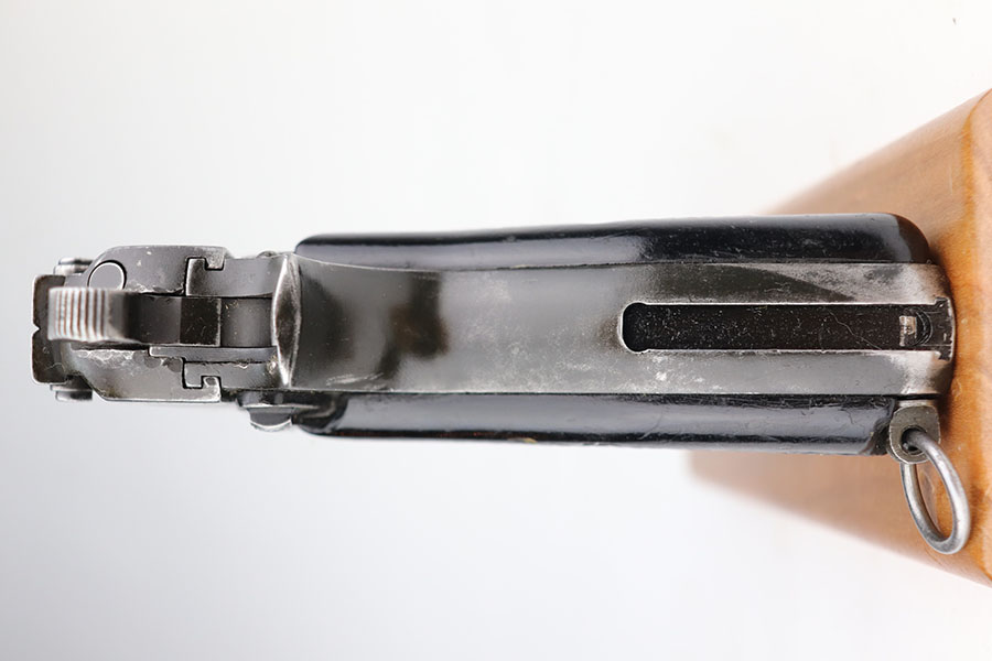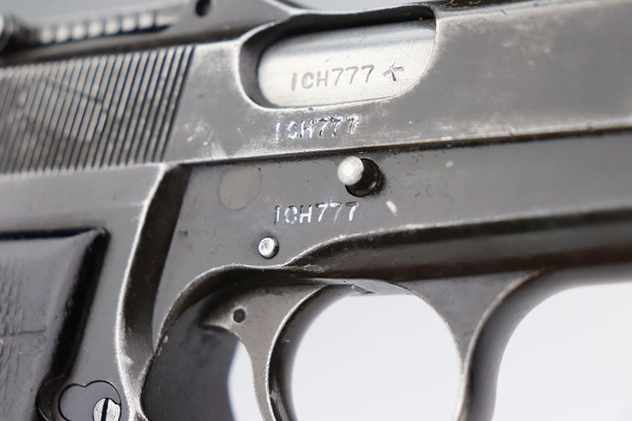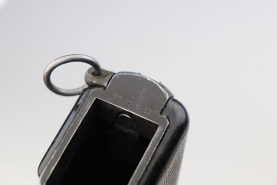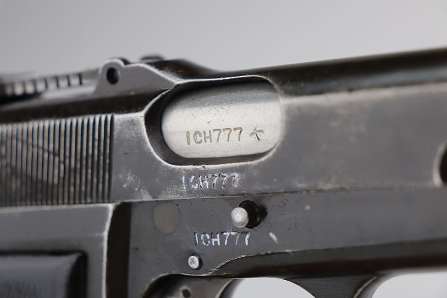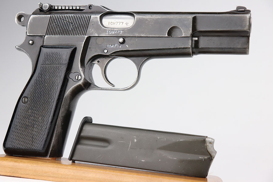 2/10/21 – This is a nice example of an Inglis High Power issued to the Canadian military in 1944. It is all matching and has no maple leaf insignia on the front strap. It has retained about 80% of its blued finish. There is minor wear around the muzzle and high edges of the slide. Spotty wear on both straps. There are areas of spotty discoloration throughout. Excellent black bakelite grips. It comes with a proper Inglis magazine. Excellent bore – shiny with strong rifling.