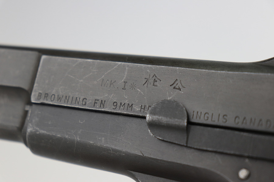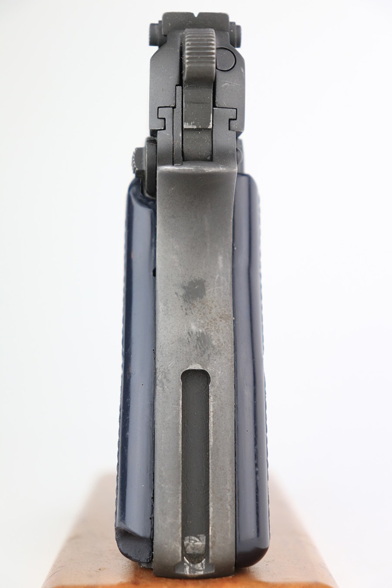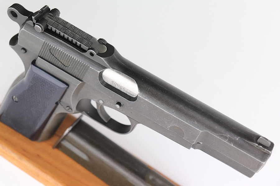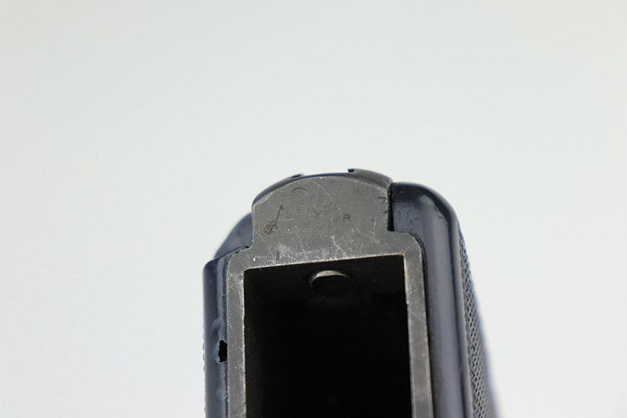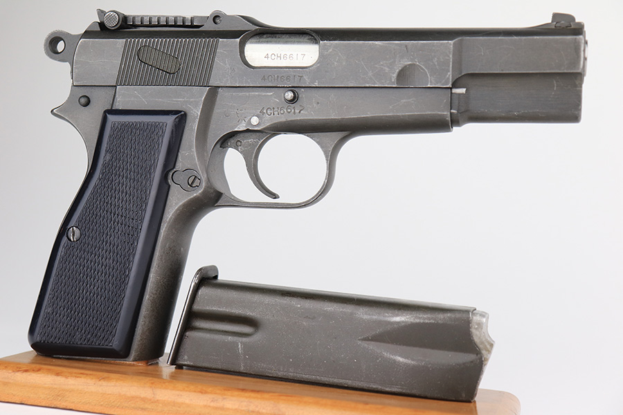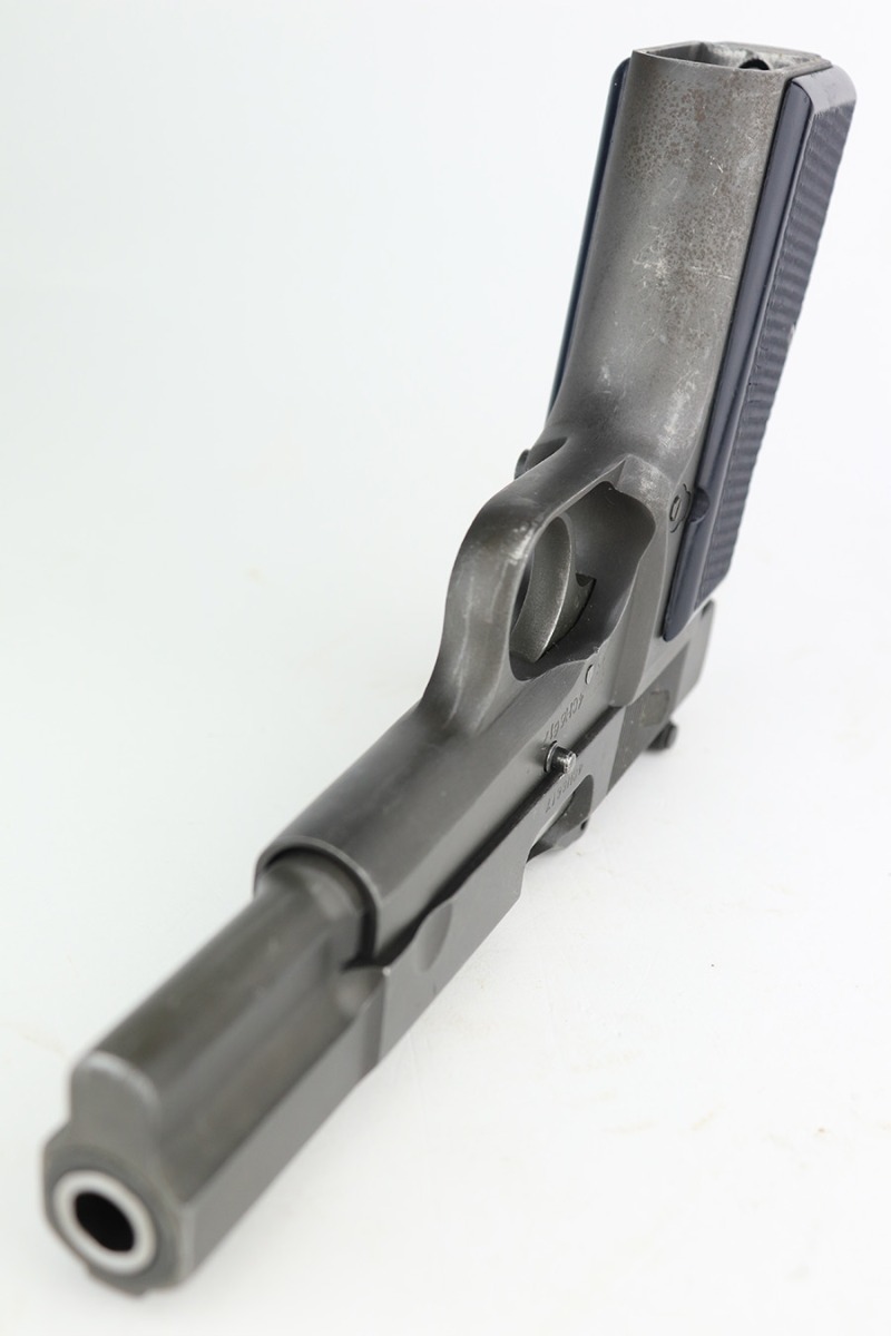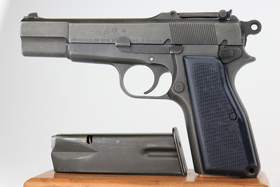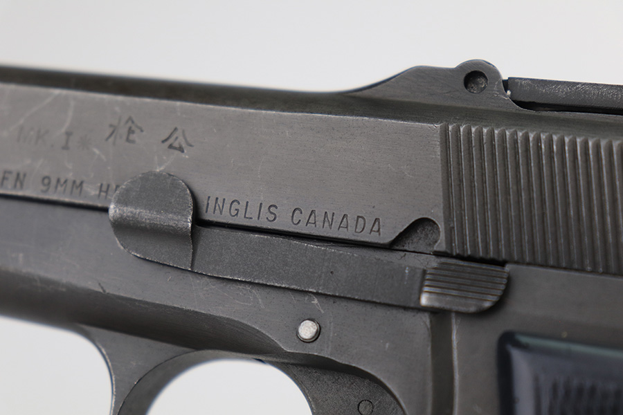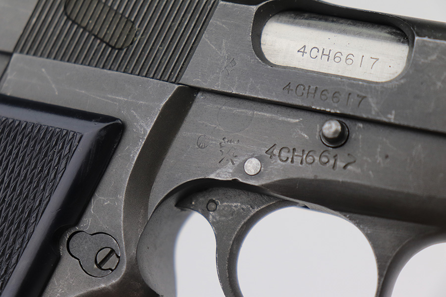 10/9/23 – This is a nice Canadian military Inglis High Power from 1944. These were produced with ‘CH’ prefix in the serial as they were part of the Chinese contract order, and this one also has the Chinese slide legend. It has matching numbers throughout with parkerized finish. The pistol has a generalized thin finish in some areas, mainly the grips straps but it makes this one hard to rate. Mint bore. Nice grips with no cracks. Original mag with ‘JI’ marking. Import mark on bottom of frame.