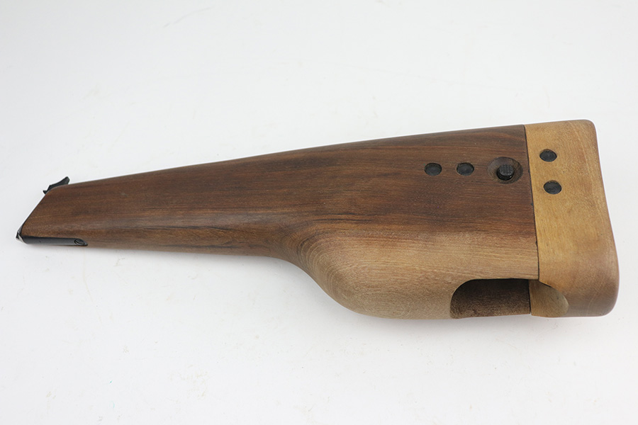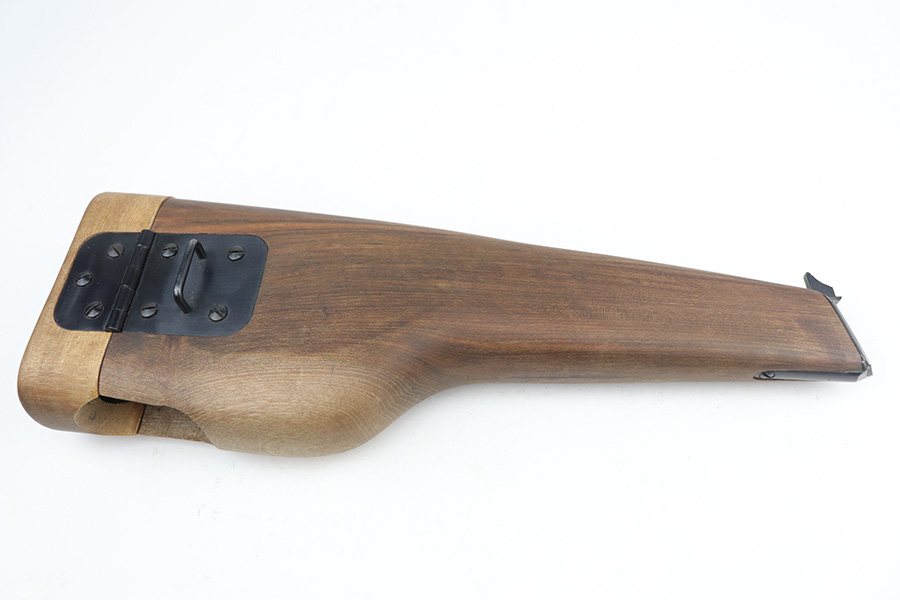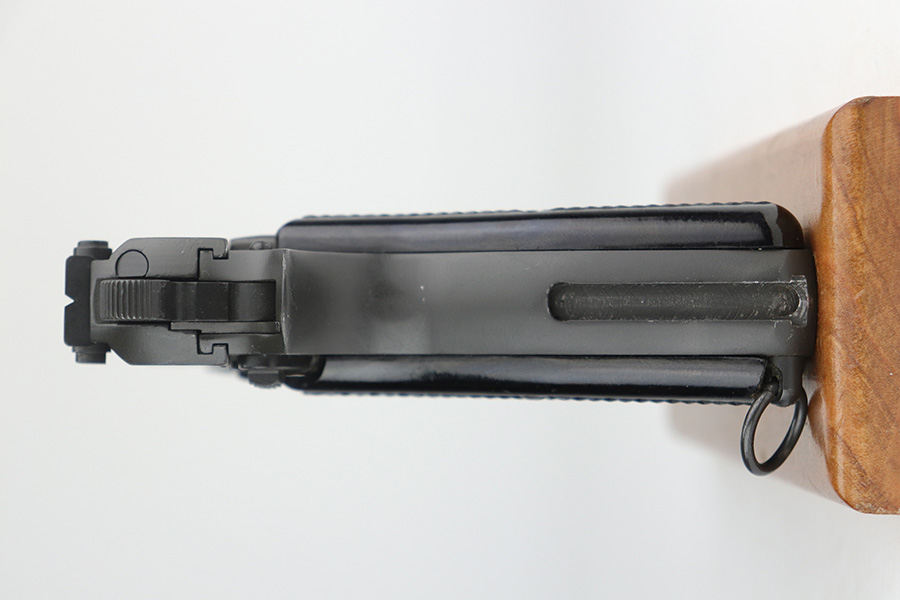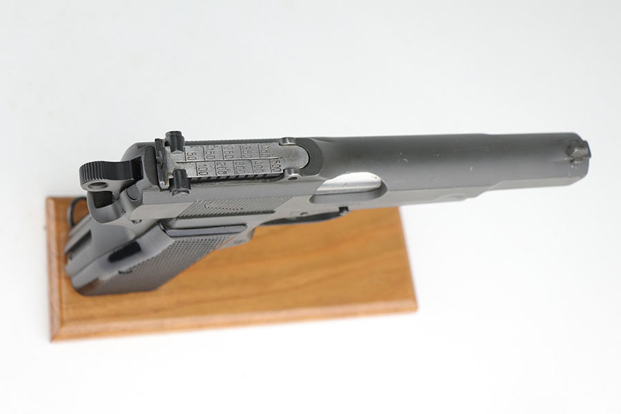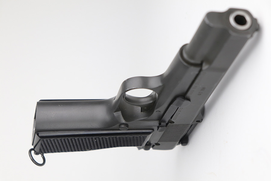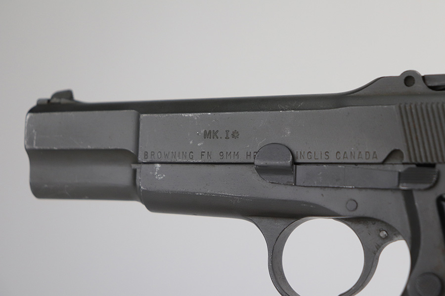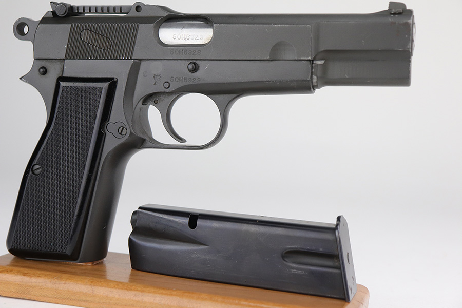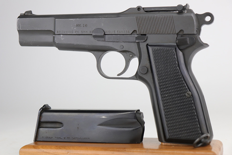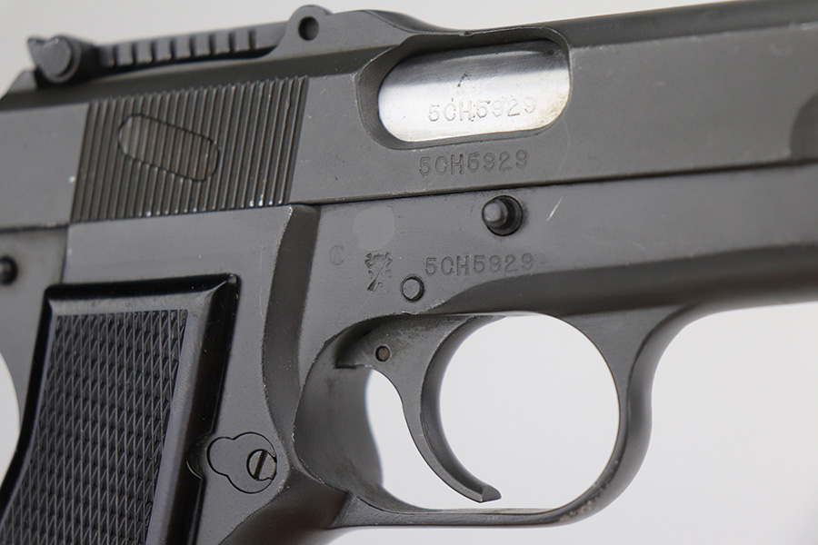 11/4/21 – This is a minty Canadian Inglis High Power that was produced near the end of World War II. It has about 98% of the parkerized finish remaining, with just a little high edge wear and some freckling toward the muzzle end of the slide. Sharp markings with matching serial numbers throughout. Minty black plastic grips with no handling wear. Bore is shiny with strong rifling but a little bit of frost throughout. Comes with canvas sling and unmarked after-market stock in mint condition. Comes with an original and correct magazine (JI marked) which is not in the photos, as well as an Italian after-market magazine that IS shown in the photos.