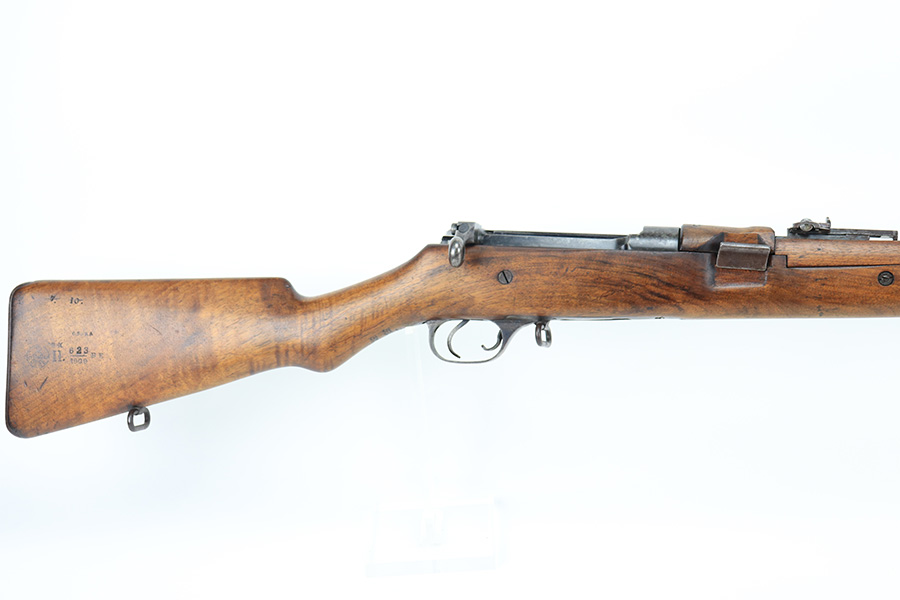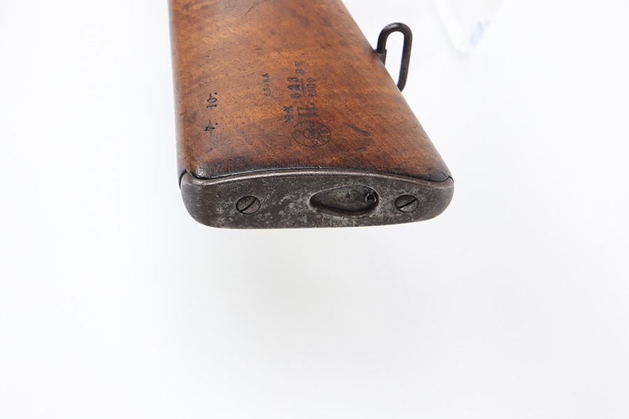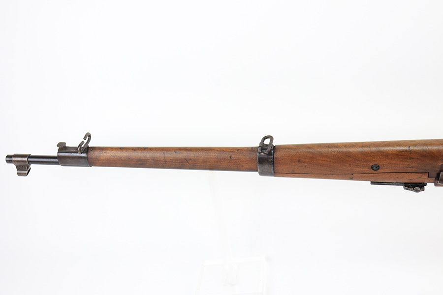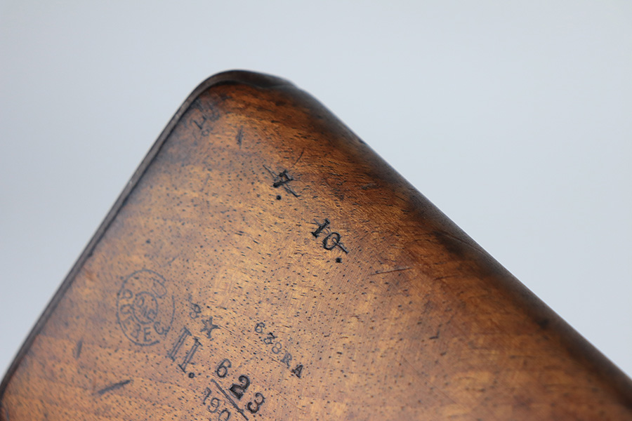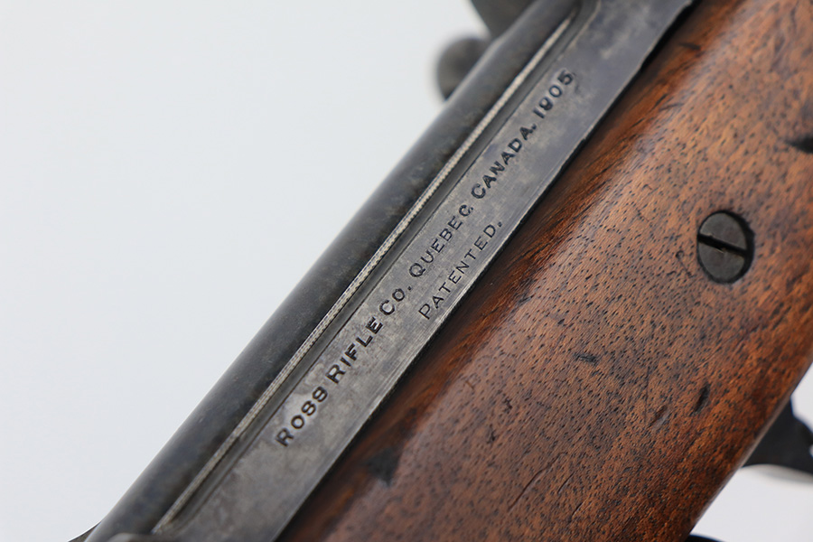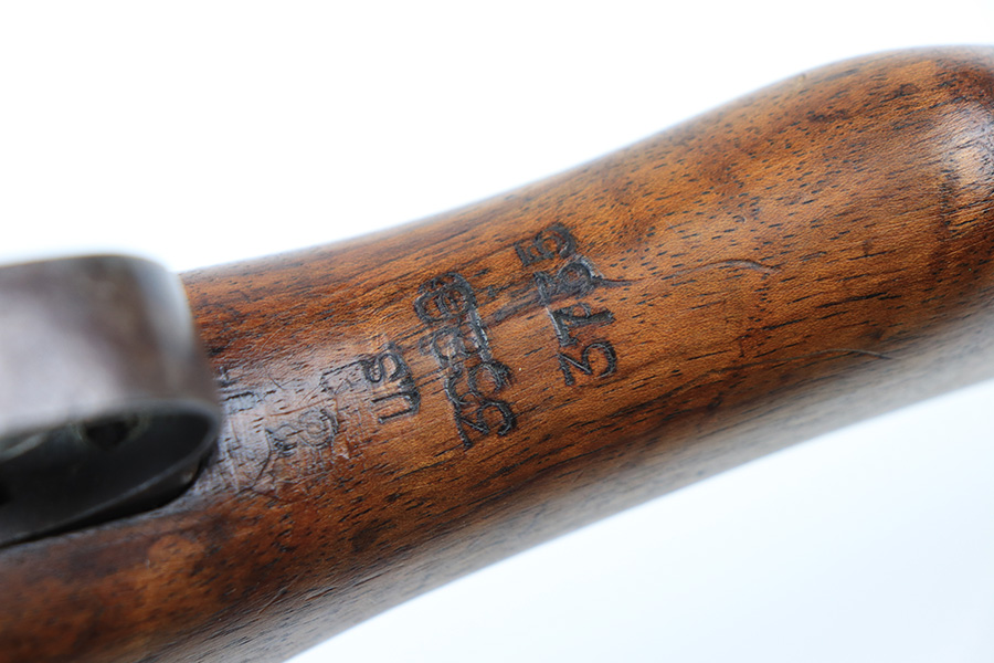 1/19/22 – This is an uncommon and interesting Ross Mk.II rifle, also referred to as the 1905. From Wikipedia: “The Ross rifle is a straight-pull bolt action .303 inch-calibre rifle that was produced in Canada from 1903 until 1918. The Ross Mk.II (or “model 1905”) rifle was highly successful in target shooting before World War I, but the close chamber tolerances, lack of primary extraction and length made the Mk.III (or “1910”) Ross rifle unsuitable for the conditions of trench warfare, exacerbated by the often poor quality ammunition issued. By 1916, the rifle had been withdrawn from front line service but continued to be used by many snipers of the Canadian Expeditionary Force until the end of the war due to its exceptional accuracy.” This is the first example we’ve offered so we don’t know much about these, but finish appears original with some thinning on the receiver and front bands, and it has some splotchy areas on the receiver, as well. There are clear proofs and cartouches on the right side of the stock but we aren’t certain their meaning. Bore has strong rifling but frost throughout. Stock is in very good condition with minor handling wear and a couple of scratches on the left side.