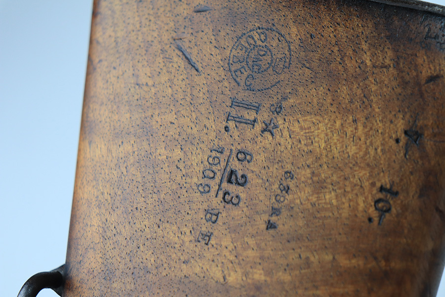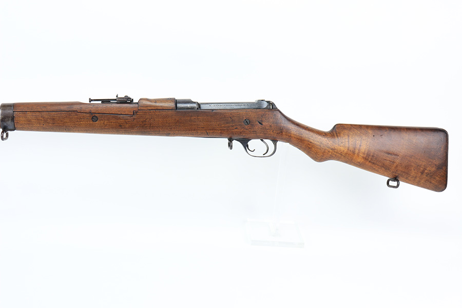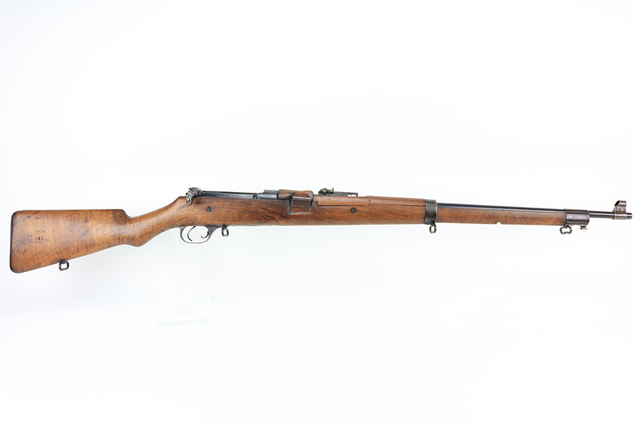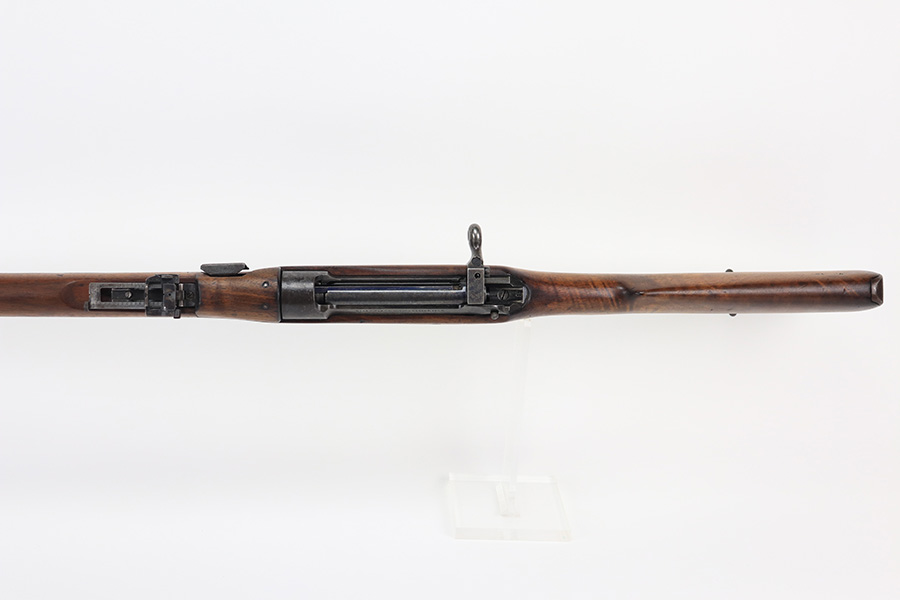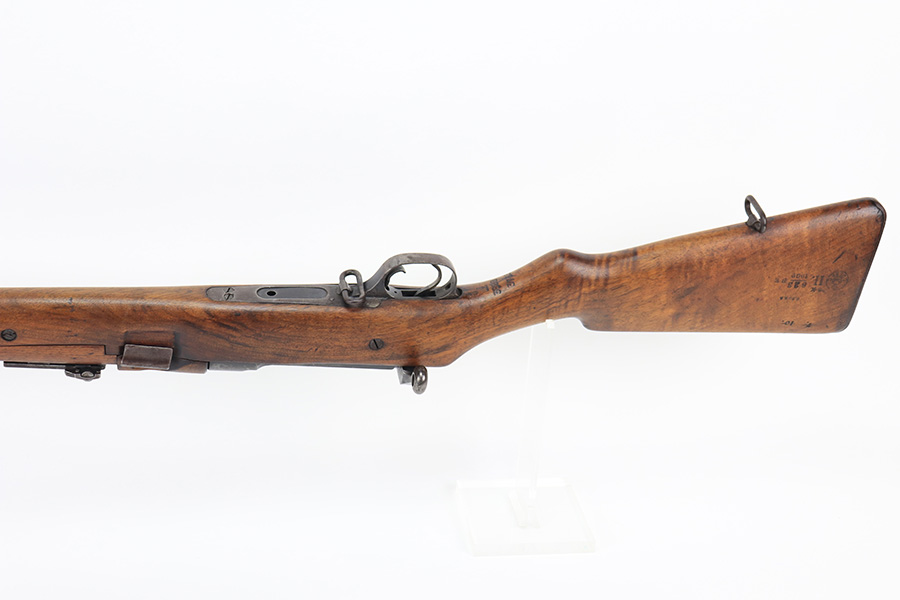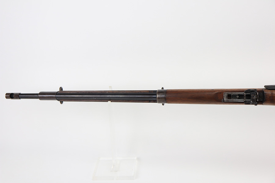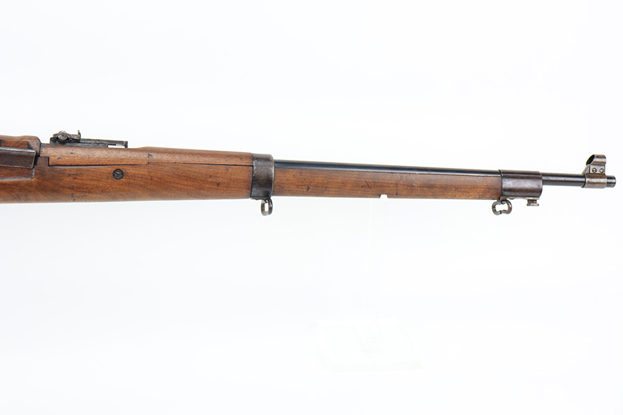 1/19/22 – This is an uncommon and interesting Ross Mk.II rifle, also referred to as the 1905. From Wikipedia: “The Ross rifle is a straight-pull bolt action .303 inch-calibre rifle that was produced in Canada from 1903 until 1918. The Ross Mk.II (or “model 1905”) rifle was highly successful in target shooting before World War I, but the close chamber tolerances, lack of primary extraction and length made the Mk.III (or “1910”) Ross rifle unsuitable for the conditions of trench warfare, exacerbated by the often poor quality ammunition issued. By 1916, the rifle had been withdrawn from front line service but continued to be used by many snipers of the Canadian Expeditionary Force until the end of the war due to its exceptional accuracy.” This is the first example we’ve offered so we don’t know much about these, but finish appears original with some thinning on the receiver and front bands, and it has some splotchy areas on the receiver, as well. There are clear proofs and cartouches on the right side of the stock but we aren’t certain their meaning. Bore has strong rifling but frost throughout. Stock is in very good condition with minor handling wear and a couple of scratches on the left side.