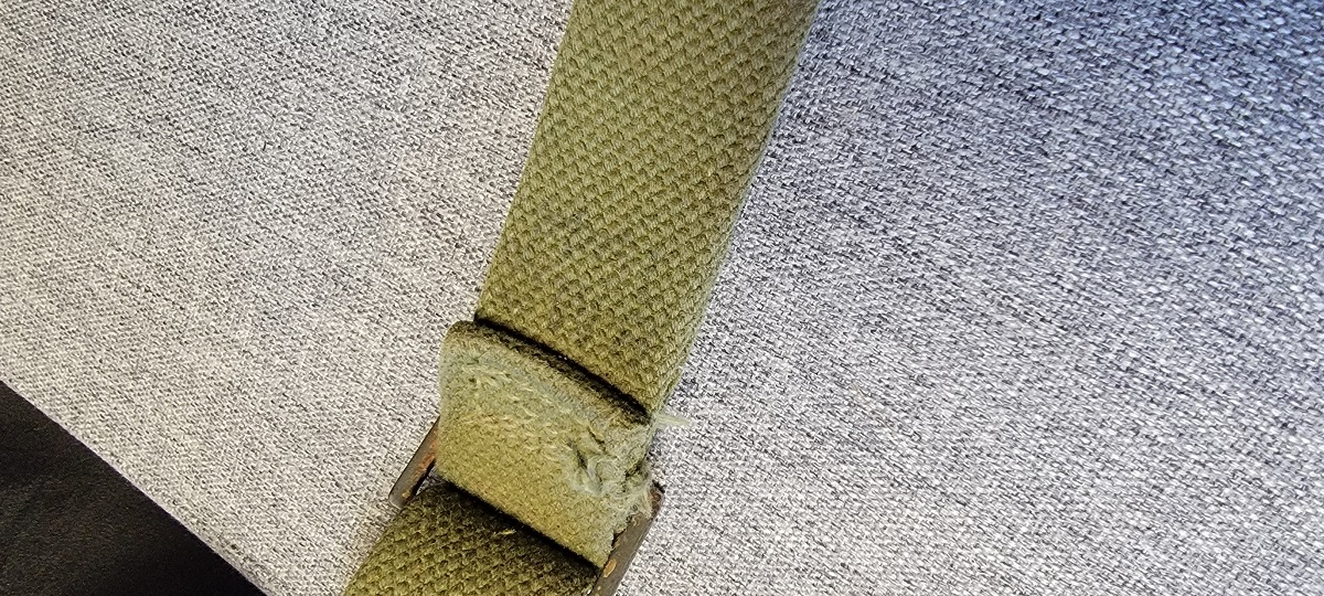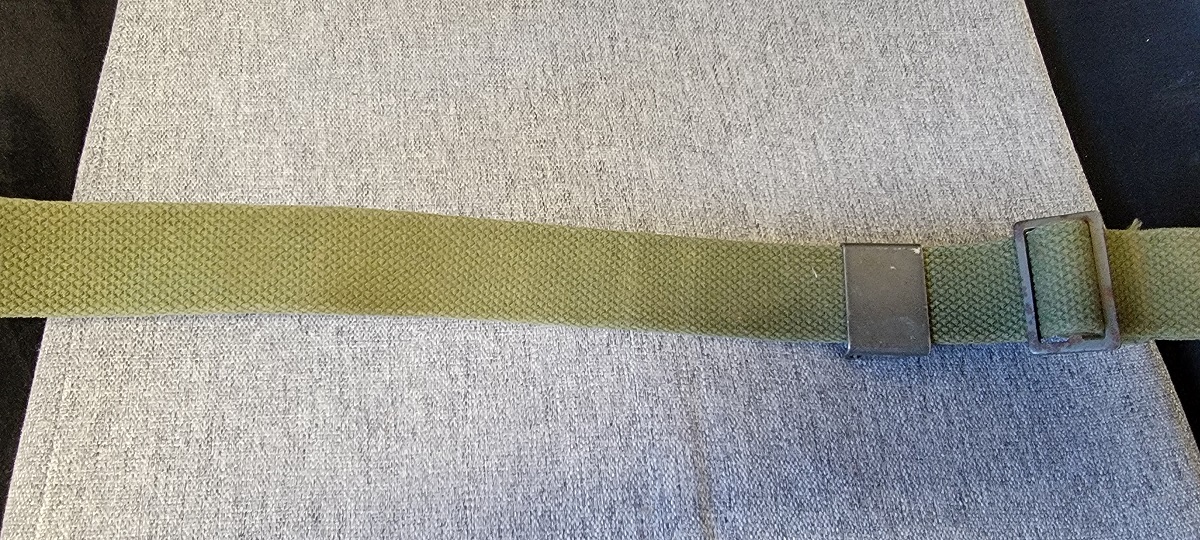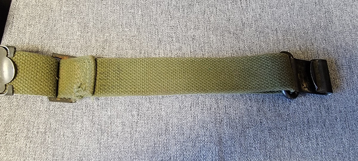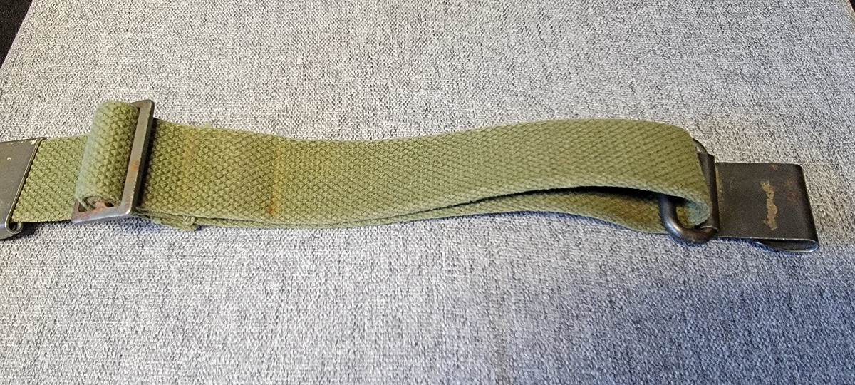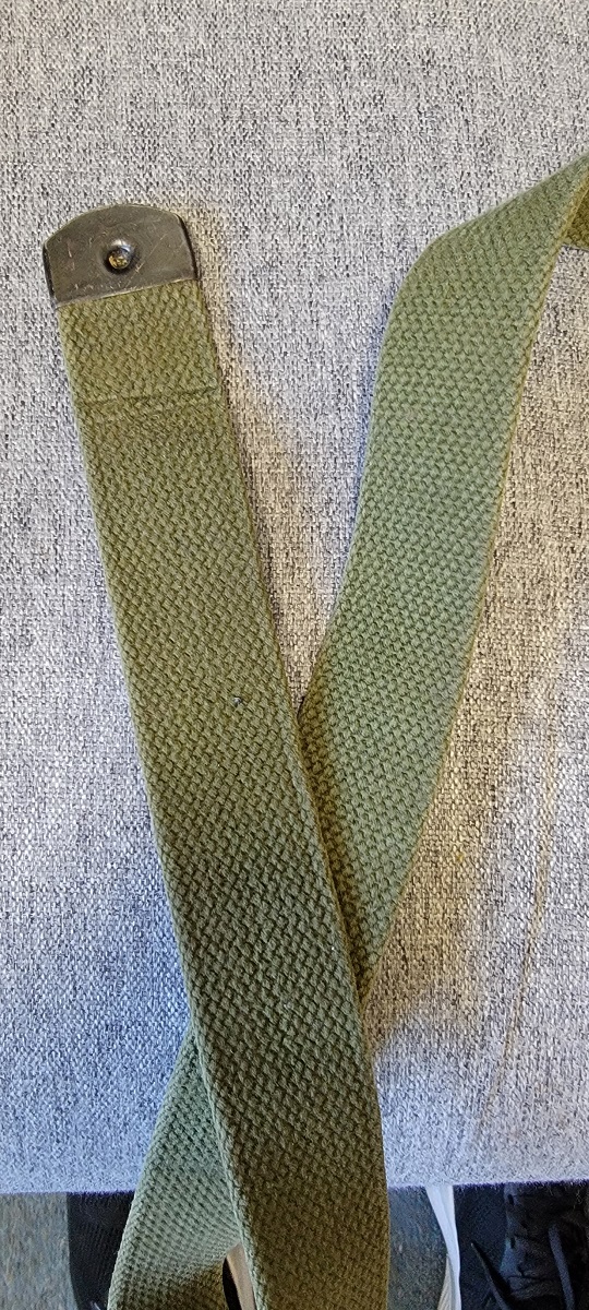 4/10/23 – This is an excellent condition canvas rifle sling for a M1 Garand. Likely WW2 era production although there are no markings or stamps, except for a small ink stamp on the canvas that’s too faint to decipher. The canvas is strong and clean, and there’s some mild patina and surface wear on the metal fittings. Note that the sling shown in the first photo is not the sling being offered.