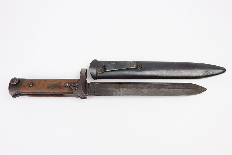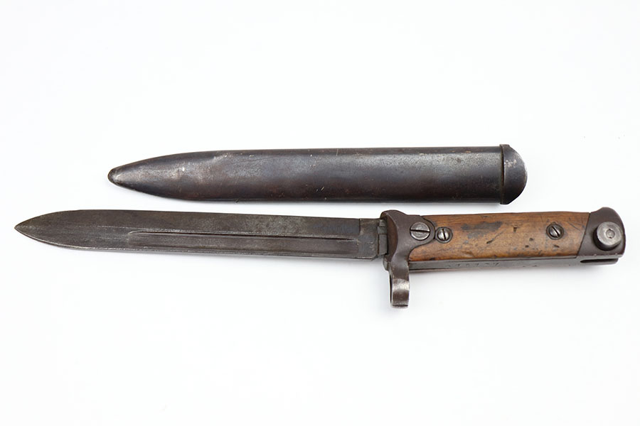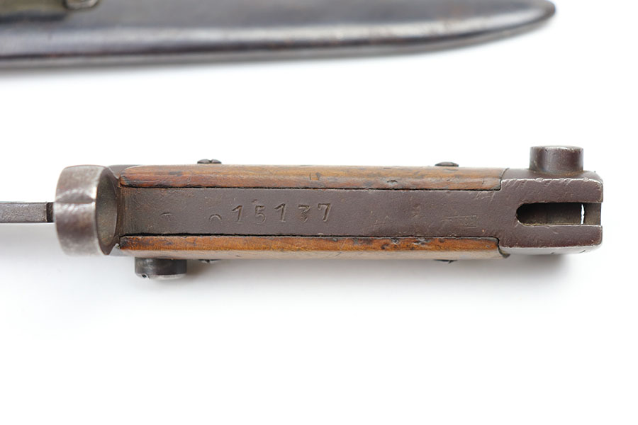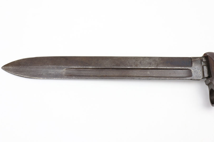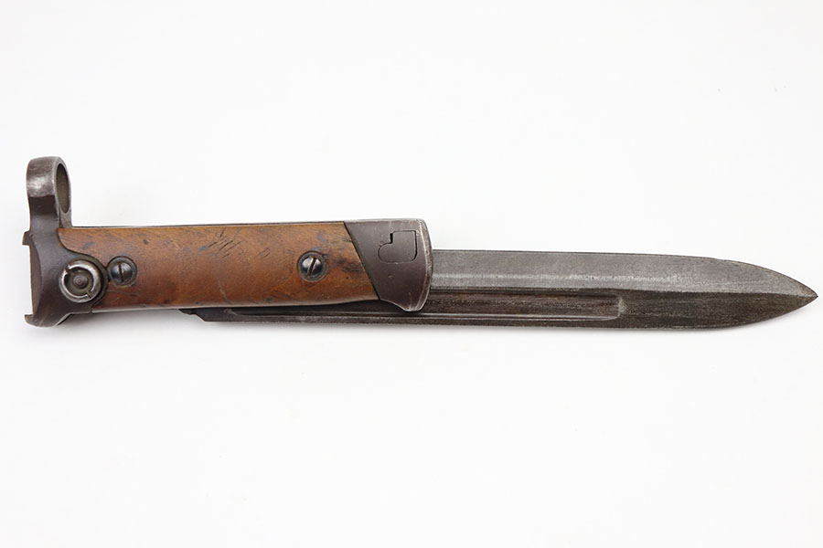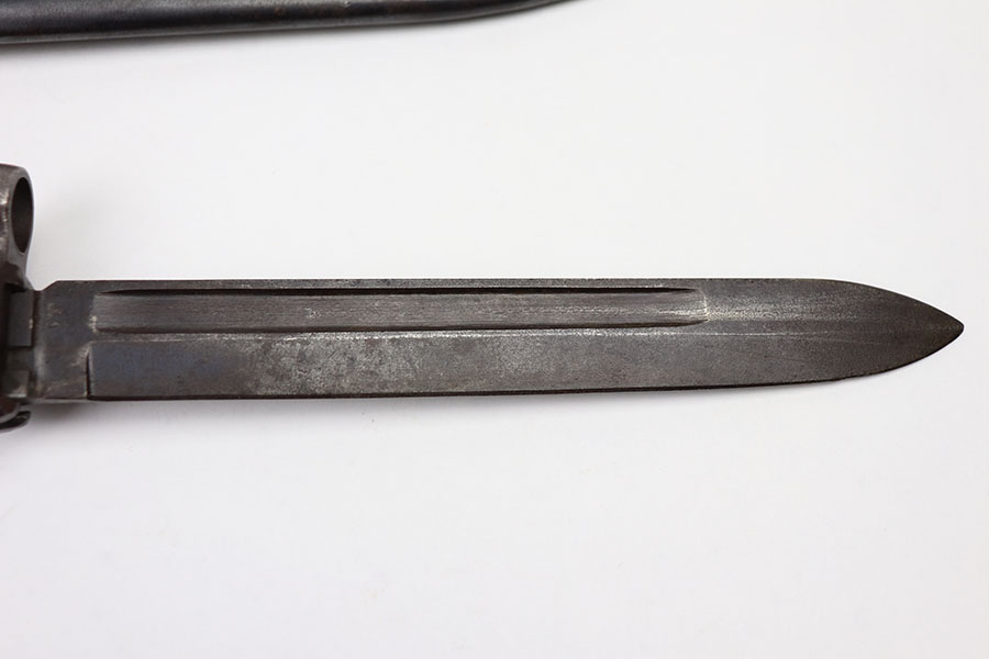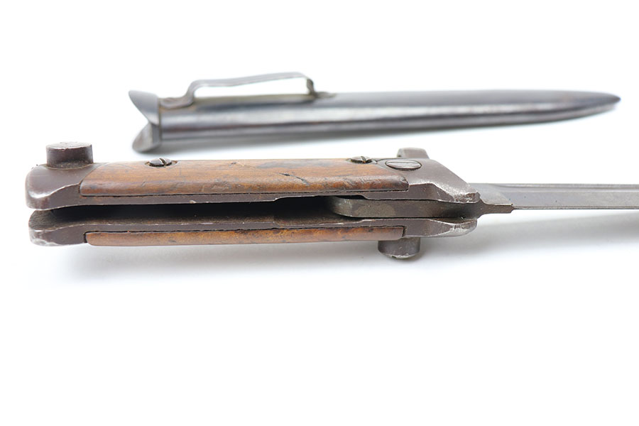 1/3/22 – This is an original WW2 era Italian Carcano folding bayonet. The bayonet folds properly without issue and smooth action. When the blade is “locked” in the extended position, the blade does have some minor “play” or jiggles slightly. Comes with an original scabbard, as shown. The blade has typical patina / mild discoloration throughout, along with some finish loss. No signs of sharpening. The handle has a few imperfections, but no major cracks or chips. The scabbard has no dents, but there is patina throughout the blued finish.
