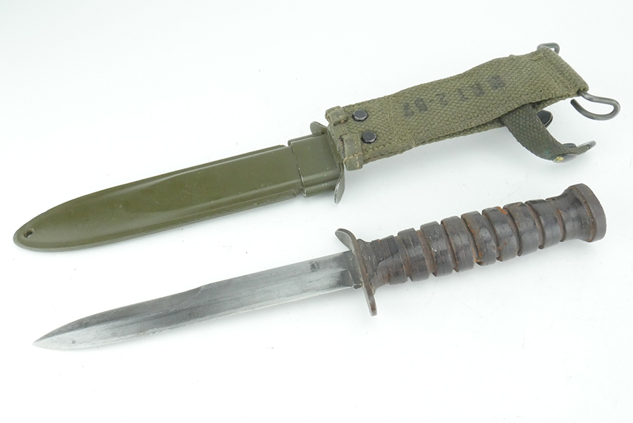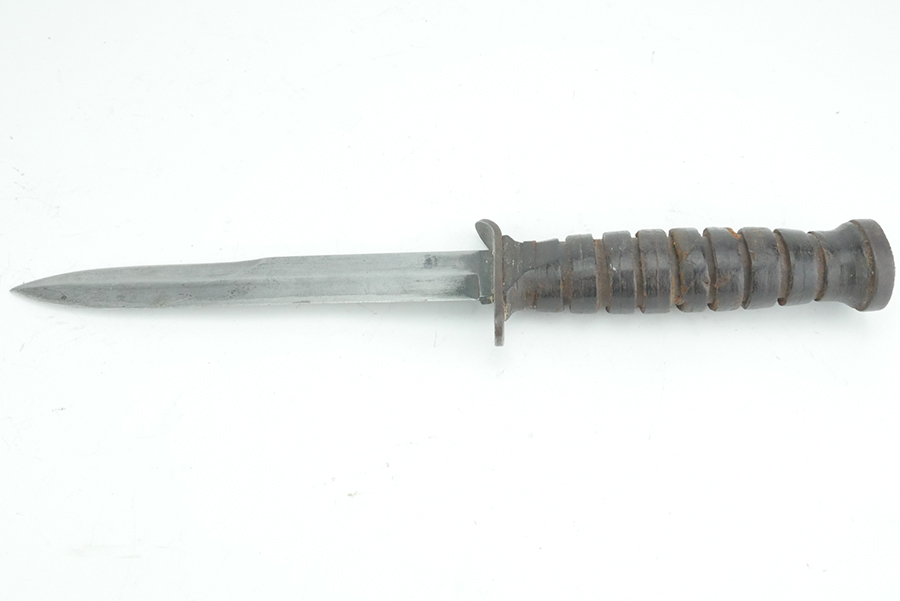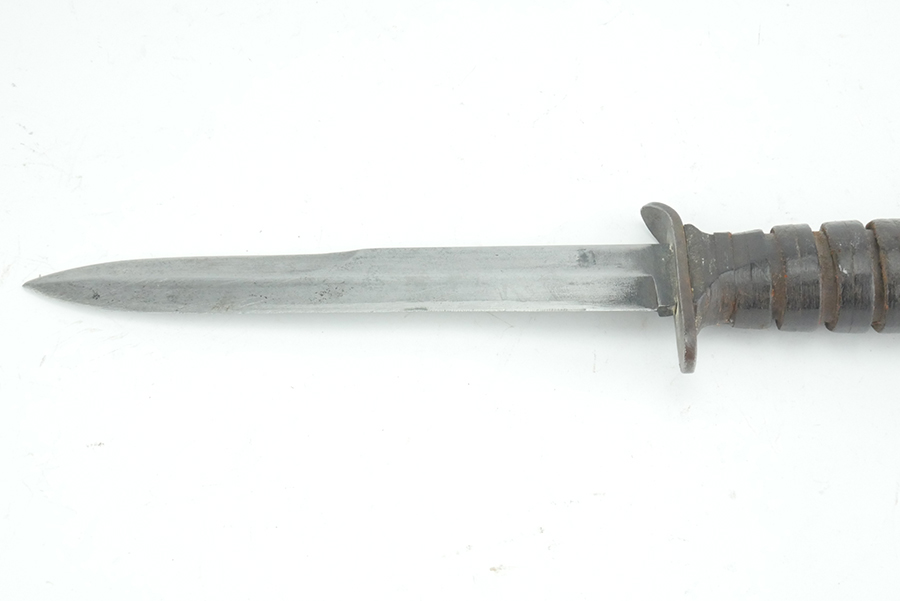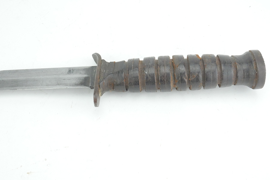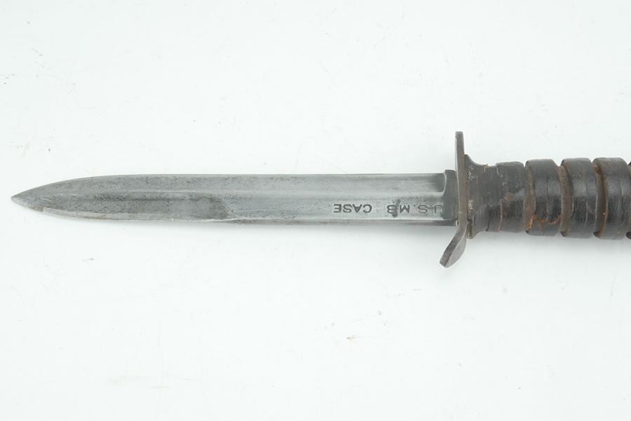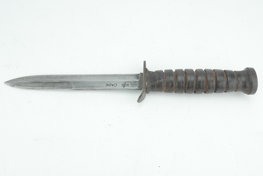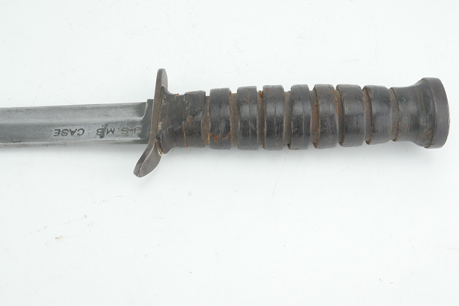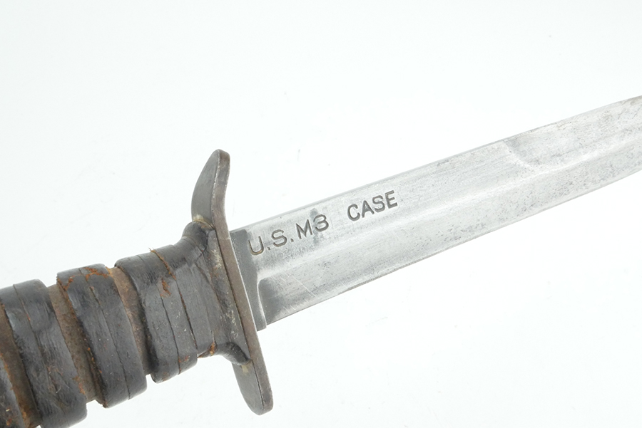 8/26/24 – This is an original US M3 Fighting knife by Case with a period-correct M8 Scabbard. The blade retains little of it’s original finish, and was sharpened. The blade is maker stamped by Case. The grip still maintains all of its original leather with none of the disks being loose. The scabbard has some typical signs of aging but no major issues.