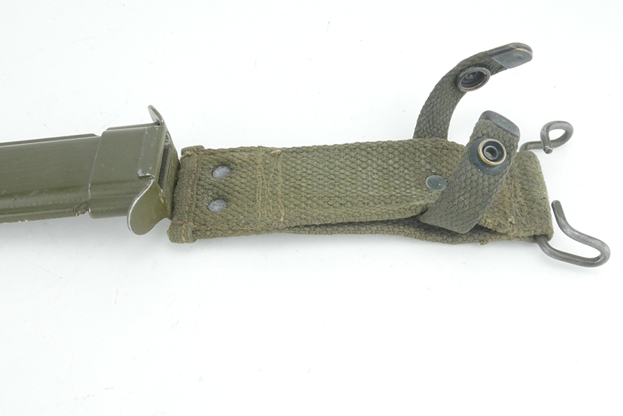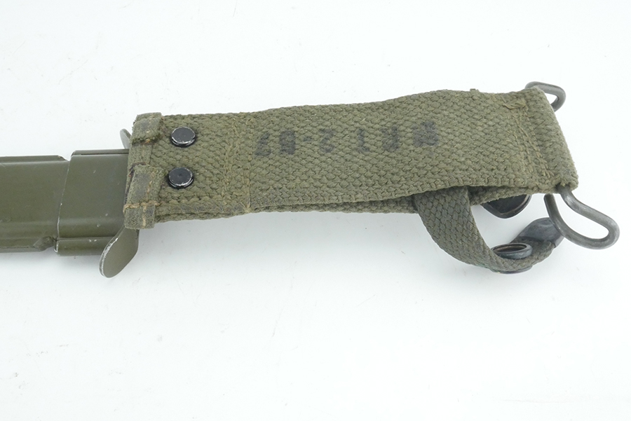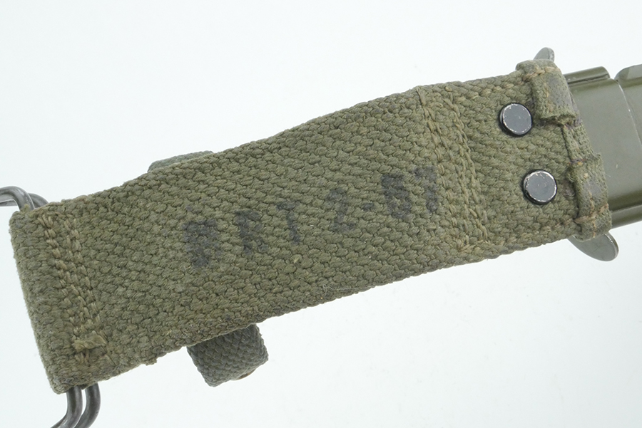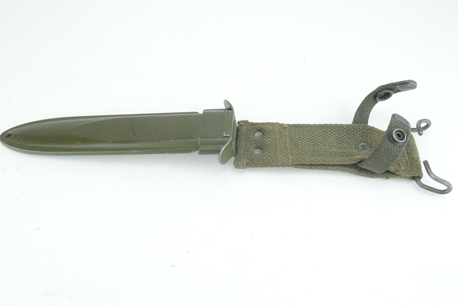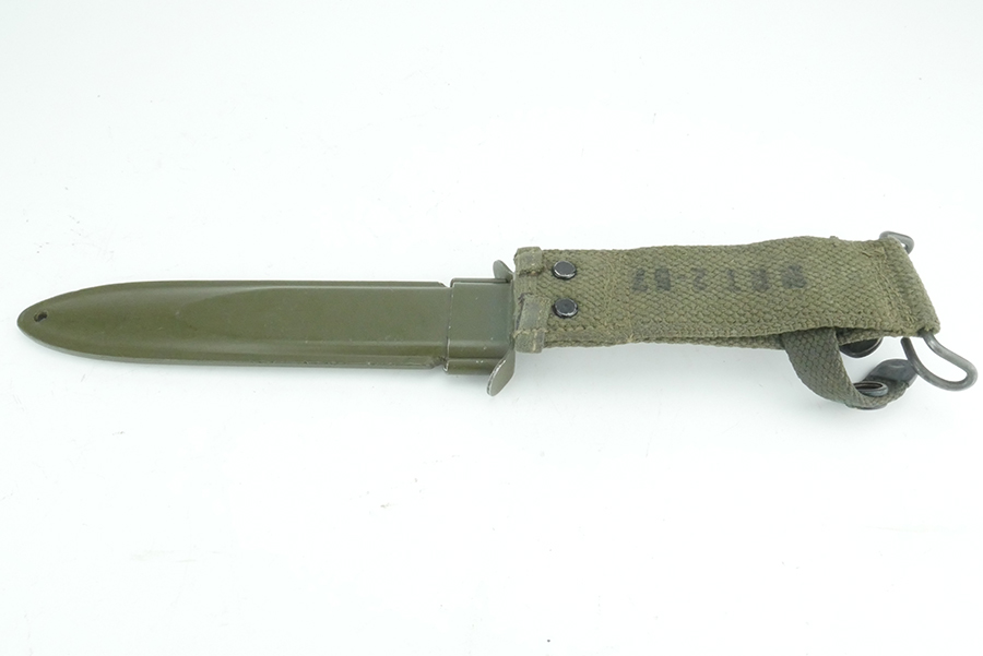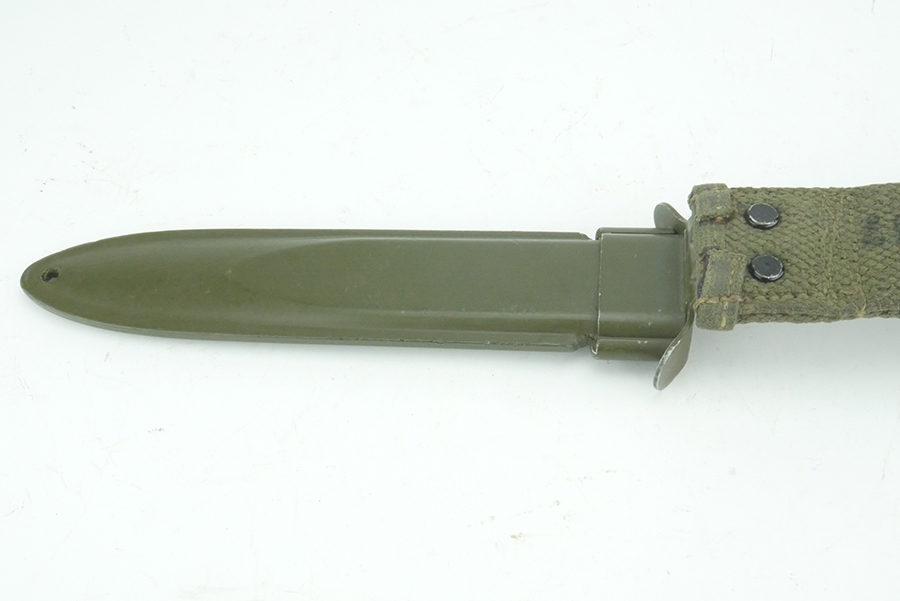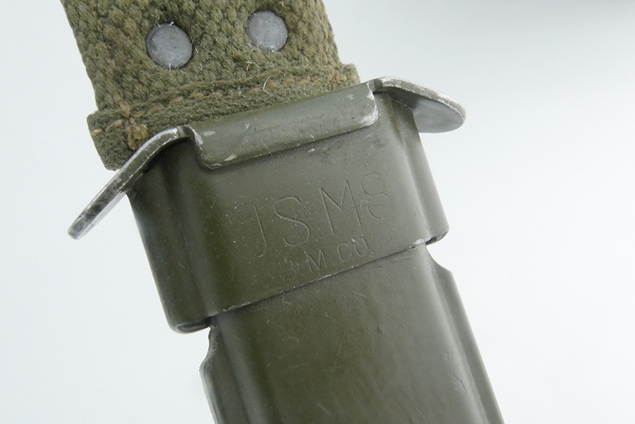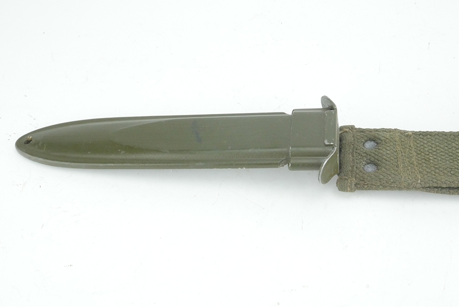 8/26/24 – This is an original US M3 Fighting knife by Case with a period-correct M8 Scabbard. The blade retains little of it’s original finish, and was sharpened. The blade is maker stamped by Case. The grip still maintains all of its original leather with none of the disks being loose. The scabbard has some typical signs of aging but no major issues.