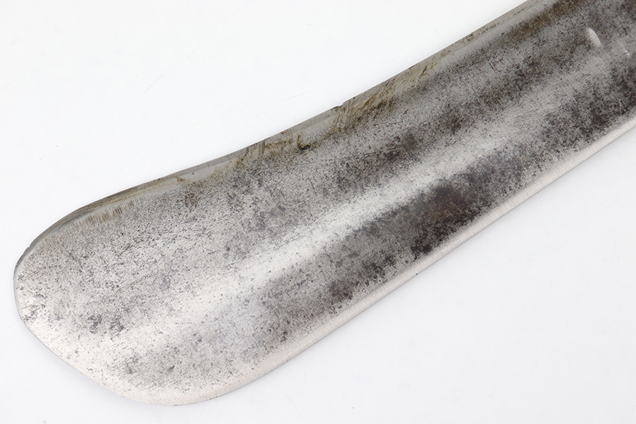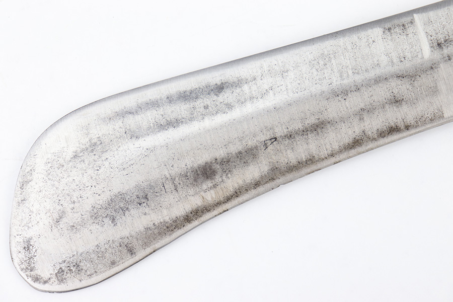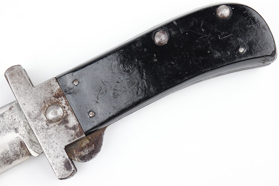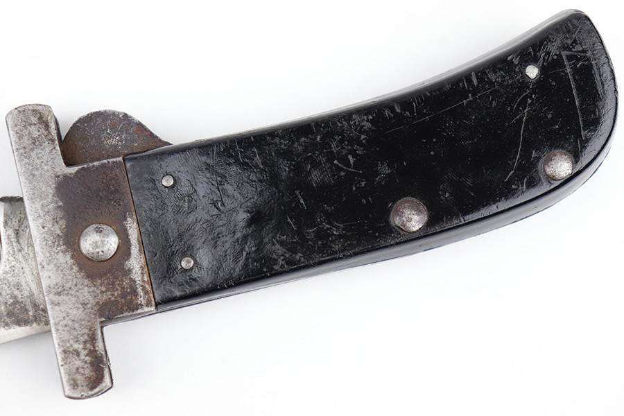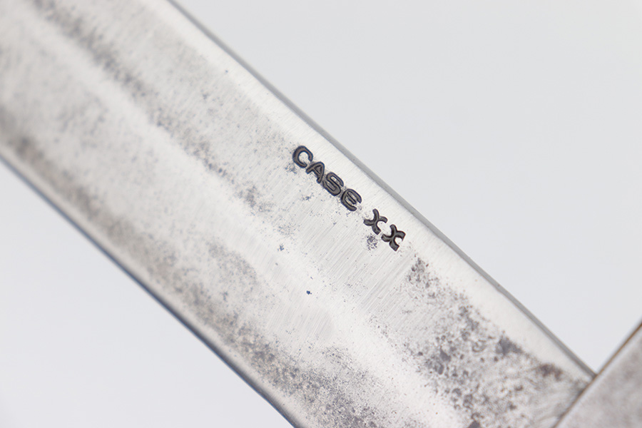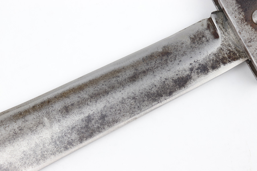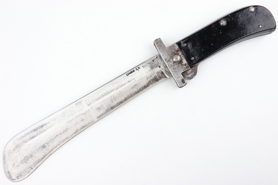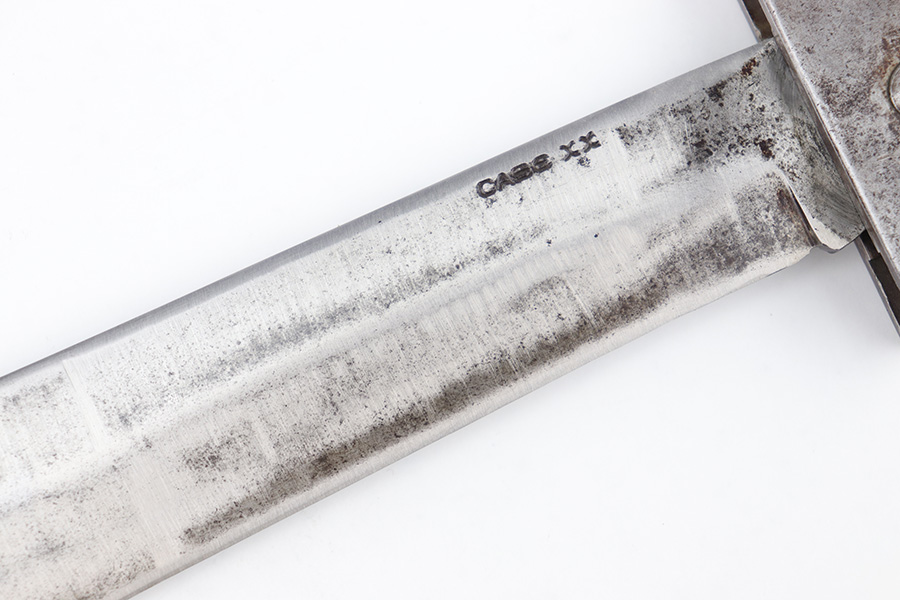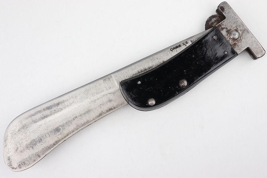 3/24/23 – This is an original CASE XX folding machete. These were mostly issued to and used by US Army Air Force pilots as a survival tool. This example is in good overall condition. Smooth folding action and tight lockup. Mechanically sound throughout. The blade is maker stamped and there are no other markings. The blade shows light surface patina throughout and some small nicks and dents along the edge from use. The crossguard and locking mechanism have some mild surface rust. The handle has no cracks or chips.