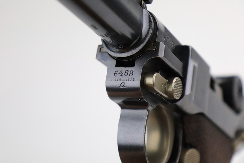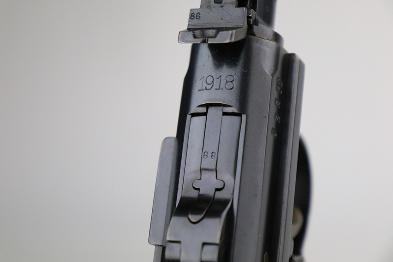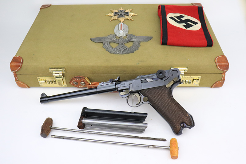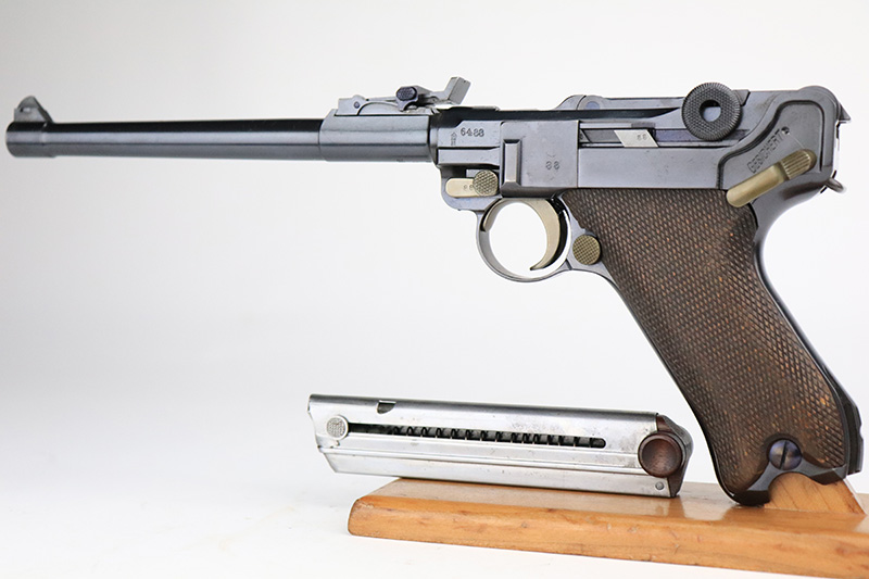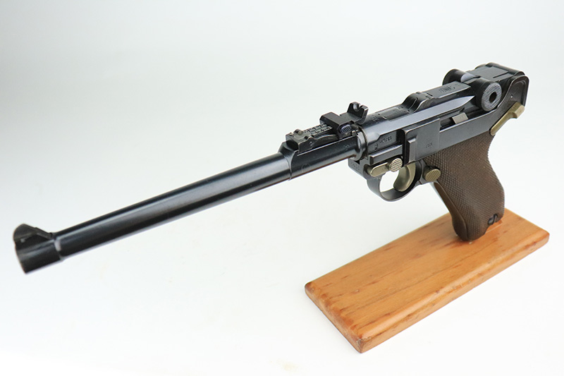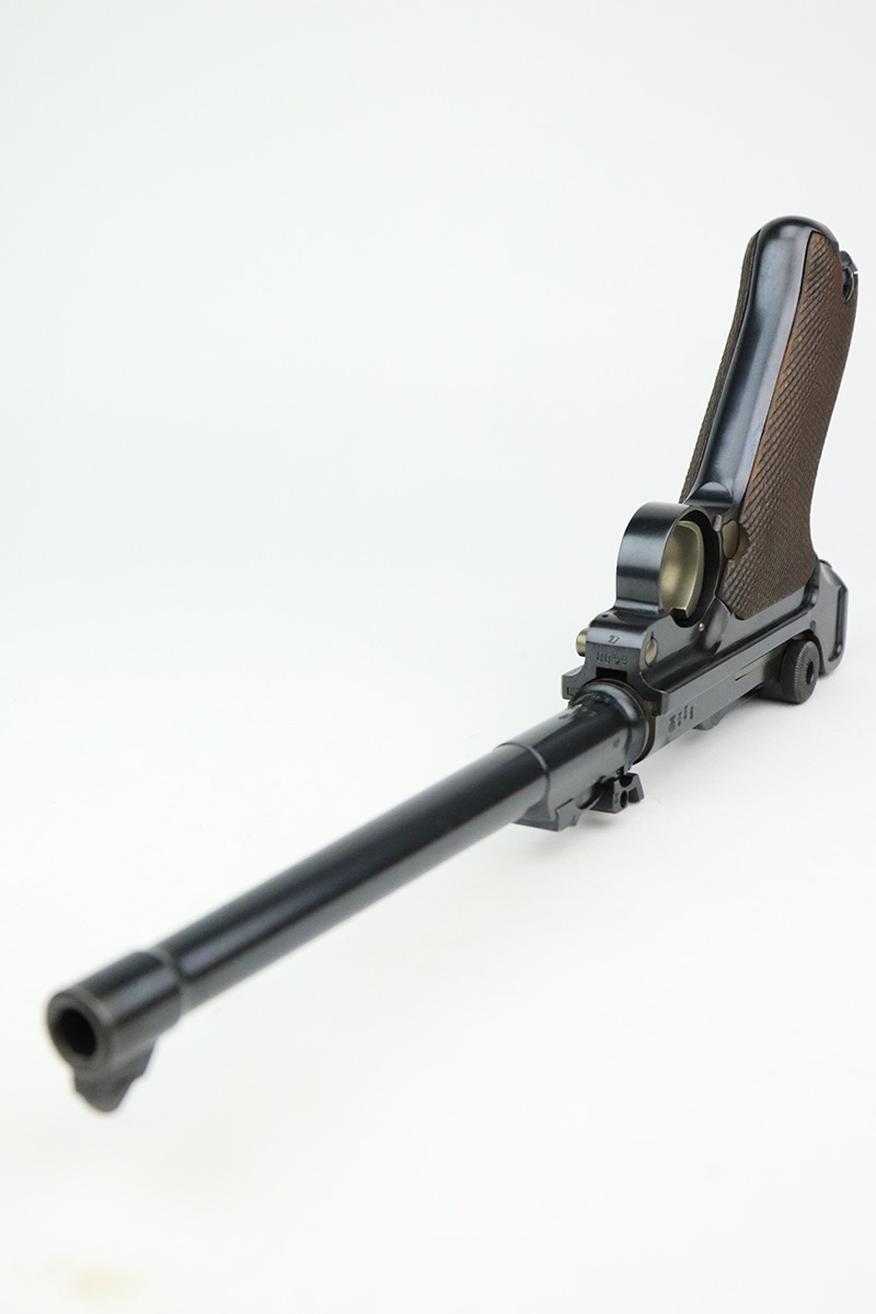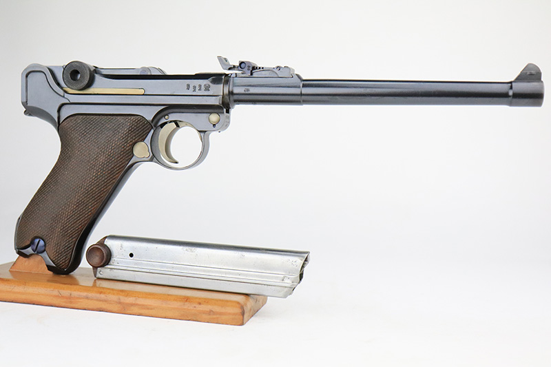 8/31/22 – This is an excellent example of a 1918-dated DWM Artillery. It is all matching and has Imperial proofs on the right side of the slide. The entire gun has been professionally restored, re-finished, and the stamps and numbering has been re-applied. The gun comes in a nice modern-production case with several pins, medals, and embellishments – we believe all of these are reproduction. It also comes with a Nazi armband, two cleaning rods, one wood bottom magazine, and one plastic bottom magazine – all of which are modern reproductions. In any case, the gun is in excellent condition, retaining virtually all of its new finish with very little sign of wear or use. Comes with excellent wood grips. The bore is like-new. This would make an excellent shooter and conversation piece!