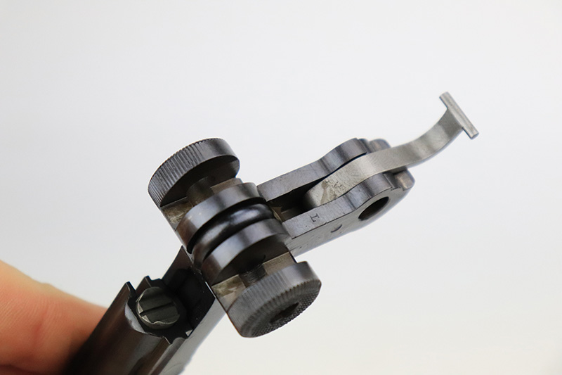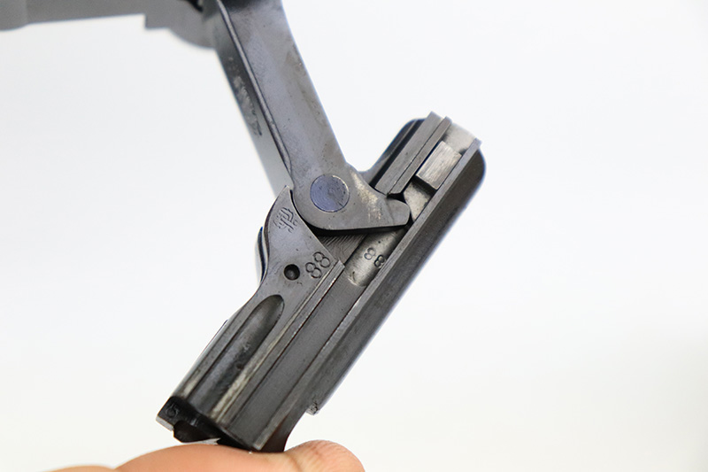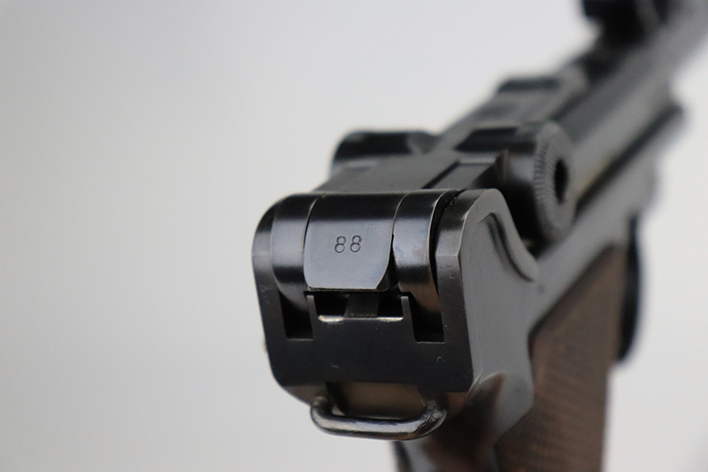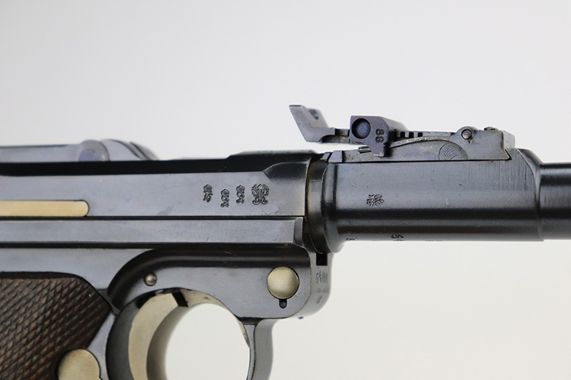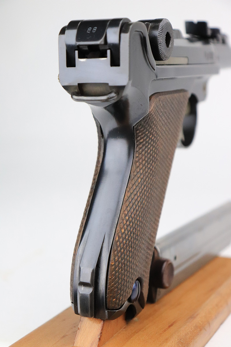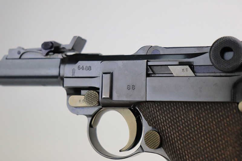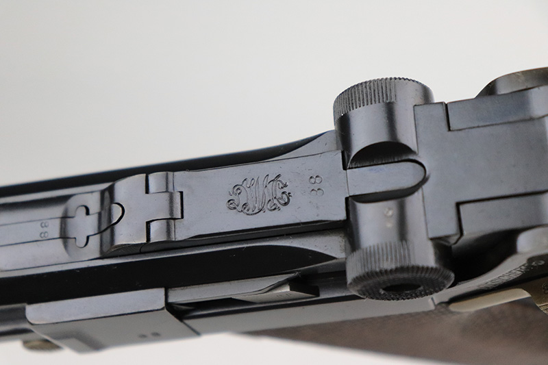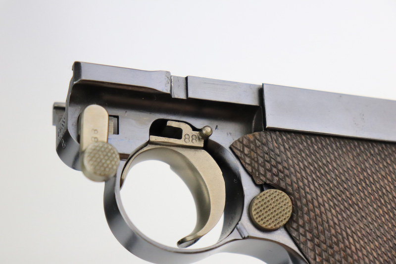 8/31/22 – This is an excellent example of a 1918-dated DWM Artillery. It is all matching and has Imperial proofs on the right side of the slide. The entire gun has been professionally restored, re-finished, and the stamps and numbering has been re-applied. The gun comes in a nice modern-production case with several pins, medals, and embellishments – we believe all of these are reproduction. It also comes with a Nazi armband, two cleaning rods, one wood bottom magazine, and one plastic bottom magazine – all of which are modern reproductions. In any case, the gun is in excellent condition, retaining virtually all of its new finish with very little sign of wear or use. Comes with excellent wood grips. The bore is like-new. This would make an excellent shooter and conversation piece!