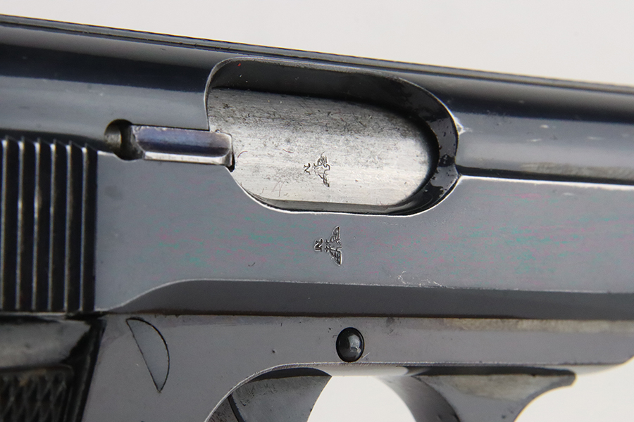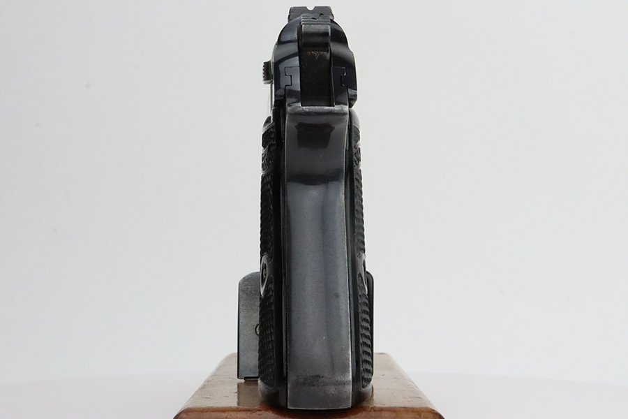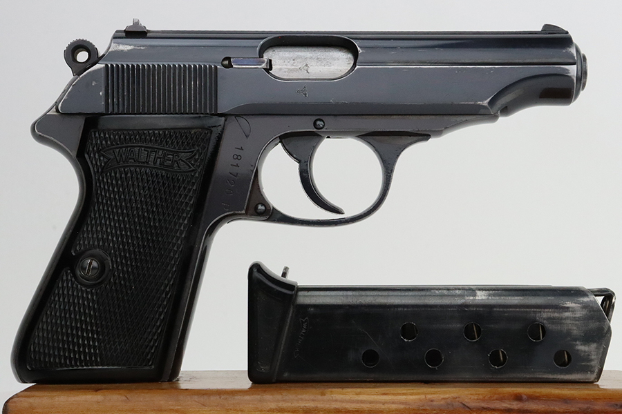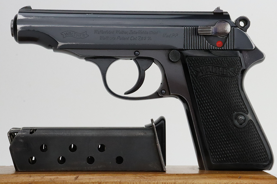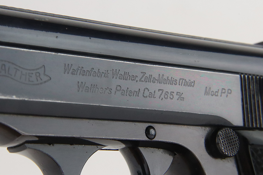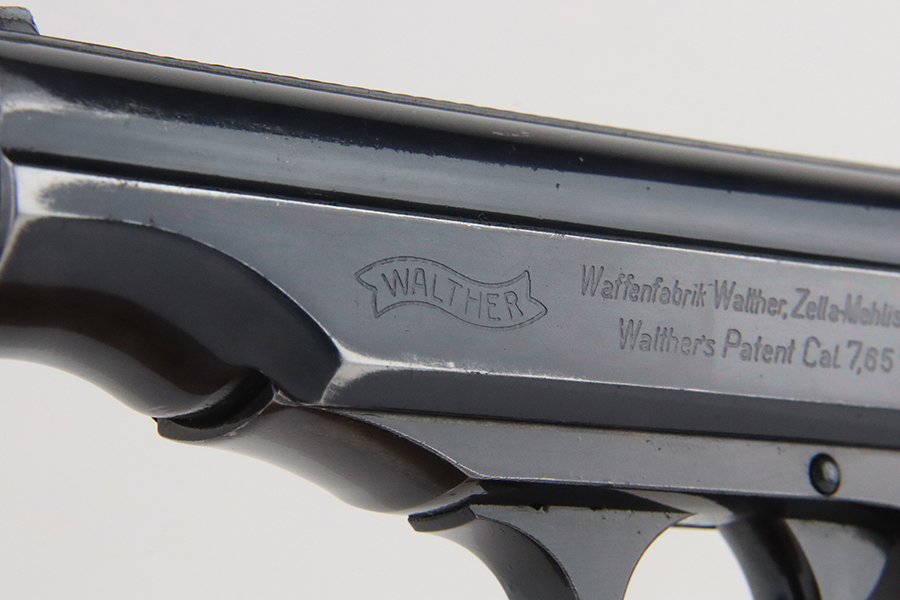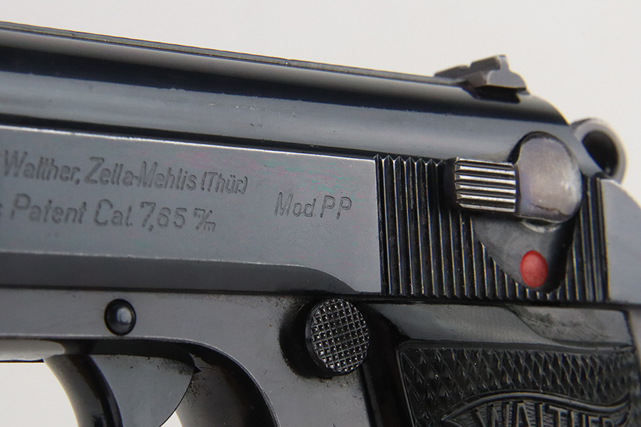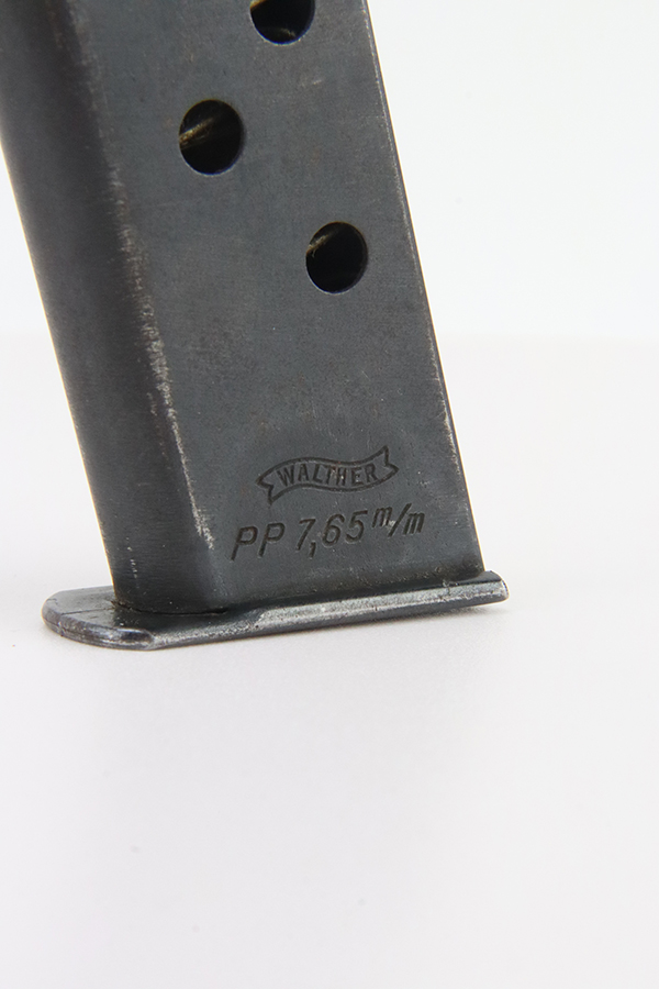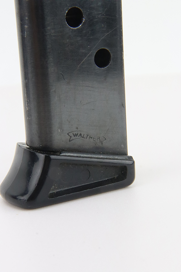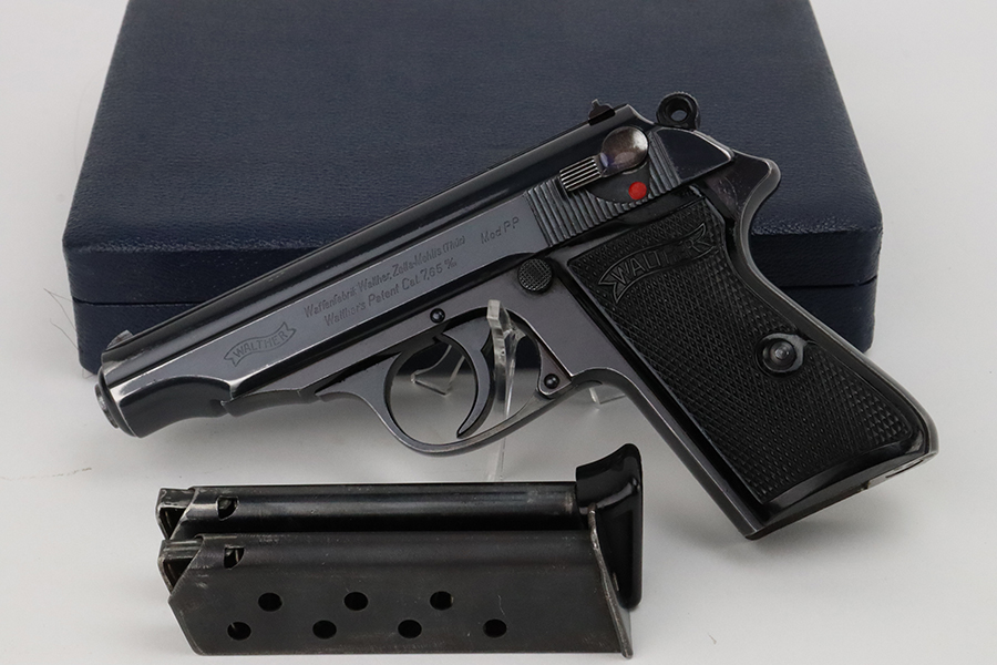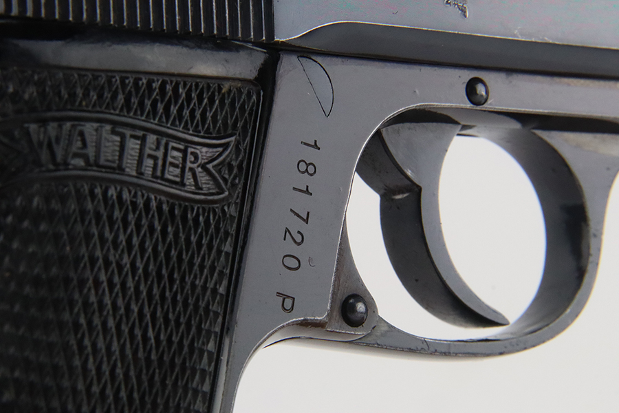 2/7/24 – This is a Walther PP sold in the commercial market in 1940. It is all matching and has the proper “Eagle N” commercial proofs. It has retained about 85-90% of its bluing, with an area of finish loss under the trigger guard and thinning along both grip straps, more prominent on the back strap. Some high edge wear on the both sides of the slide, which is more pronounced near the muzzle and hammer. Some surface scratches here and there. Comes with an original Walther-branded presentation case. Also includes one flat bottom and one finger extension magazine.