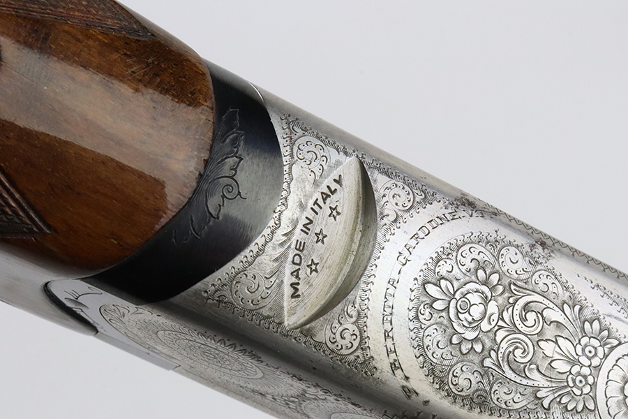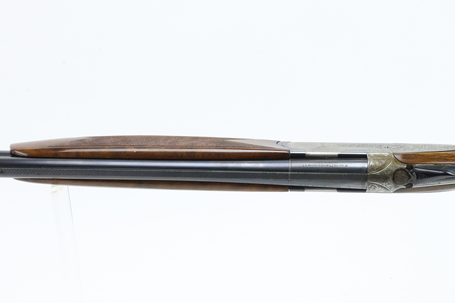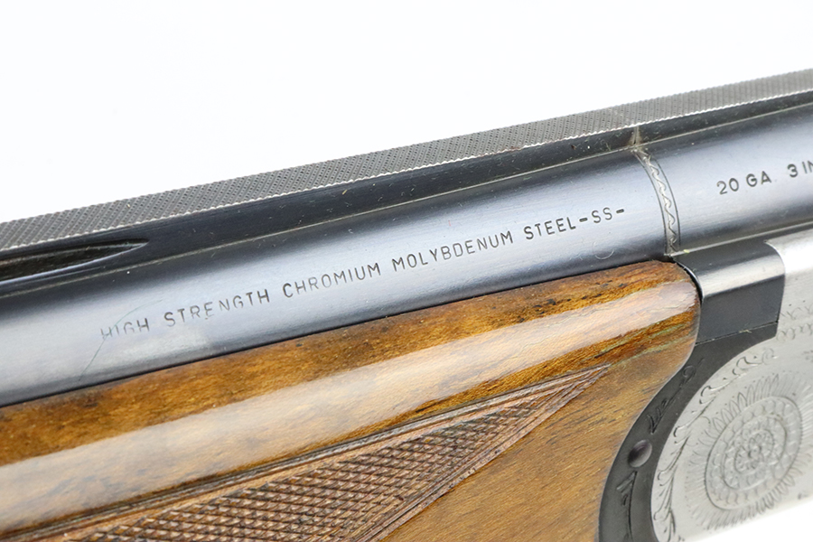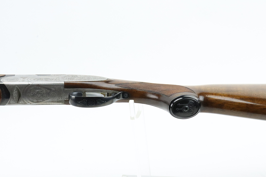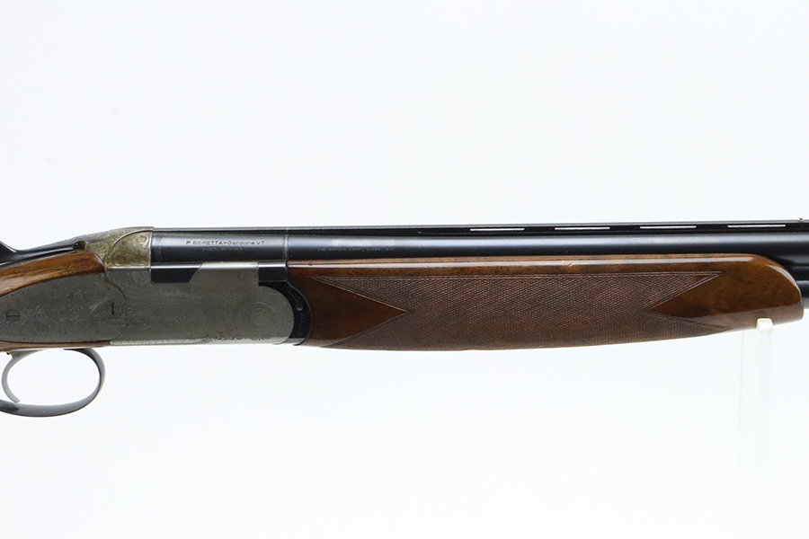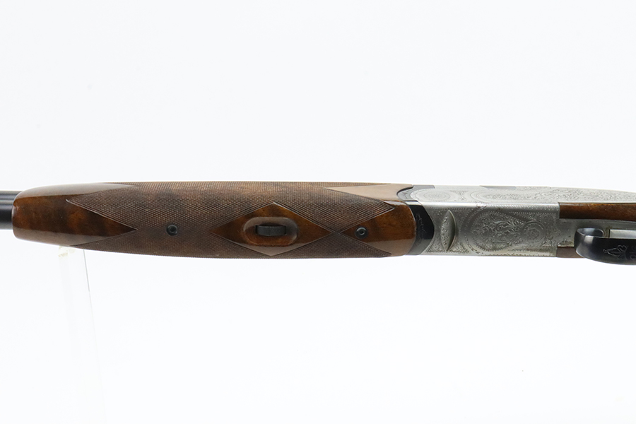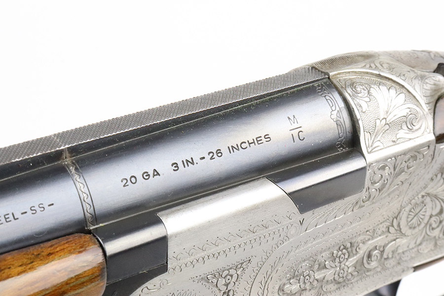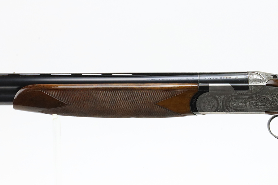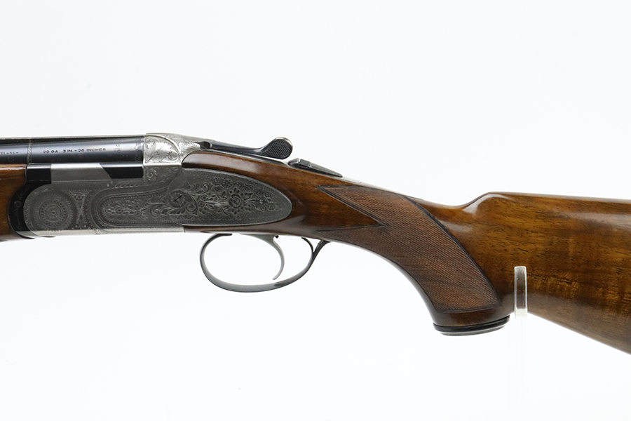 3/27/24 – This is a beautiful example of an engraved Beretta Model 57E over/under shotgun, chambered in 20 GA. It comes in a really nice green velvet-lined leather case. The receiver on this gun features a beautiful and detailed filigree engraving pattern. Blued barrels. There are virtually no signs of wear, just some minor discoloration on the receiver. Minty wood furniture. Mint bores. 26 3/8 inch barrels.