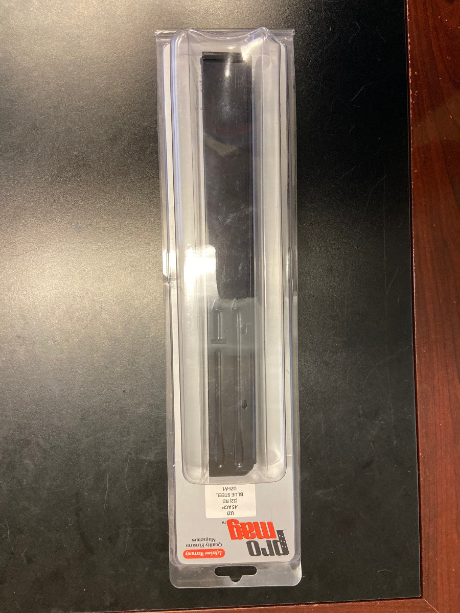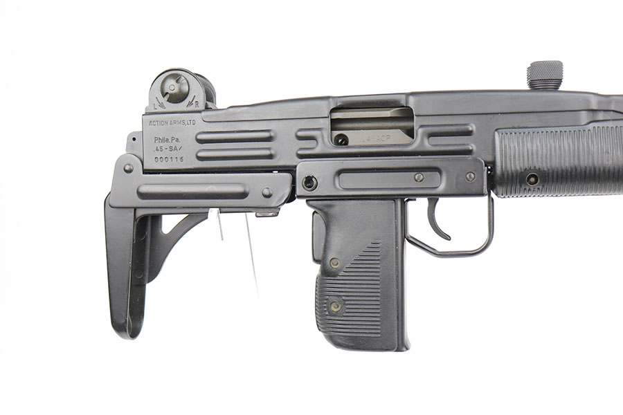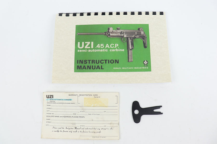 11/2/20 – This is a minty pre-ban IMI Uzi Model 45 Carbine, as 16.25 inch barrel and retractable stock make this register as a rifle. It is in nearly unfired condition with the original Uzi case from the importer, Action Arms, as well as sling, manual, registration card and a couple of other extras. Also comes with two Pro Mag magazines in their original packages, both with 22 round capacity. This package would be tough to upgrade over the combination of condition and extras.