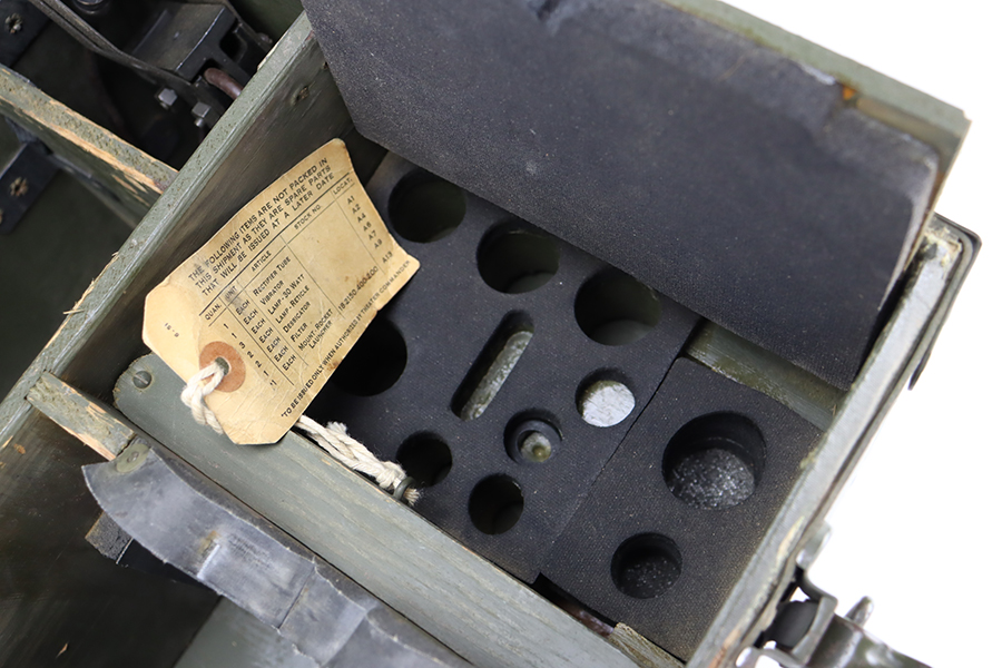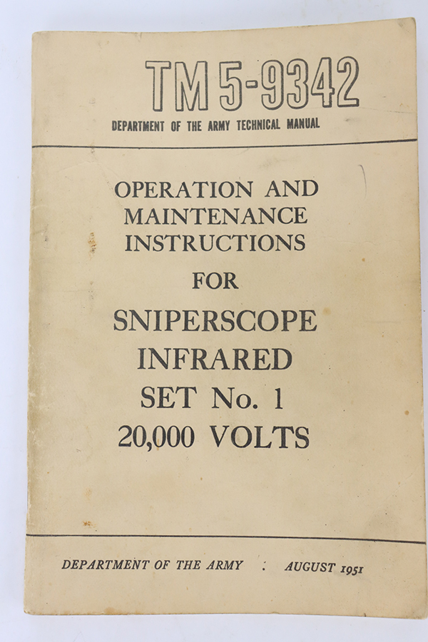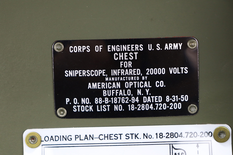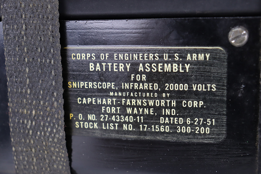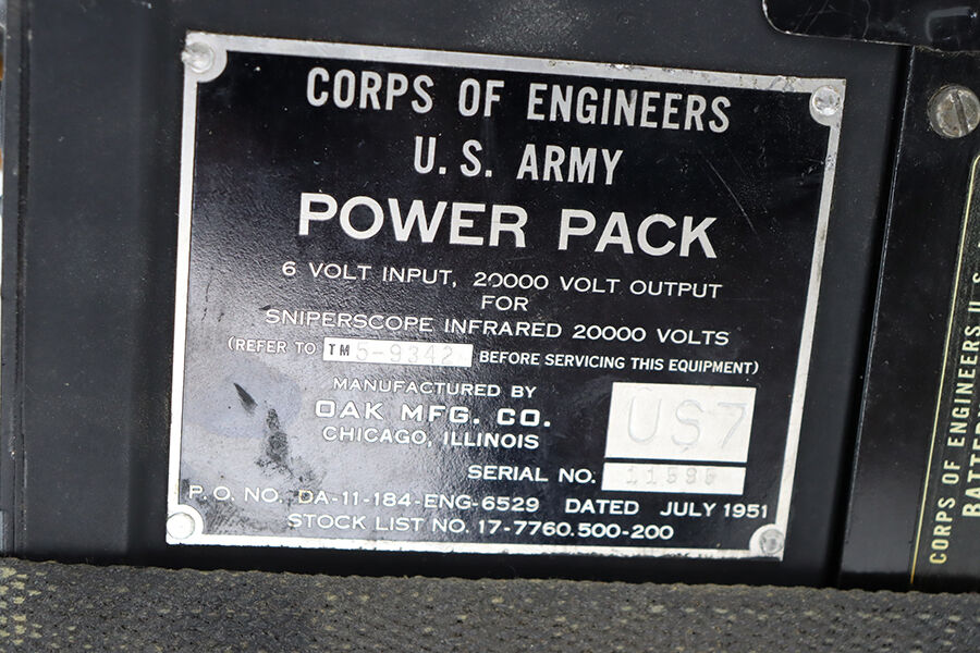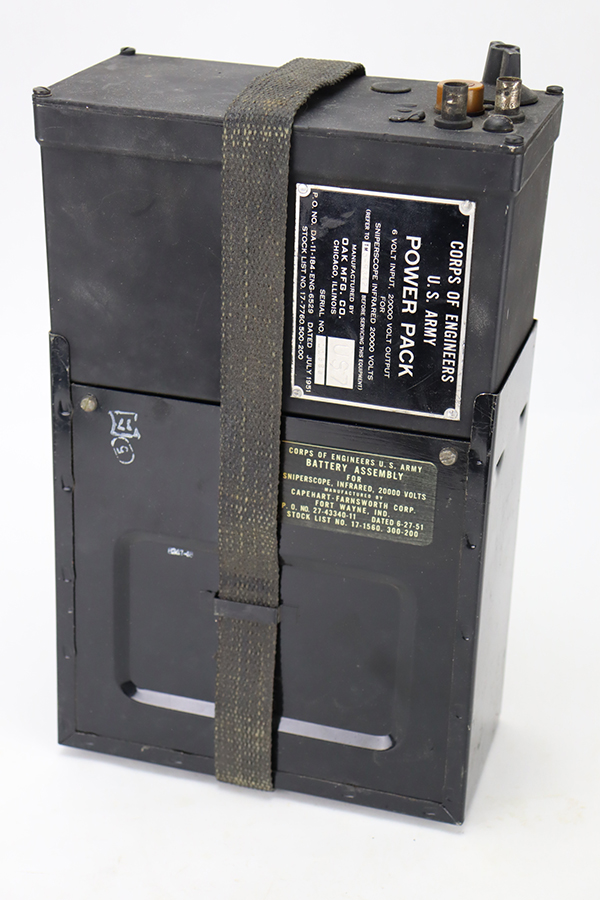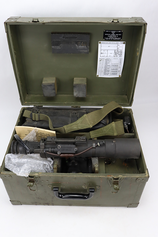 2/8/24 – Developed during WW2, the M3 was named a “sniper scope” in official nomenclature to obscure its true function as an early infra-red night scope, capable of spotting targets at over 100 yards and detecting other IR-sources up to a mile away. Mounted on an M1 semi-automatic carbine, the scope could be used by night sentries to detect incoming sneak attacks, and direct outbound machine gun and rifle fire with tracer rounds. The scope measures 16 inches long with a Army Corps of Engineers/American Optical Company markings on a sticker on the right side of the base. In a green painted hardwood case with white stenciled “U.S./SNIPERSCOPE/INFRARED/SET NO.1, 20000 VOLTS” on top of the lid, another Army Corps of Engineers/American Optical tag on the inside. The case contains the original pieces, including the power pack and its rubberized canvas pouch, the attaching wires, handle, etc. This listing also includes an additional power pack attached to a battery assembly, another battery assembly, 1-battery cage, 2-reticle rheostats, 2-potentiometers, a replacement electron tube and an original manual.