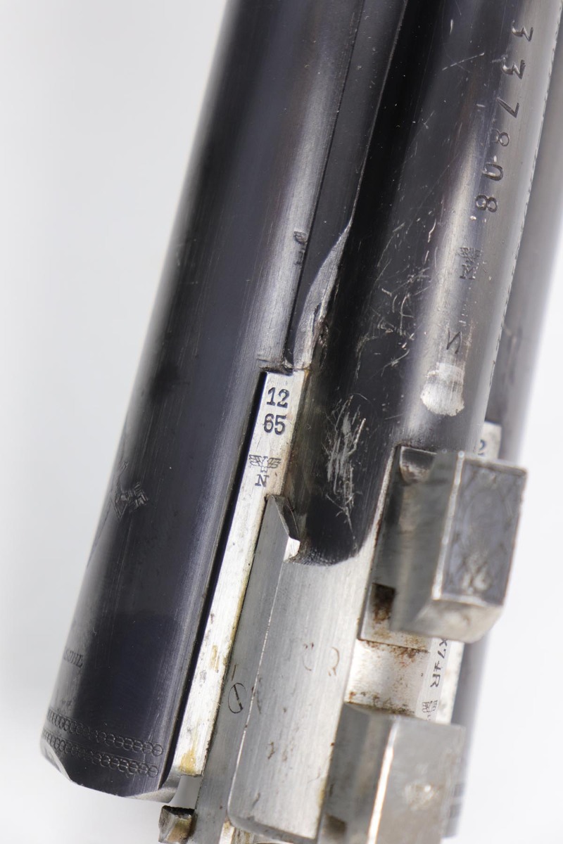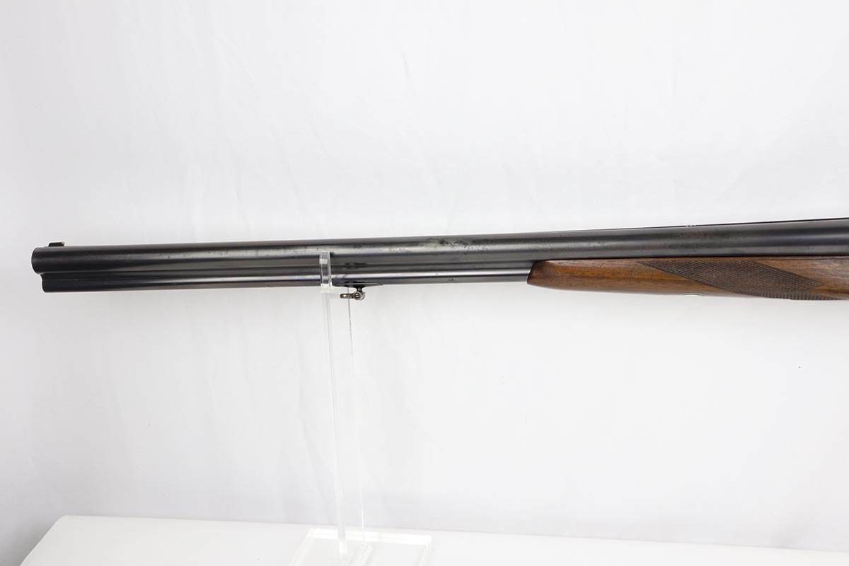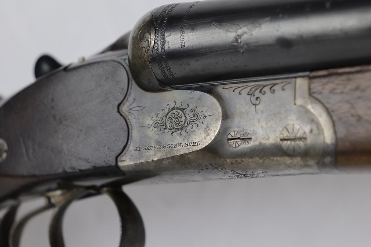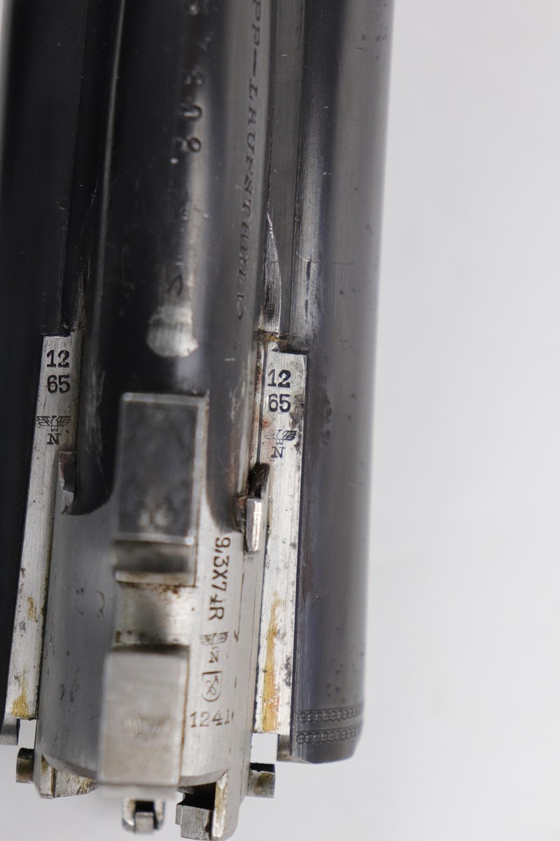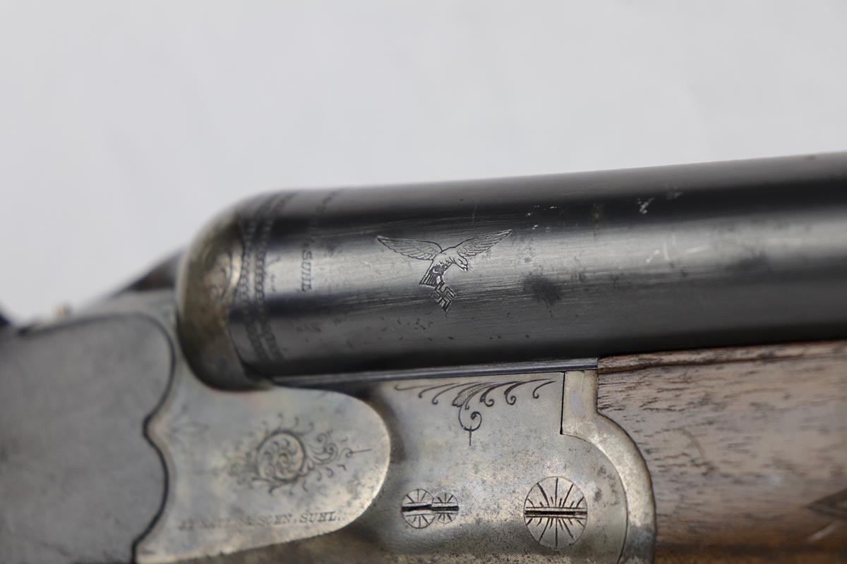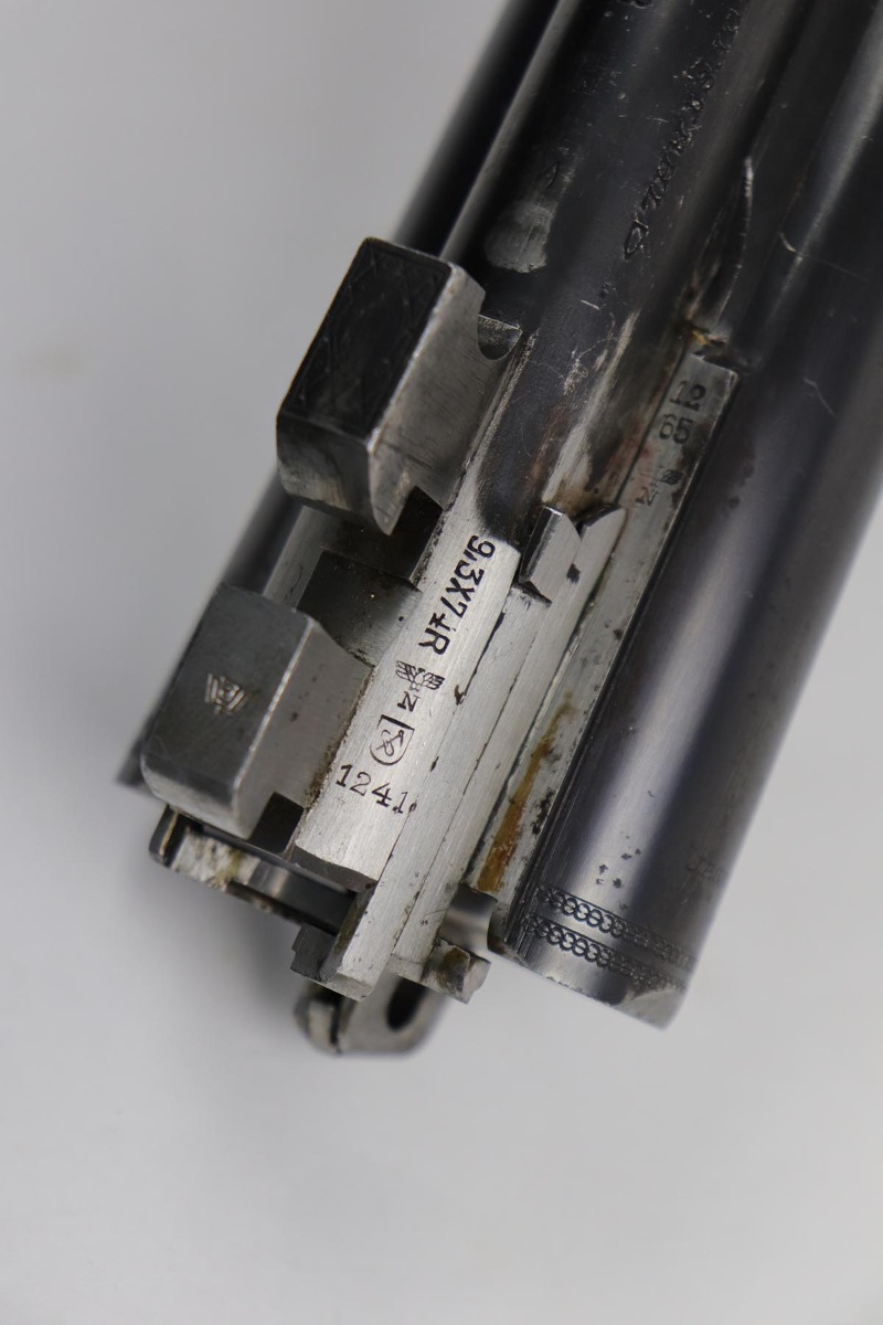 The Sauer M30 drilling (in German, meaning triple-barrel combination rifle/shotgun) was originally developed by famous German gun making company J.P.Sauer & Sohn as all-around hunting weapon. Introduced in 1930, it was commercially available in several caliber combinations, sporting two side by side shotgun barrels (in 16 or 12 gauge) over one rifled barrel. In 1941, when Hitler’s Germany began military operations in Northern Africa, Luftwaffe (German Air Force) adopted Sauer M30 drillings as wilderness survival weapon for air crews, operating over vast North African deserts. It is 12g as well as 9.3x74R rifle ammunition. It must be noted that Luftwaffe bought Sauer M30 drillings outside of standard military procurement procedures, and all Luftwaffe drillings were made to pre-war commercial standards of fit and finish, and thus were rather expensive. Overall, Luftwaffe bought about 2,500 Sauer M30 rifle / shotgun. Eagle/N proofs can be found in a few spots. All matching, and functions well mechanically. This gun was also partially featured in our Youtube video on the drilling shotguns, and can be found as the last photo in this listing.