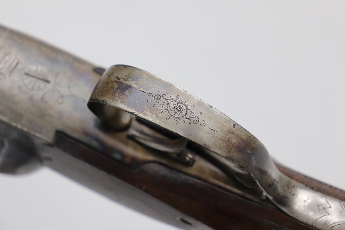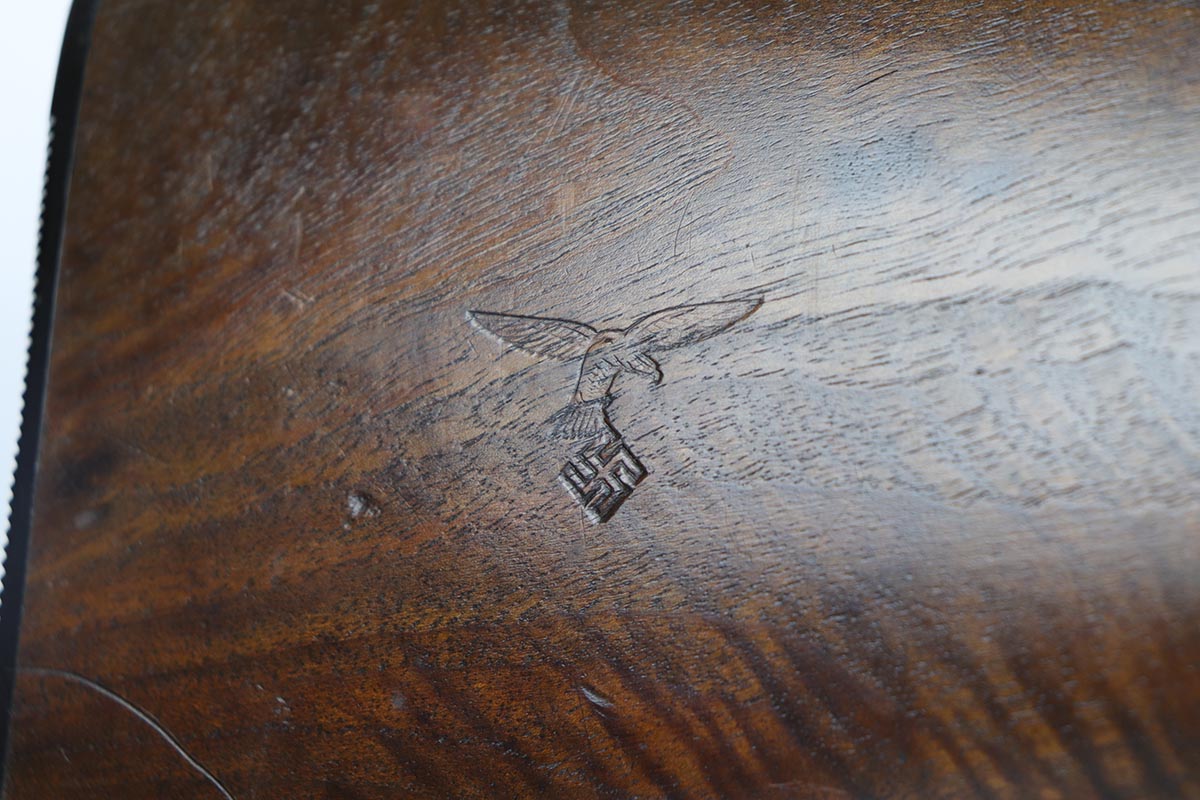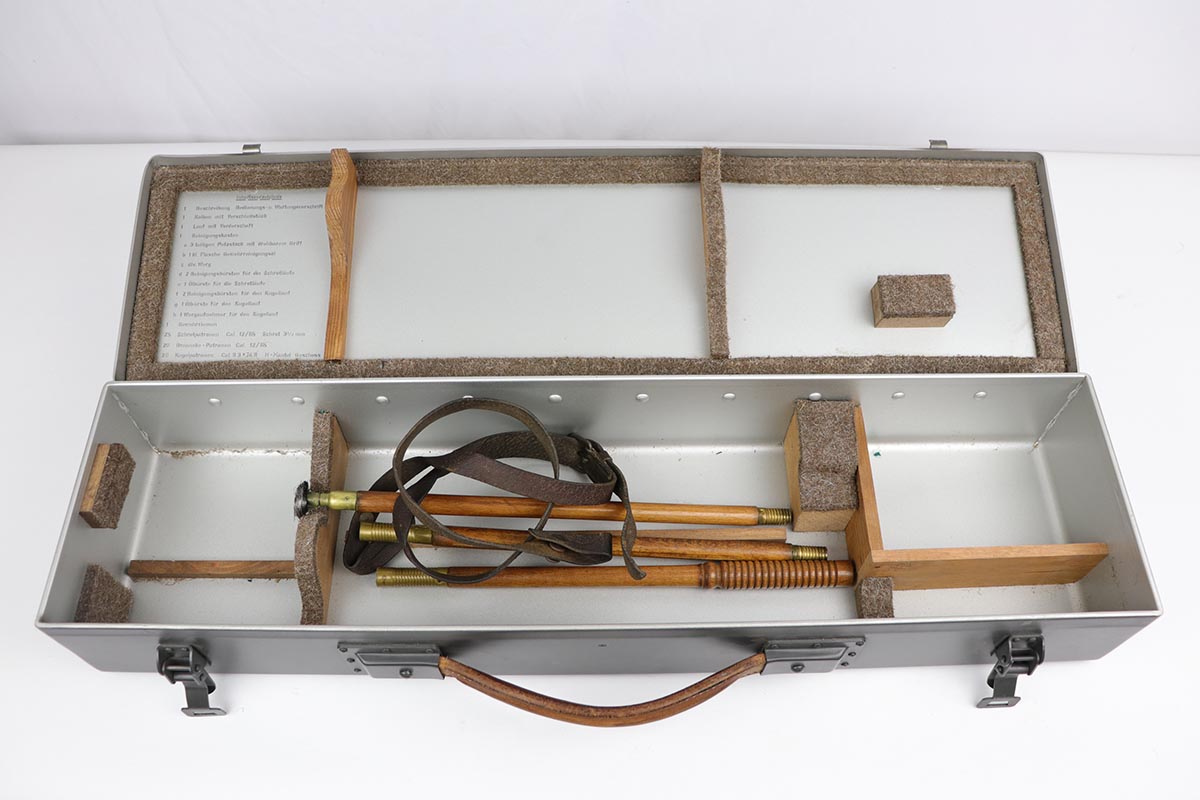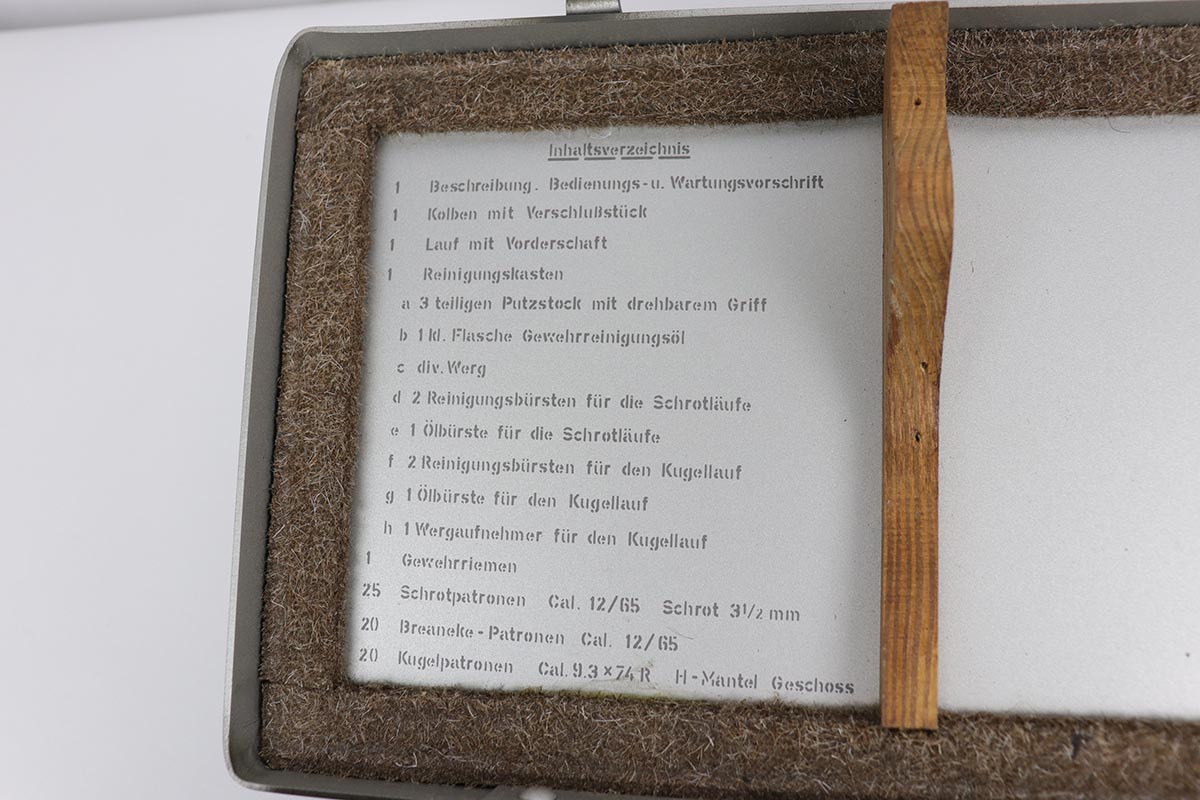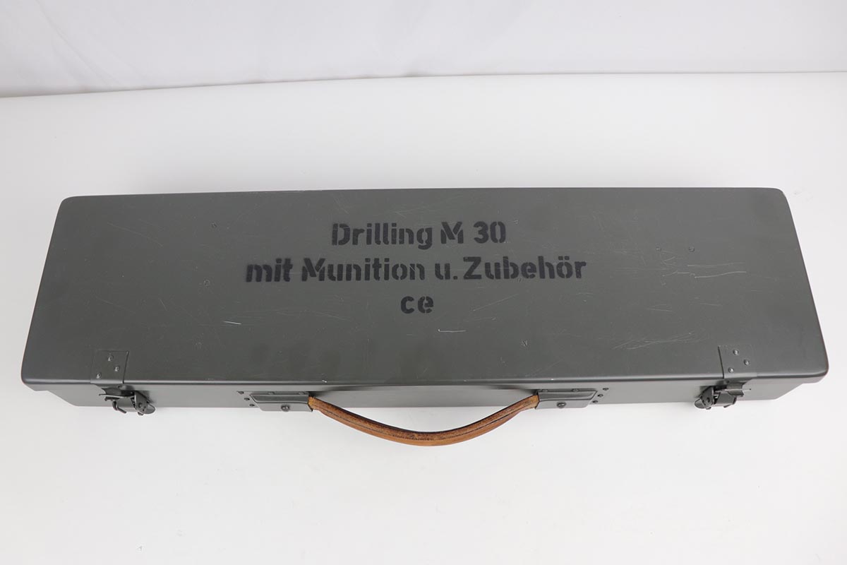 12/11/19 – This is a beautiful, cased M30 Luftwaffe drilling from December of 1941. The original finish is about ~80% with excellent case hardening. The barrels/upper show minor wear, but there is some thinning of the case hardening throughout the receiver. The bores are excellent and shiny. The stock is in fantastic condition with hardly any dings or nicks, and a sharp Luftwaffe eagle marking on the right side. We believe the case is original but repainted/restored. It includes an original sling, and a reproduction cleaning rod.