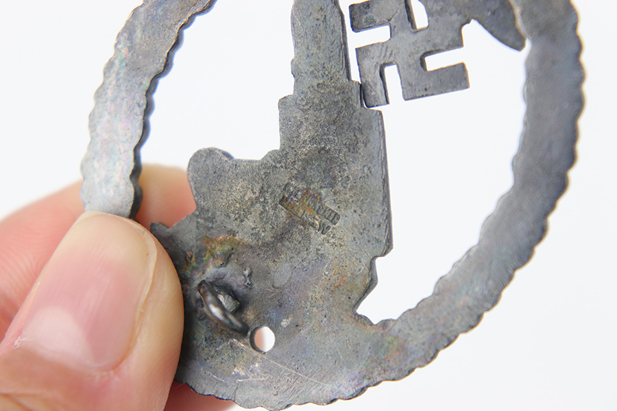 7/17/23 – This is an original WW2 production Luftwaffe Flak Badge by Juncker. The badge is 2 piece construction with the Luftwaffe eagle soldered to the wreath at the top. Nickel construction and completely non-magnetic. Great detail with dark patina throughout as shown. The reverse is maker stamped, and the pin is original and functional. Comes with an original case in excellent condition. Weighs 42 grams. Overall length (from top to bottom) is 65mm. Width of the wreath is 45mm and wingspan is 41.5mm.