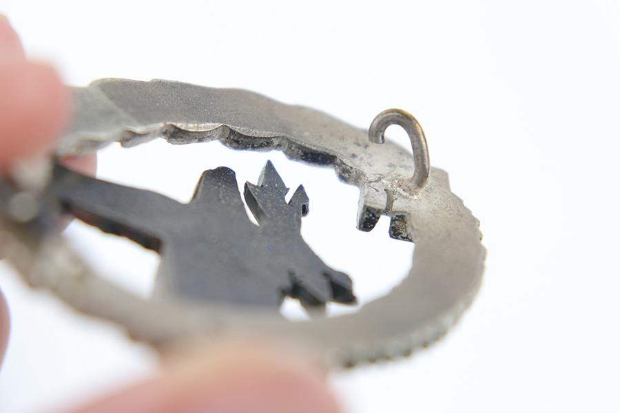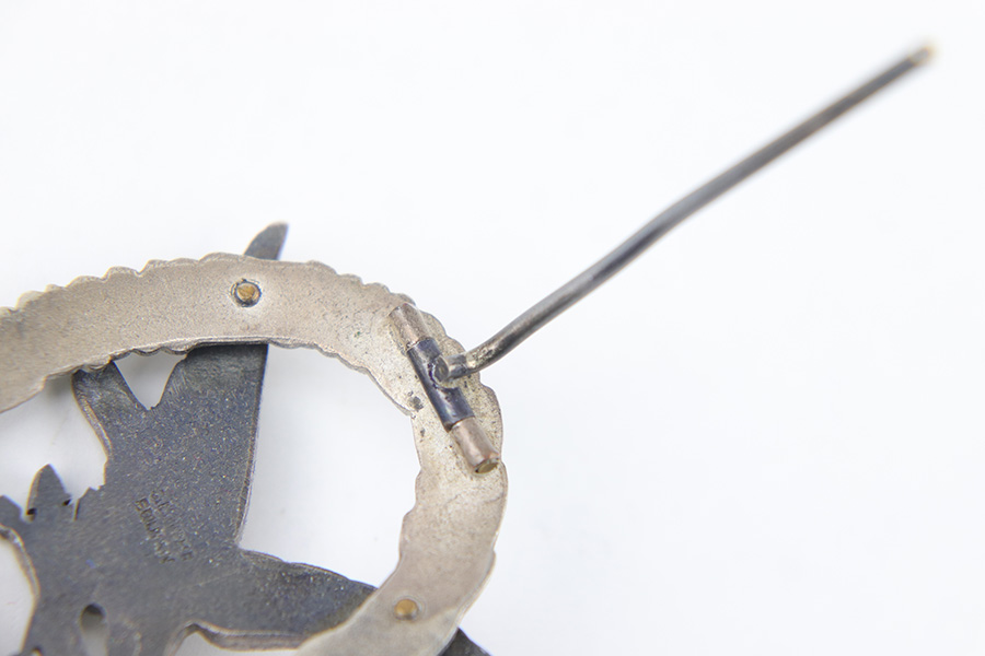 7/14/23 – This is an original WW2 Luftwaffe Radio Operator & Air Gunner Badge by Juncker. The badge comes in the original case and is in great overall condition. The badge is completely non-magnetic tombac construction with two piece design. The eagle has traces of the dark colored finish still intact, but there’s natural patina and normal high edge wear throughout the many fine details. The wreath is finished in silver, with mild edge wear as shown. The reverse shows two attachment rivets on each of the eagle wings, a Juncker maker stamp, and the original fastening pin. The hook is slightly bent but still intact and original. The case is in great condition. The eagle wingspan is 42mm. Length from base of the swastika to the top of the wreath is 52.5mm. The wreath width is about 40.5mm. Weighs 38 grams.