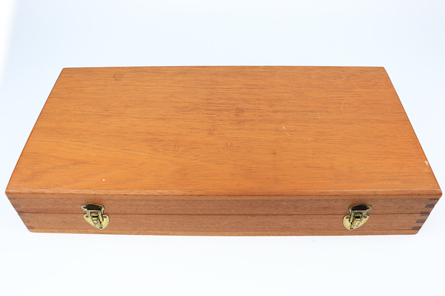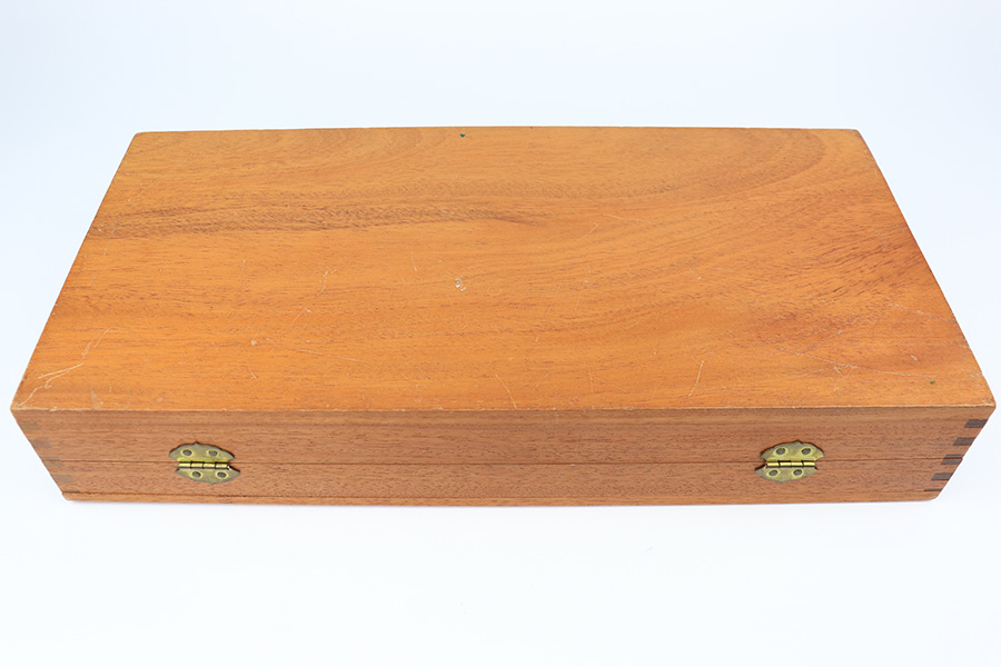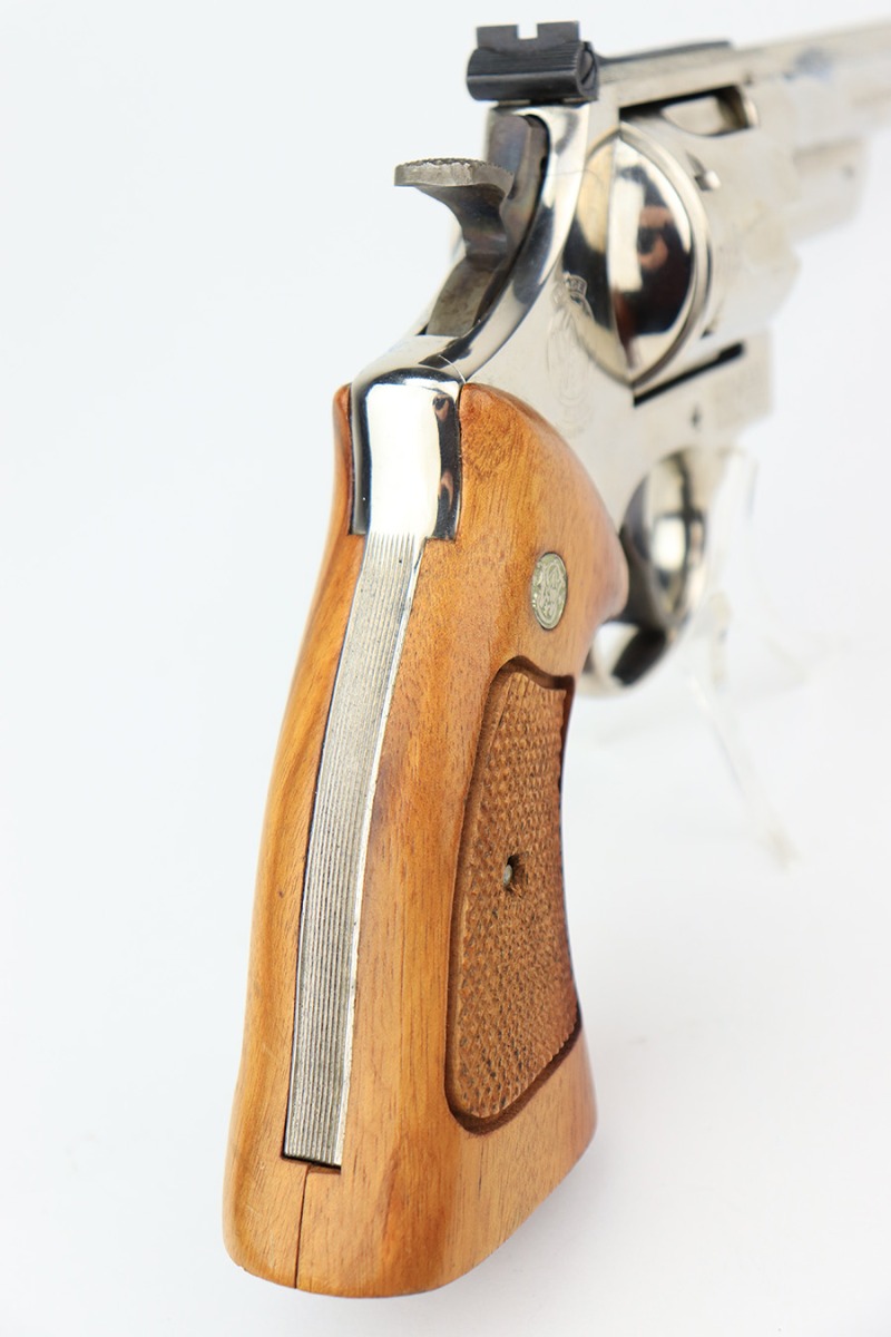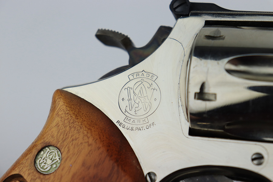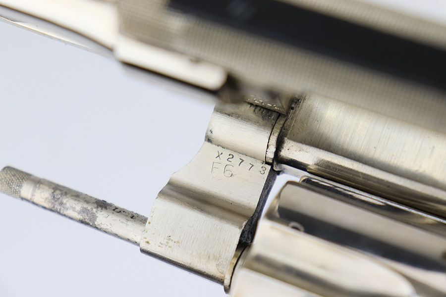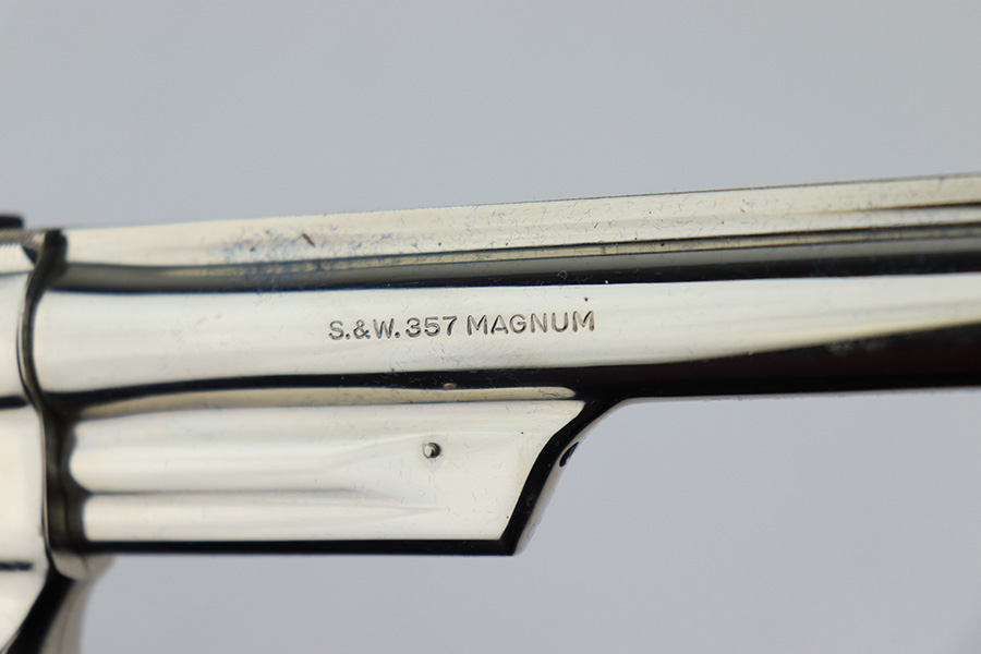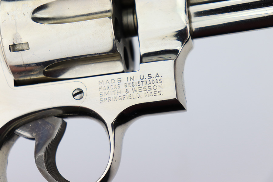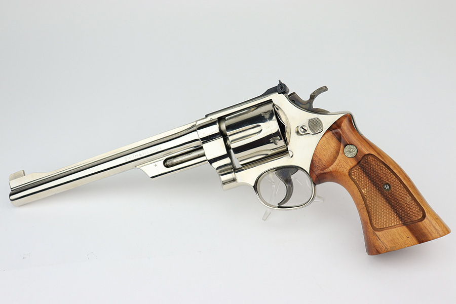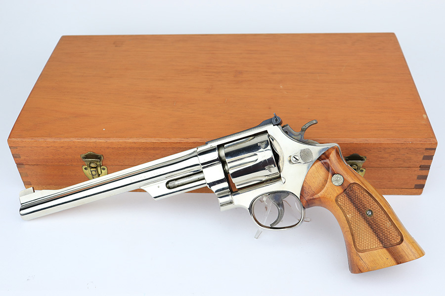 3/24/22 – This is an excellent Smith & Wesson Model 27-2 revolver in the original wooden display case. It has factory nickel finish with a 8 3/8 inch barrel. There’s common surface scuffing, a turn line on the cylinder, a little wear around the muzzle and a small spot of wear on left side frame. Terrific condition overall though with a mint bore. Nice case hardening on the trigger and hammer. Timing and lock up seem good. Excellent, original wood grips. Serial dates this one to 1980 so FFL required. Display case comes with the brushes/rod.