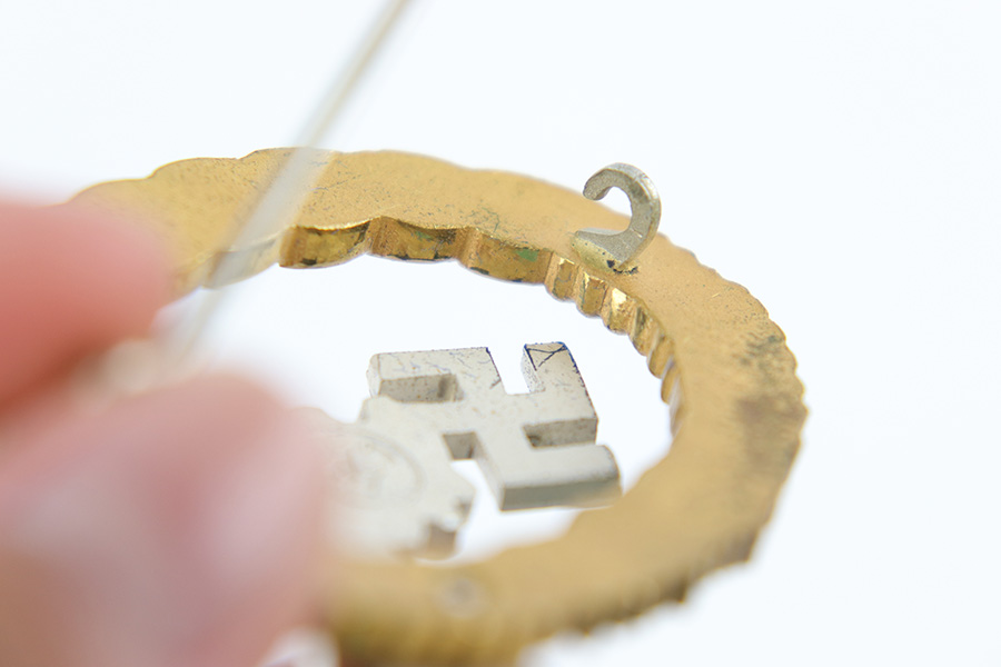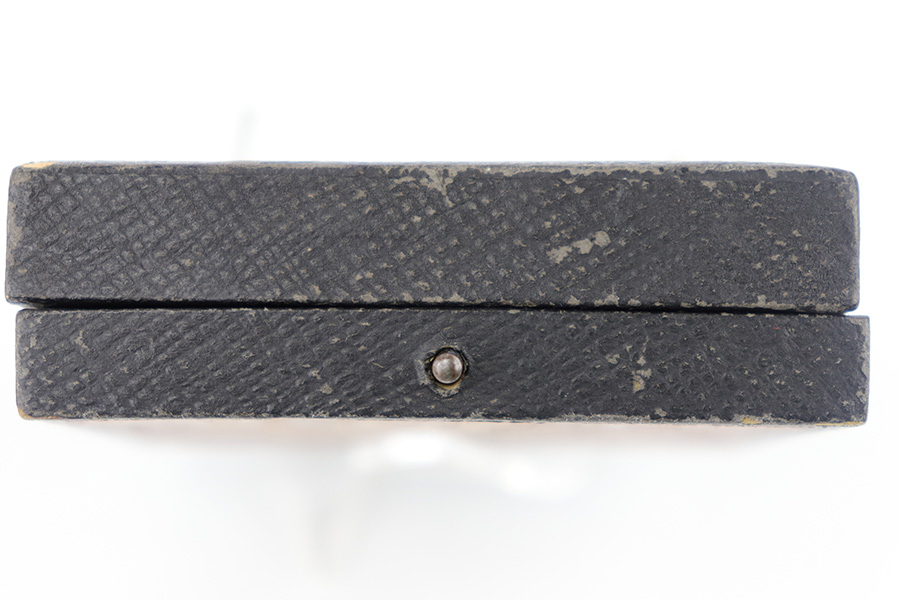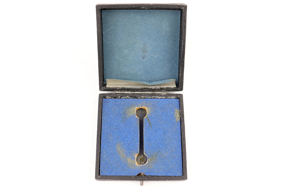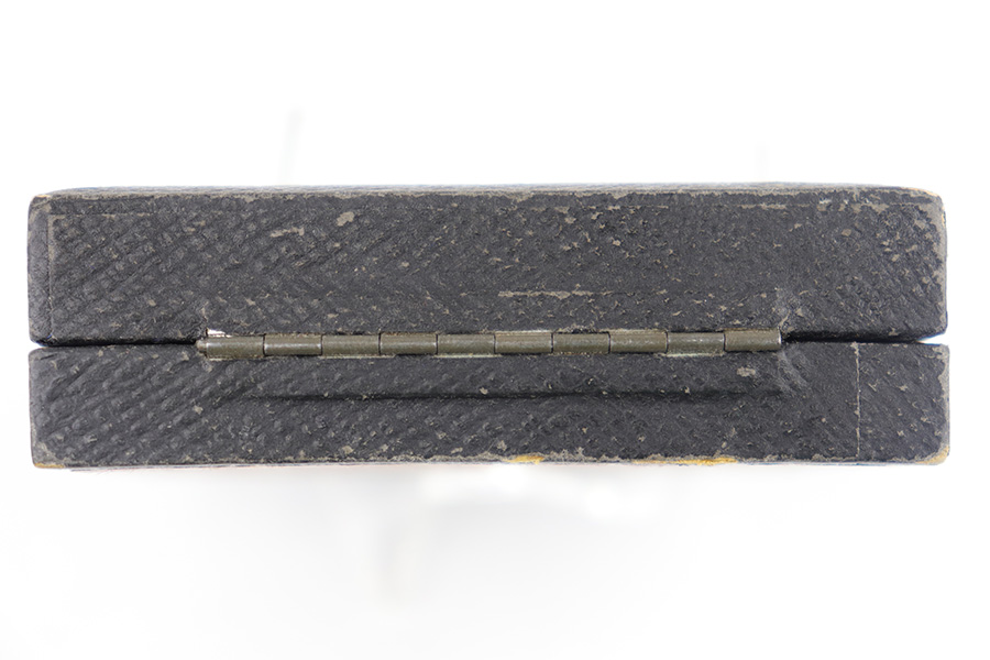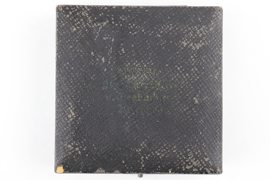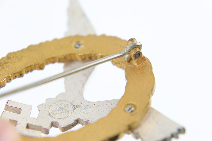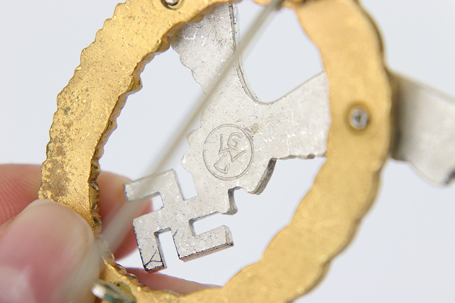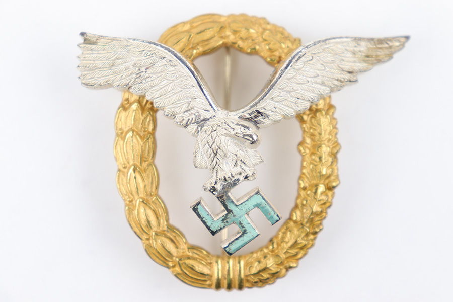 7/17/23 – This is an excellent condition WW2 Luftwaffe Pilot Observer badge with an original case. The badge is 2 piece construction with a silver eagle and gold wreath. The award is completely non-magnetic tombac and weighs 52 grams. The eagle wingspan is 64mm and the length of the wreath from top-to-bottom is 53mm. The wreath is in minty condition with shiny high edges and sides, while the flatter, sunken areas of the oak leaves are matte gold washed. The eagle more visible surface patina and dark discoloration on the wings and eagle body. This is mostly on the high edges of the eagle beak, breast, and wing outline. There is a considerable amount of the original finish still intact throughout. Excellent detail as well. The swastika is shiny with dark edge wear as shown. The reverse has excellent matte finish throughout, and a crisply struck GWL maker marking. The hinge is original and functional with no issues. Comes with an original case that shows light surface wear and aging throughout. A very rare award in extremely well-preserved condition. Worn by Luftwaffe Pilots who qualified for both the Pilot’s badge and the Observer Badge.