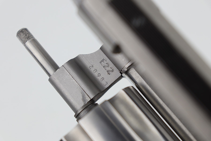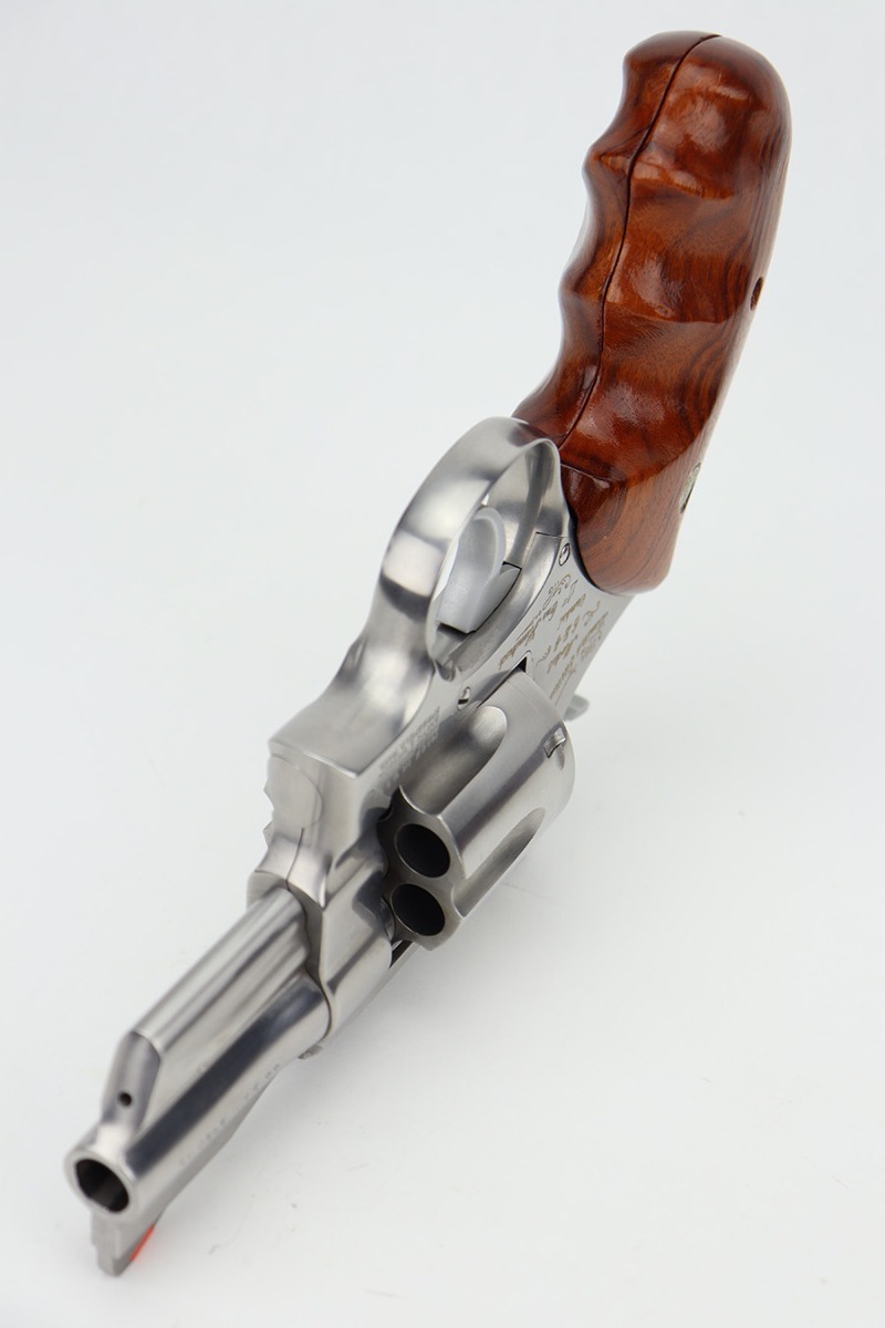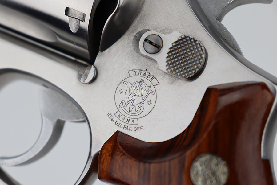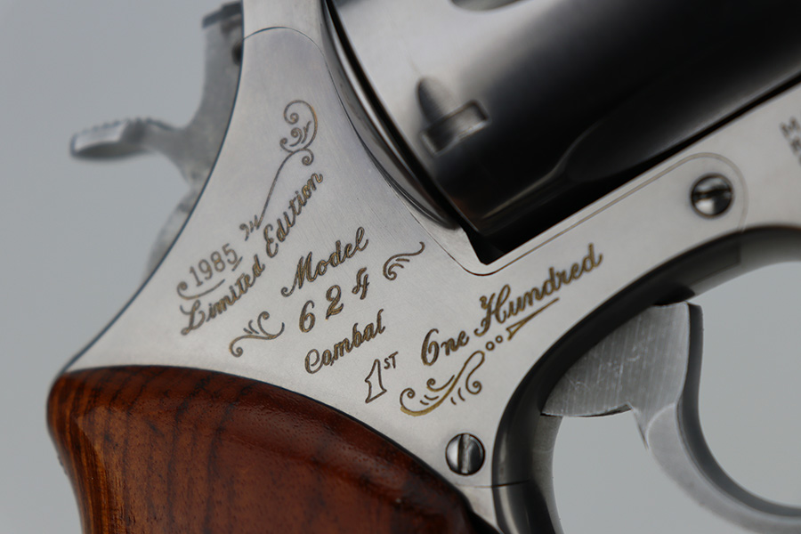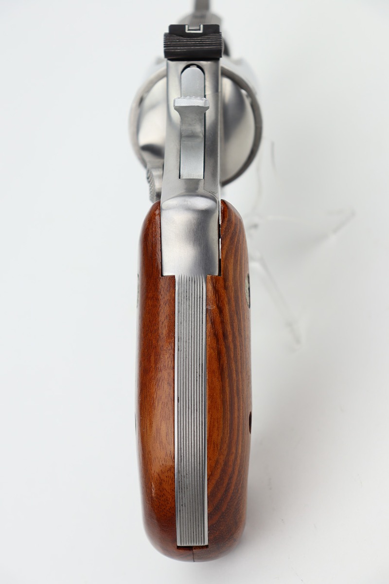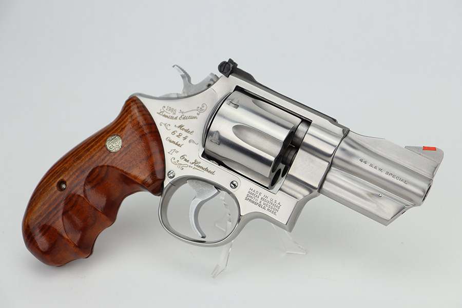 3/28/24 – This is a mint example of a Smith & Wesson Model 624 revolver, 1985 Limited Edition, chambered in .44 Special. 3 inch barrel. The right side of the frame reads “1985 Limited Edition Model 624 Combat 1st One Hundred”. Comes with a really nice wood presentation case. The gun has a really nice stainless finish and shows very little sign of wear or use, just a light roll mark on the cylinder. Fitted with excellent wood grips. Mint bore. Smooth action.