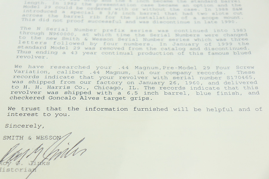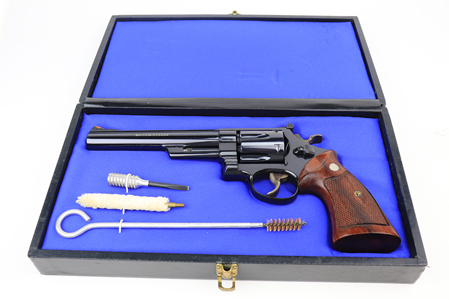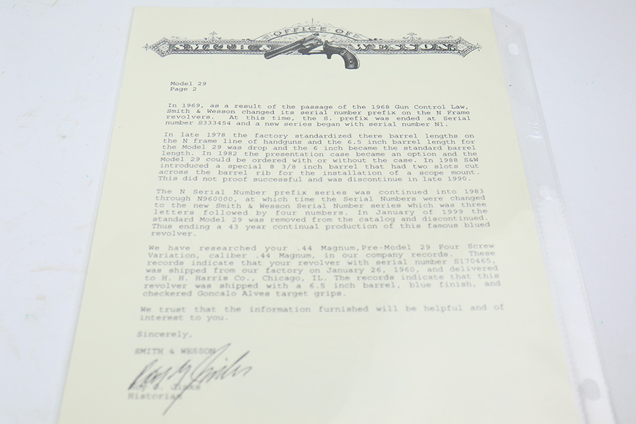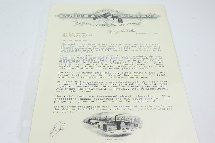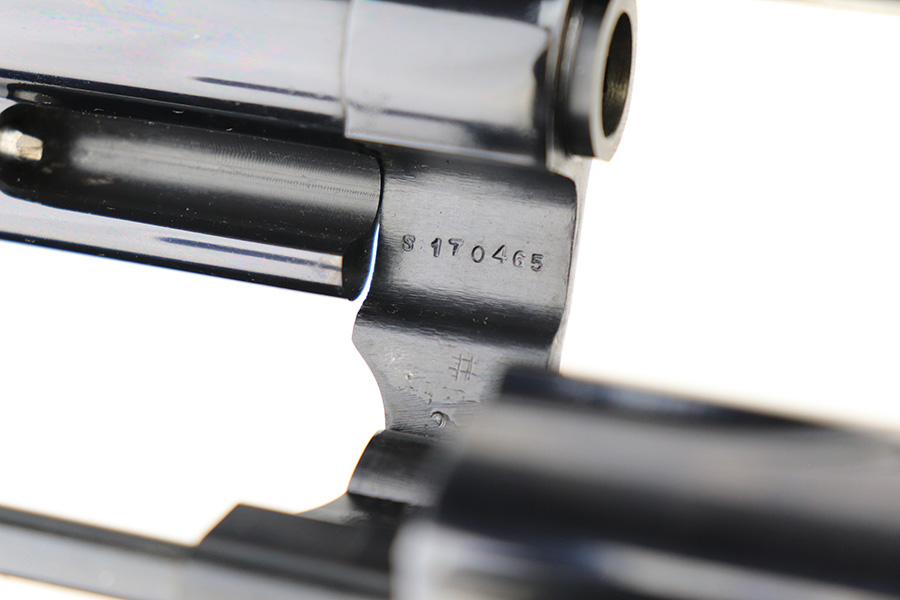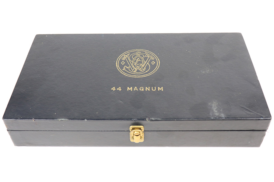 5/20/22 – This is a minty Smith & Wesson Pre-Model 29 in the black/blue factory S&W case. It is chambered for .44 magnum and has a 6.5in barrel. It’s accompanied by a S&W factory letter stating this gun shipping to a retailer in Chicago in January of 1960. The gun has 99% of the blue remaining with a very minor turn line on the cylinder. Minty bore and grips. Grips are not numbered. The case is in excellent condition and comes with the brush set.