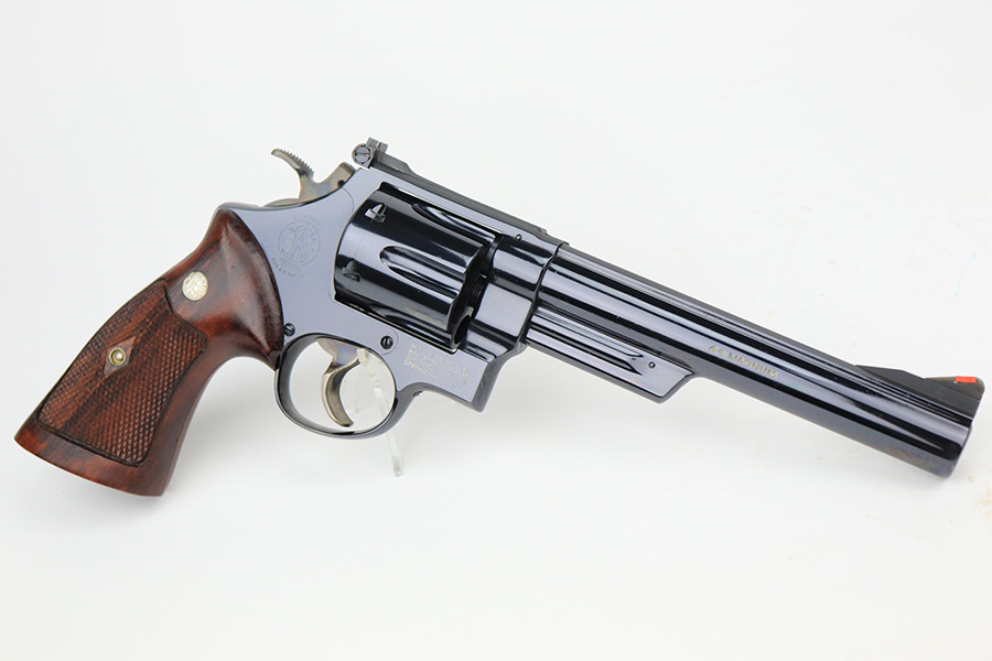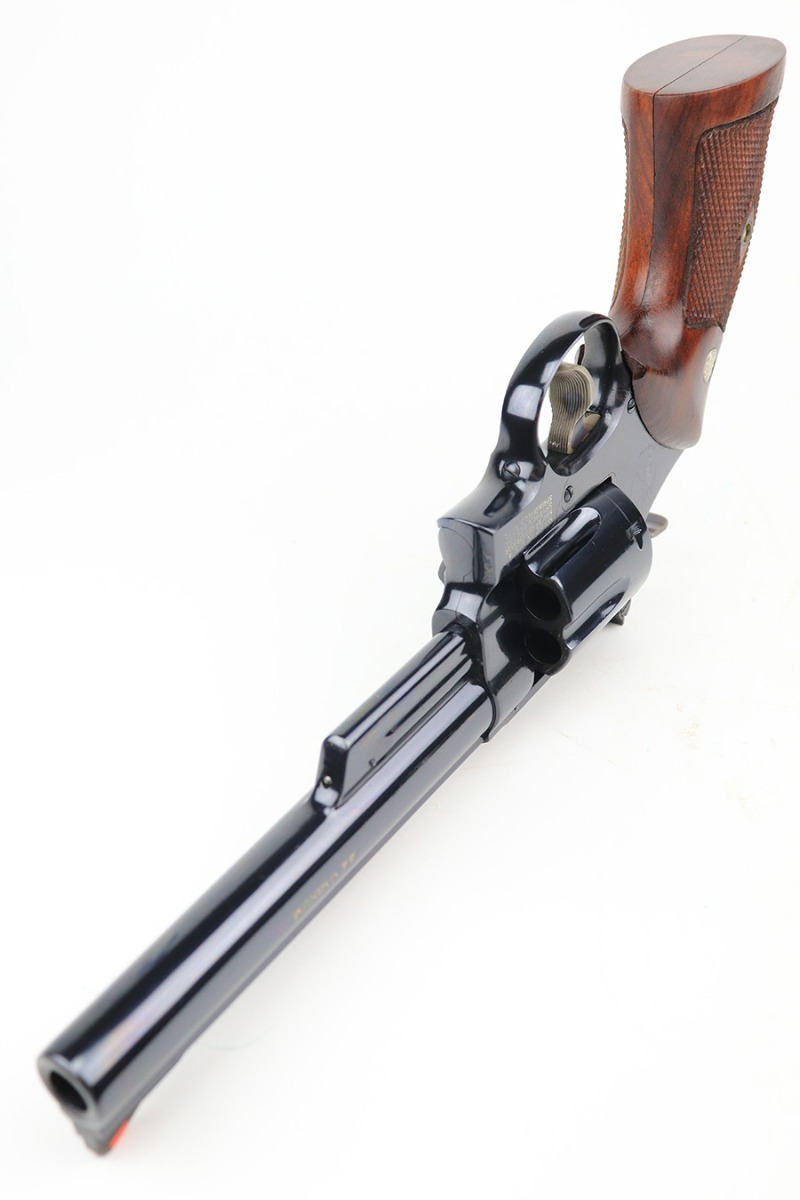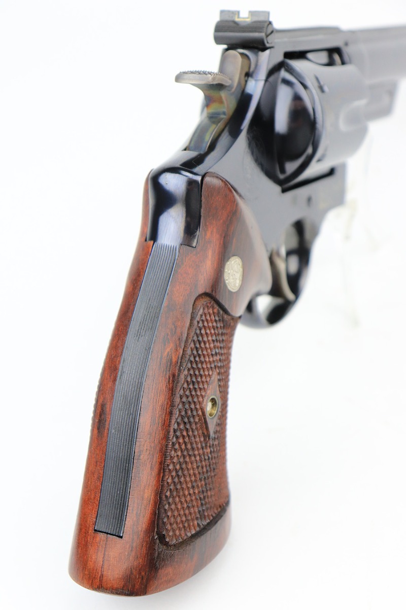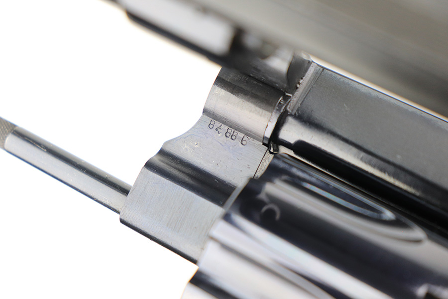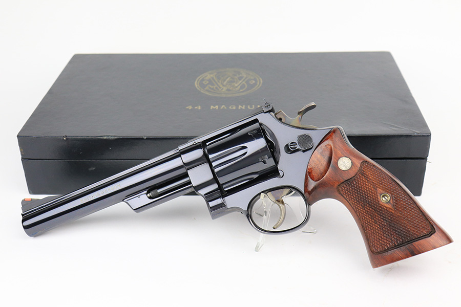 5/20/22 – This is a minty Smith & Wesson Pre-Model 29 in the black/blue factory S&W case. It is chambered for .44 magnum and has a 6.5in barrel. It’s accompanied by a S&W factory letter stating this gun shipping to a retailer in Chicago in January of 1960. The gun has 99% of the blue remaining with a very minor turn line on the cylinder. Minty bore and grips. Grips are not numbered. The case is in excellent condition and comes with the brush set.