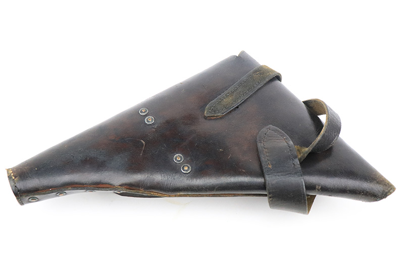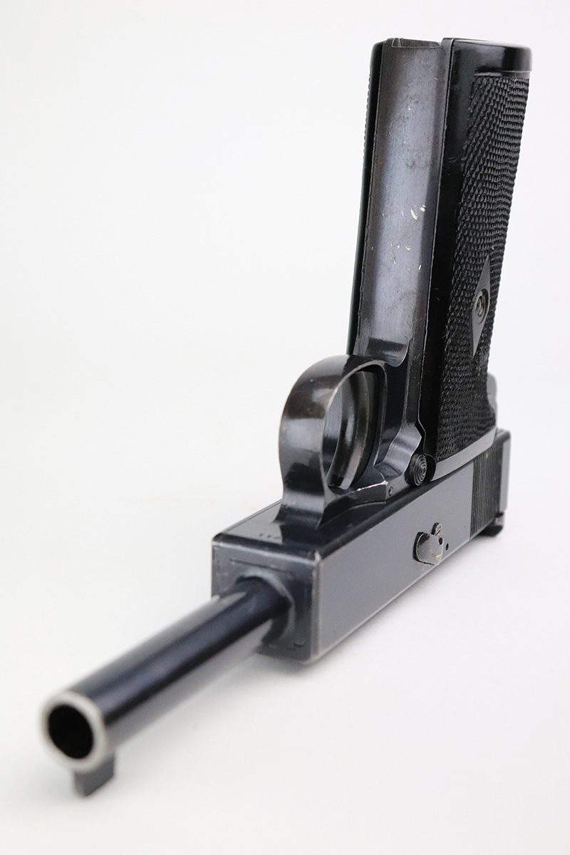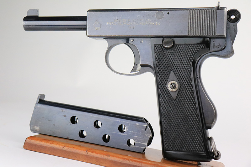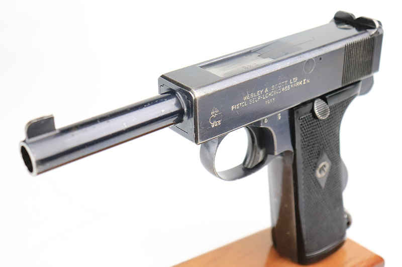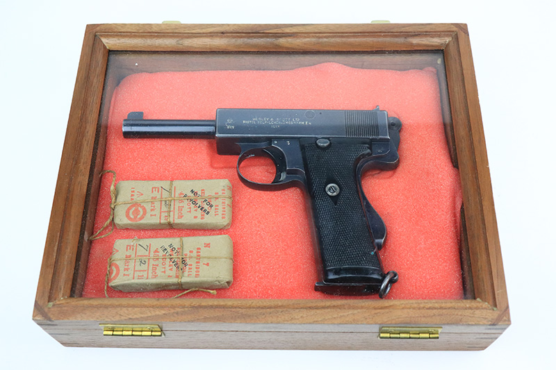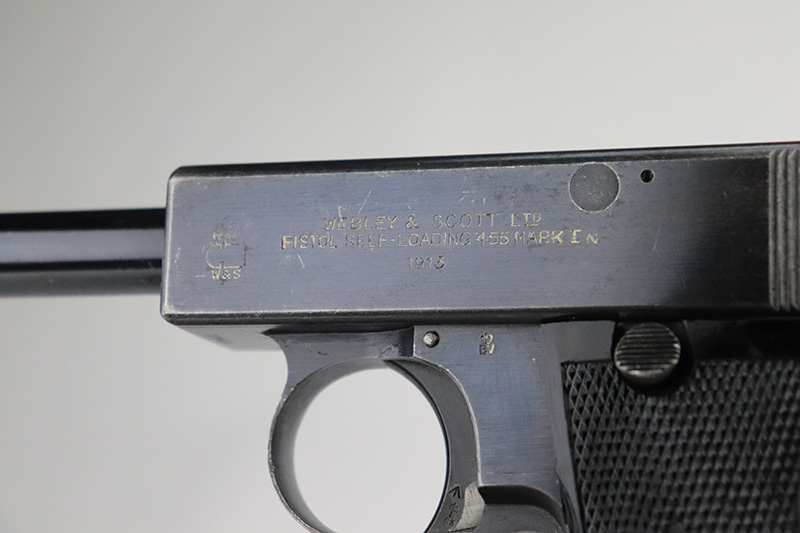 8/26/22 – This is an all original, matching and correct WWI example of Webley semi-auto pistol in .455 caliber. It is one of the Royal Navy contract guns, marked with an “N” for Navy on the left side of the slide. The pistol is also 1913 dated (date of manufacture). It comes with a very nice wood and glass presentation case, an original shoulder holster, and two mint un-opened packages of original ammunition (dated 7/2/19). The gun itself has retained about 92-93% of its original finish. Generally, there is minor muzzle wear and wear around the high edges. Very minor thinning on both grip straps and on both sides of the slide. Tiny scratches on both sides of the slide and on the grip straps. Comes with excellent black bakelite grips and one proper magazine. Minty bore.