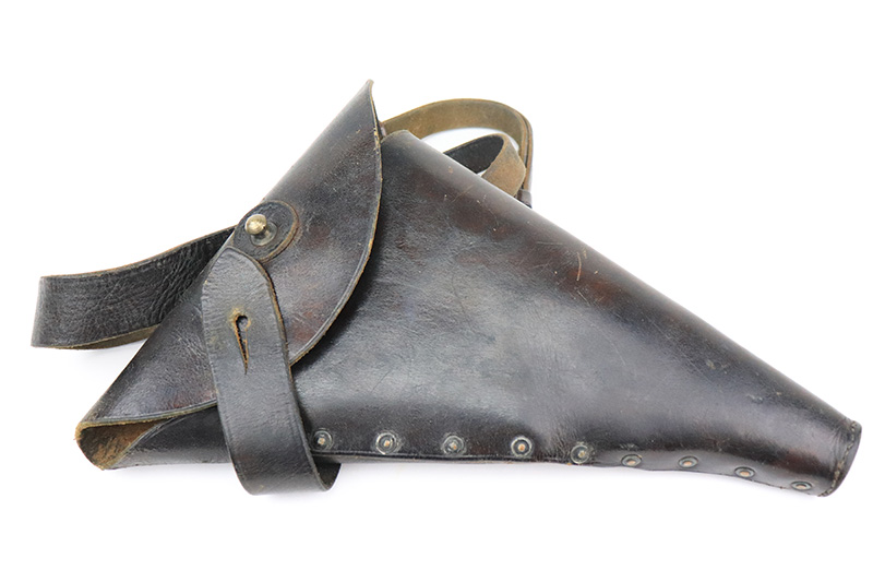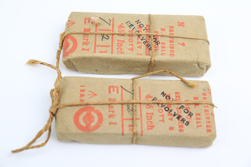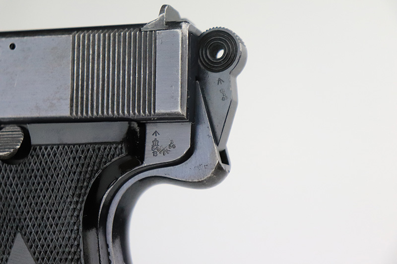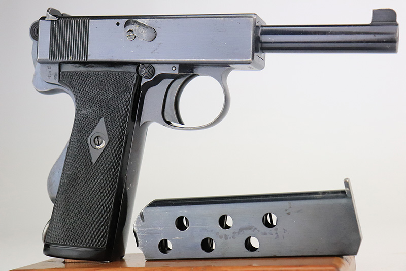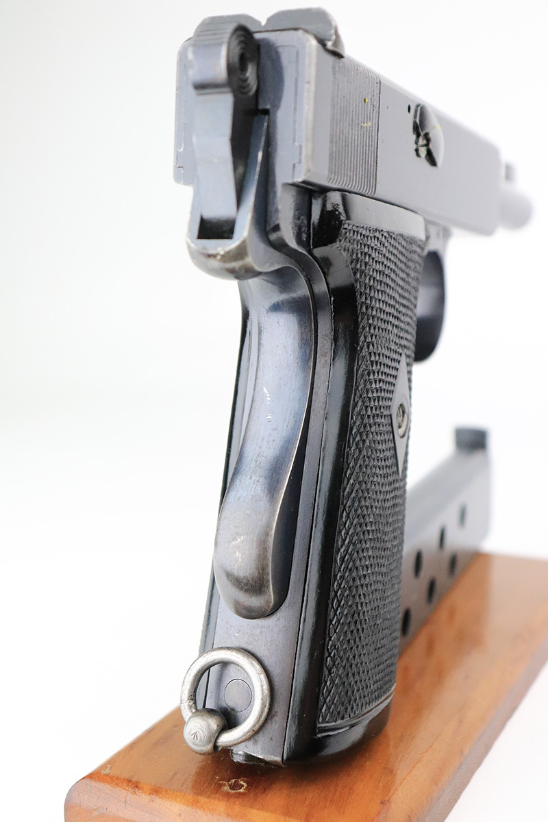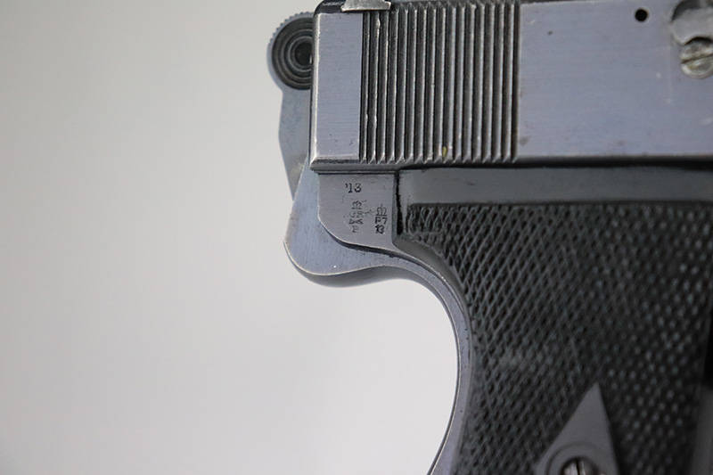 8/26/22 – This is an all original, matching and correct WWI example of Webley semi-auto pistol in .455 caliber. It is one of the Royal Navy contract guns, marked with an “N” for Navy on the left side of the slide. The pistol is also 1913 dated (date of manufacture). It comes with a very nice wood and glass presentation case, an original shoulder holster, and two mint un-opened packages of original ammunition (dated 7/2/19). The gun itself has retained about 92-93% of its original finish. Generally, there is minor muzzle wear and wear around the high edges. Very minor thinning on both grip straps and on both sides of the slide. Tiny scratches on both sides of the slide and on the grip straps. Comes with excellent black bakelite grips and one proper magazine. Minty bore.