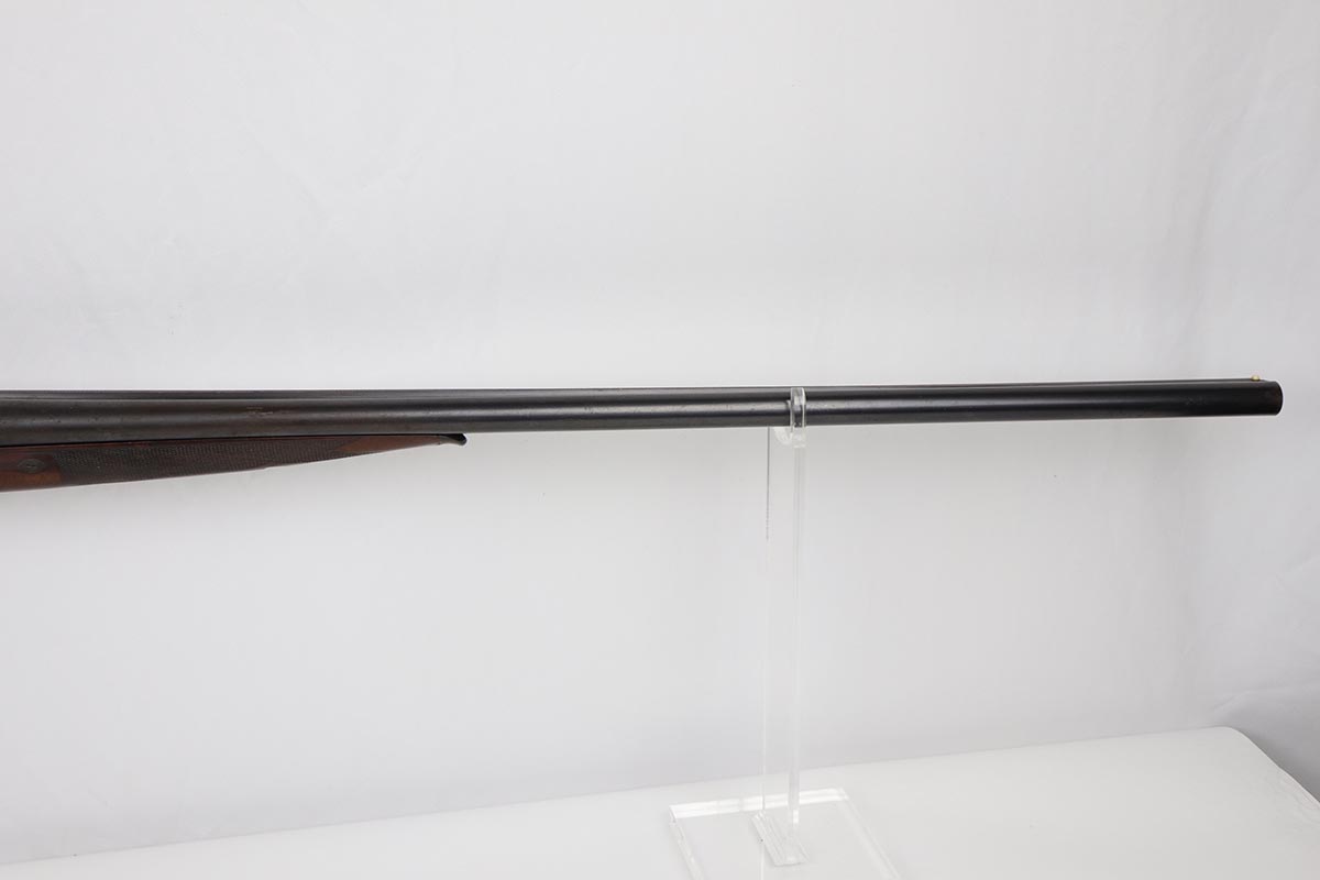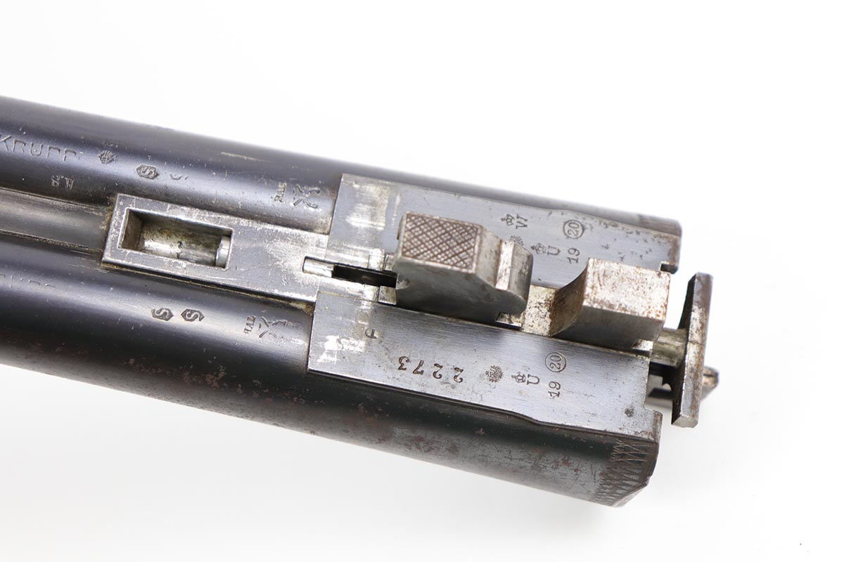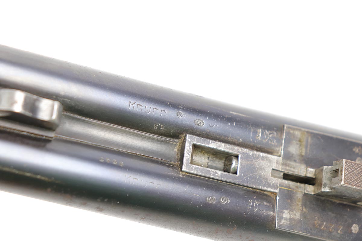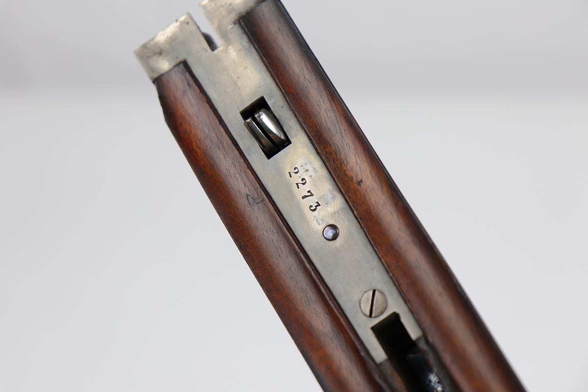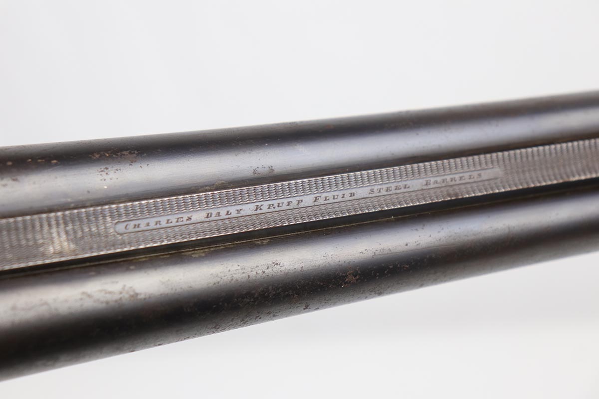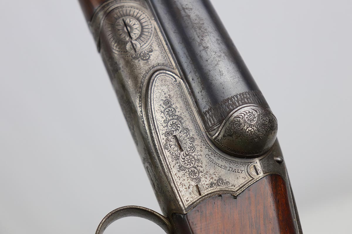 11/26/19 – This is a scarce Charles Daly SXS shotgun from the 1910s. It is PRUSSIA marked with Crown/U proofs, and chambered for 20 gauge shells. One barrel is cyl, the other is IM (improved modified). 28 inch barrels with 14.25 inch pull. Von Lengerke & Detmold have two records of receiving the shotgun in the 1910s and 1920s, with records of sale to private customers. The bluing on the barrels shows only minor finish loss, but there is notable patination towards the receiver end, and some oxidation. Nice engraving is present on the receiver. Stock is in very good condition with minor dings and nicks but no major cracks or chips. Bores are excellent.