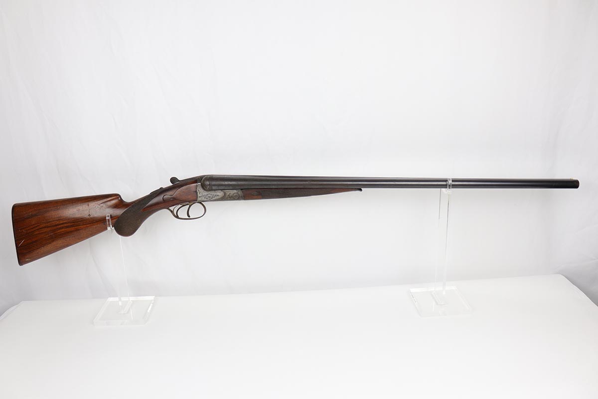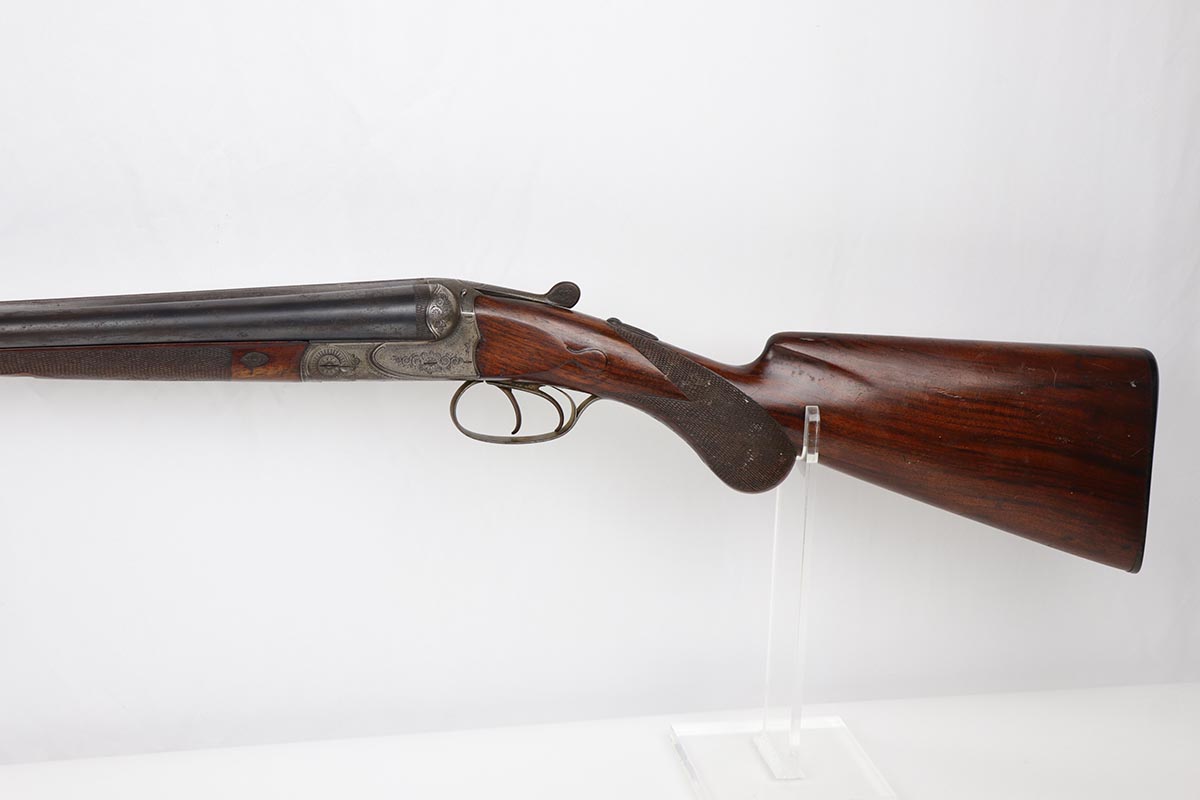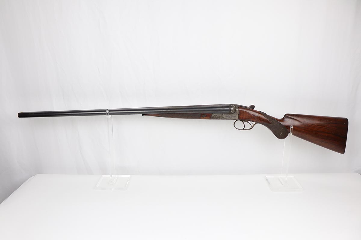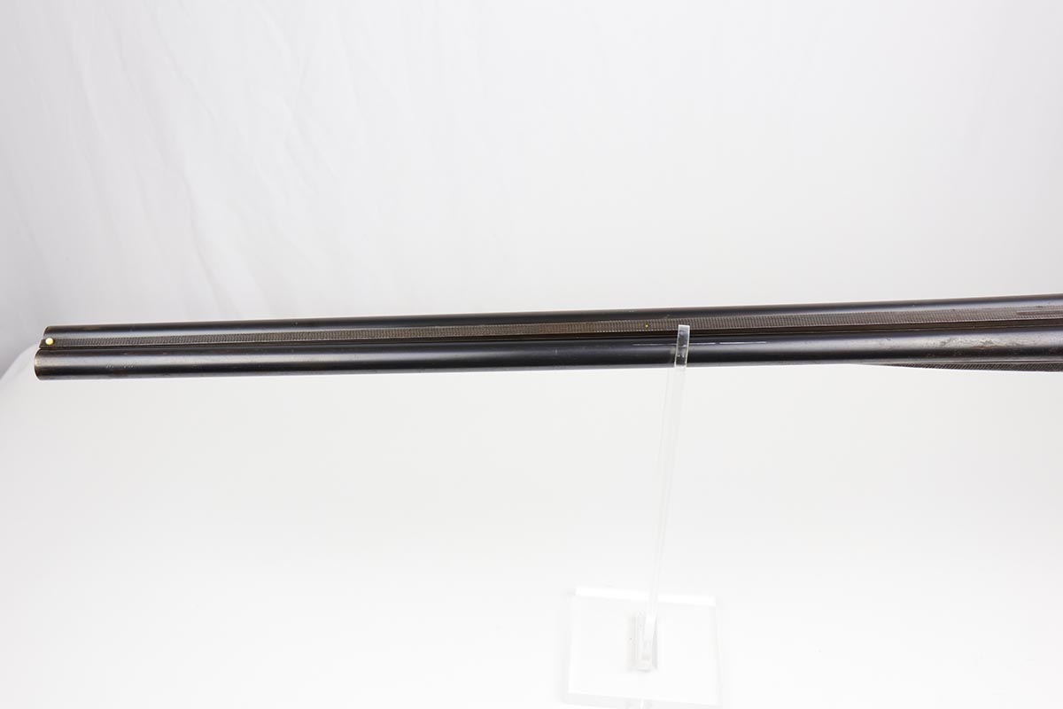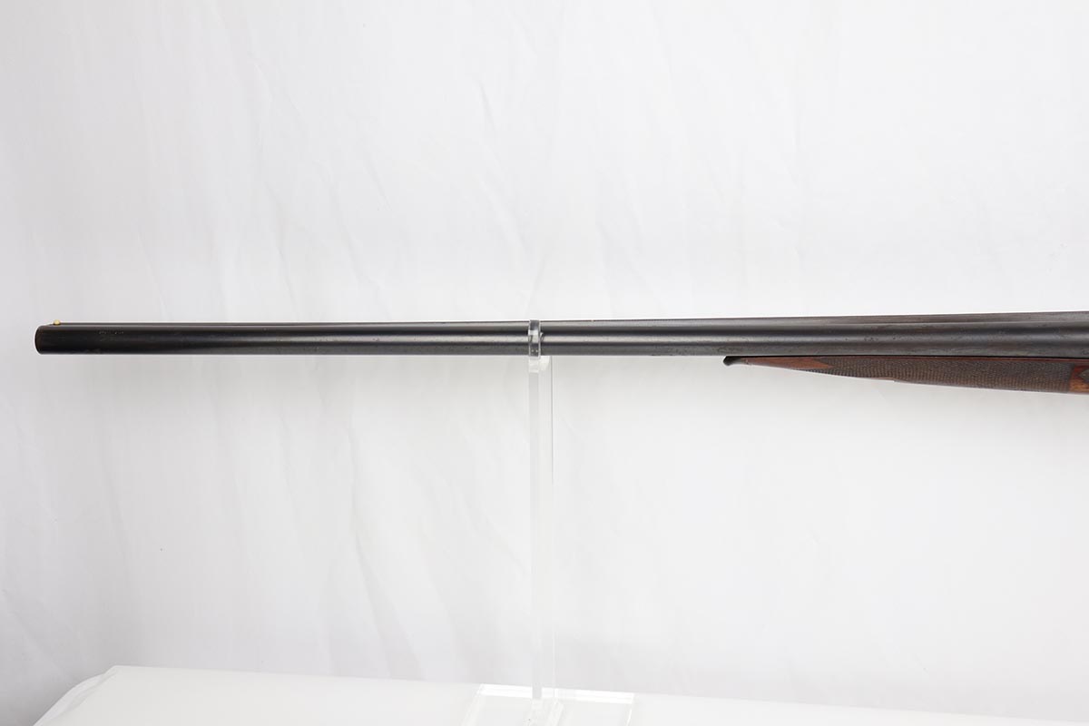 11/26/19 – This is a scarce Charles Daly SXS shotgun from the 1910s. It is PRUSSIA marked with Crown/U proofs, and chambered for 20 gauge shells. One barrel is cyl, the other is IM (improved modified). 28 inch barrels with 14.25 inch pull. Von Lengerke & Detmold have two records of receiving the shotgun in the 1910s and 1920s, with records of sale to private customers. The bluing on the barrels shows only minor finish loss, but there is notable patination towards the receiver end, and some oxidation. Nice engraving is present on the receiver. Stock is in very good condition with minor dings and nicks but no major cracks or chips. Bores are excellent.