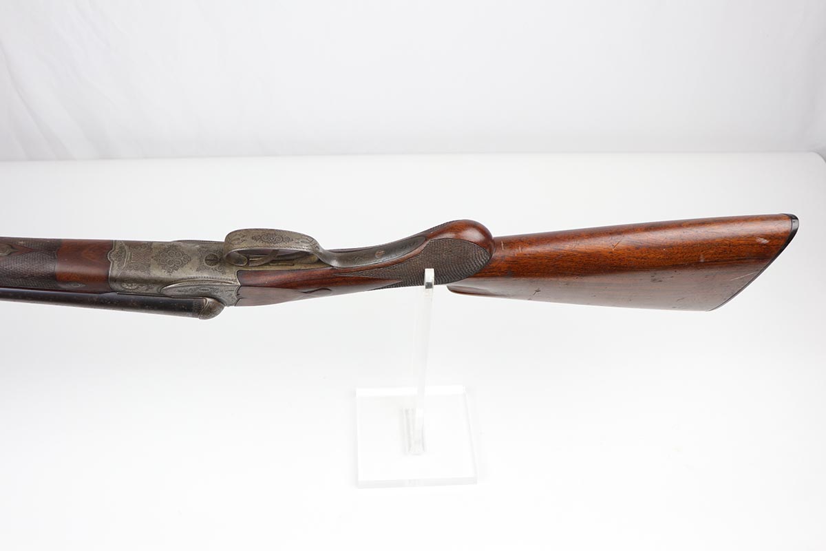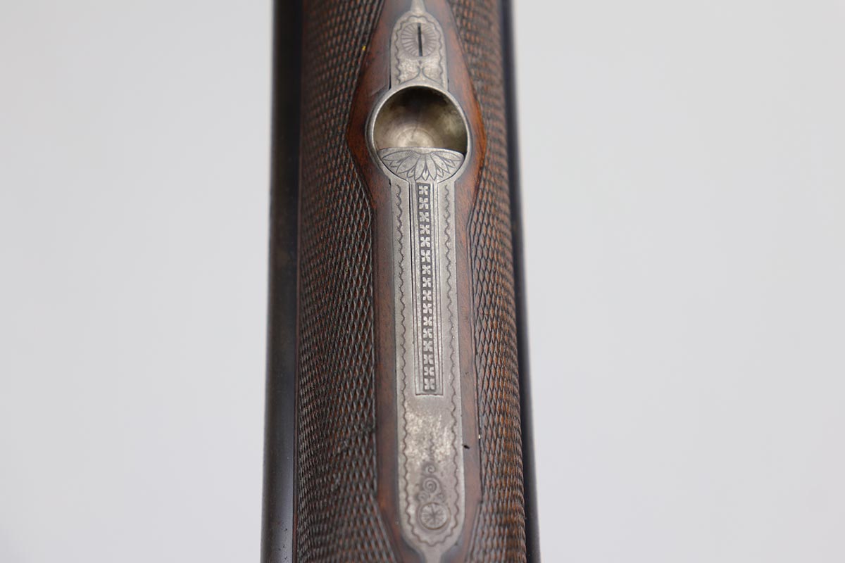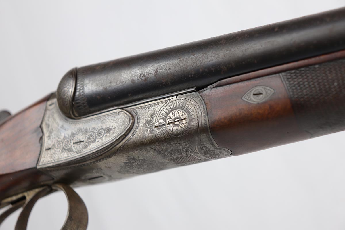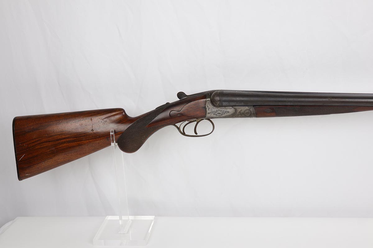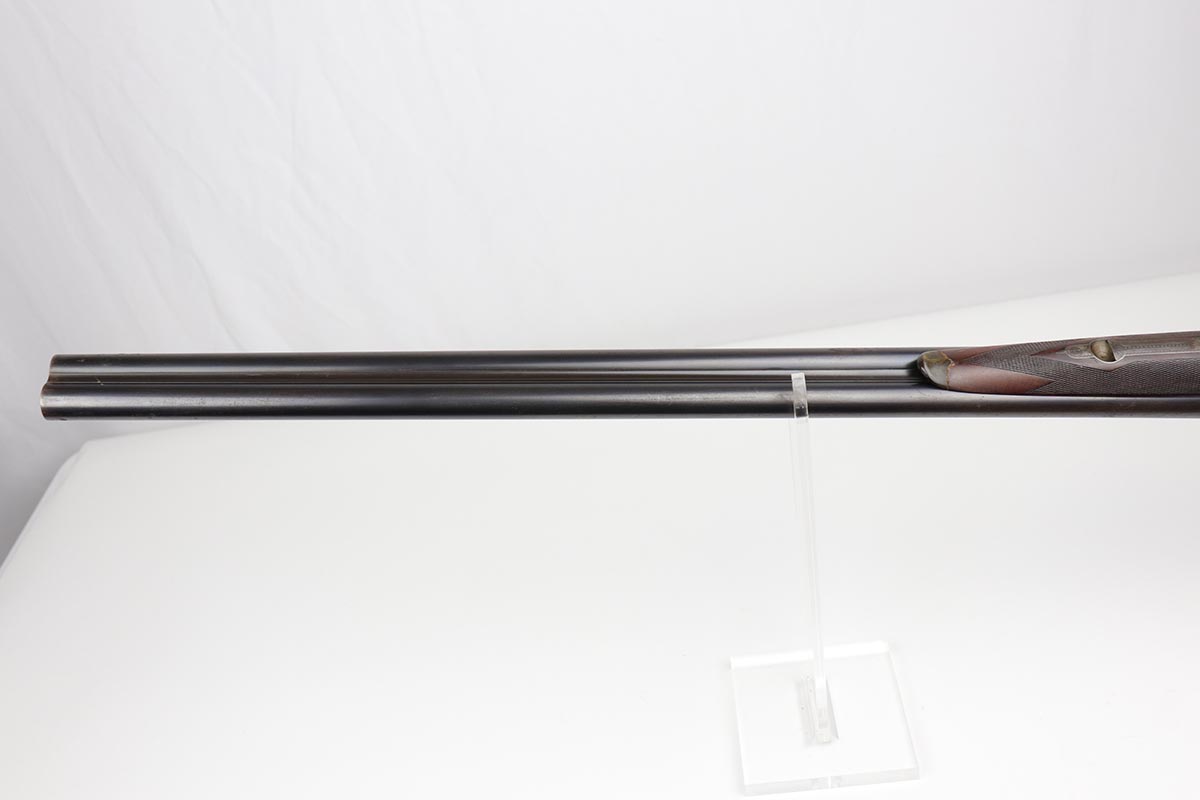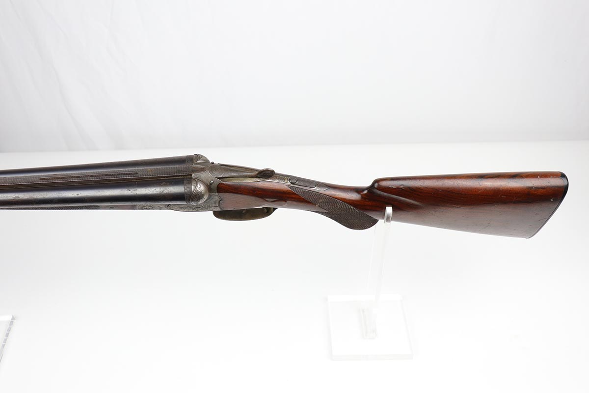11/26/19 – This is a scarce Charles Daly SXS shotgun from the 1910s. It is PRUSSIA marked with Crown/U proofs, and chambered for 20 gauge shells. One barrel is cyl, the other is IM (improved modified). 28 inch barrels with 14.25 inch pull. Von Lengerke & Detmold have two records of receiving the shotgun in the 1910s and 1920s, with records of sale to private customers. The bluing on the barrels shows only minor finish loss, but there is notable patination towards the receiver end, and some oxidation. Nice engraving is present on the receiver. Stock is in very good condition with minor dings and nicks but no major cracks or chips. Bores are excellent.