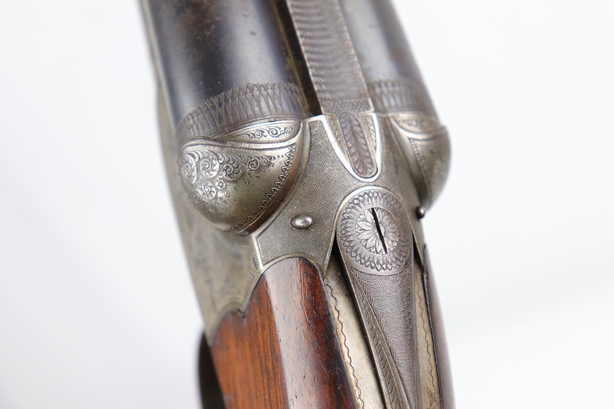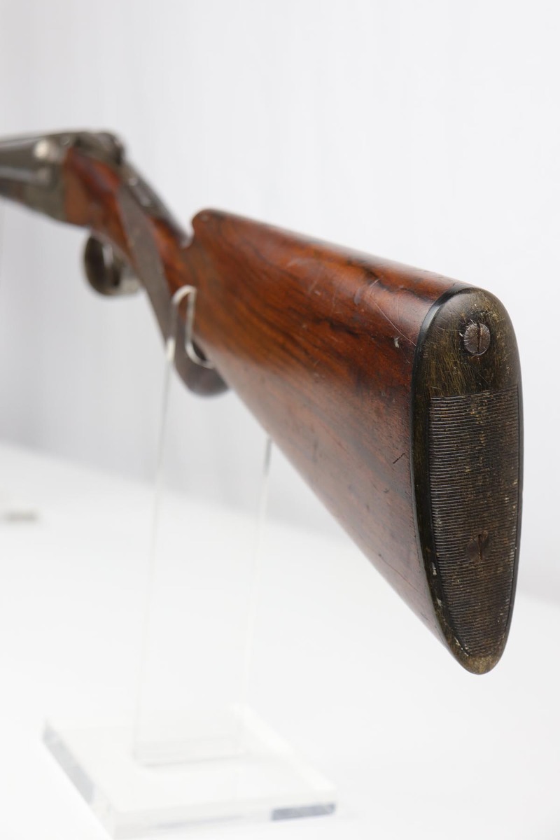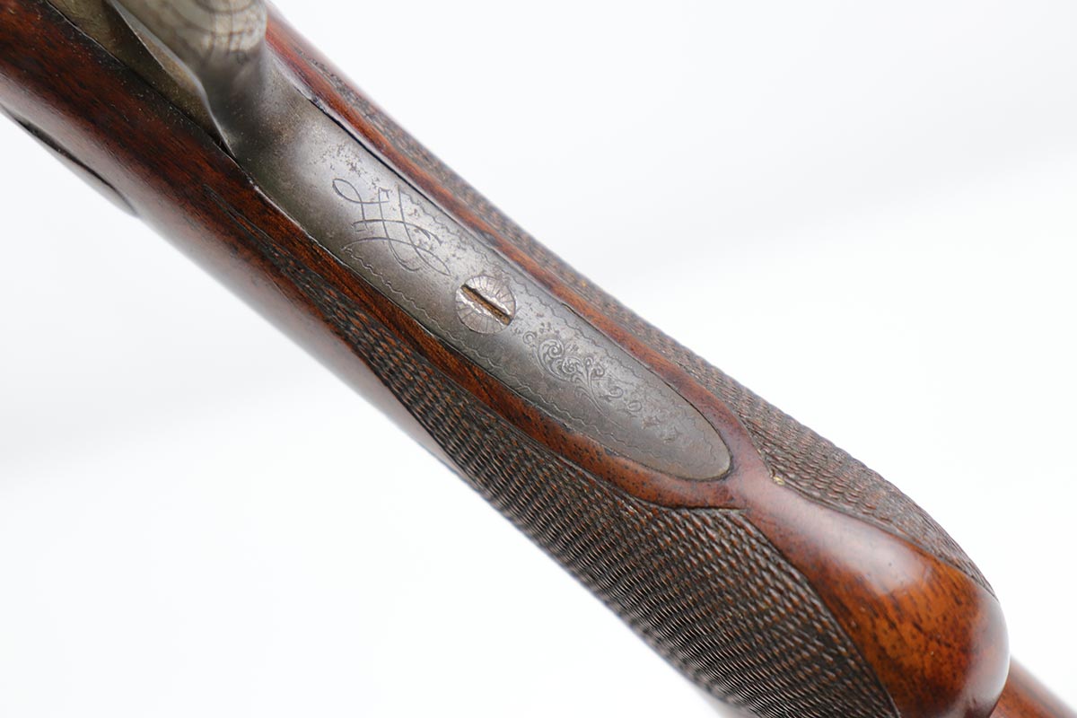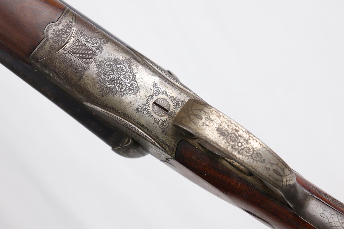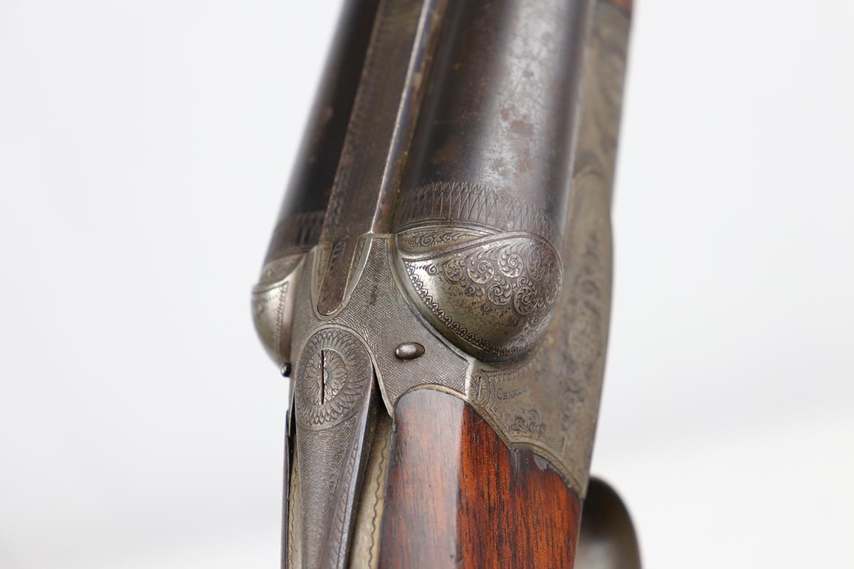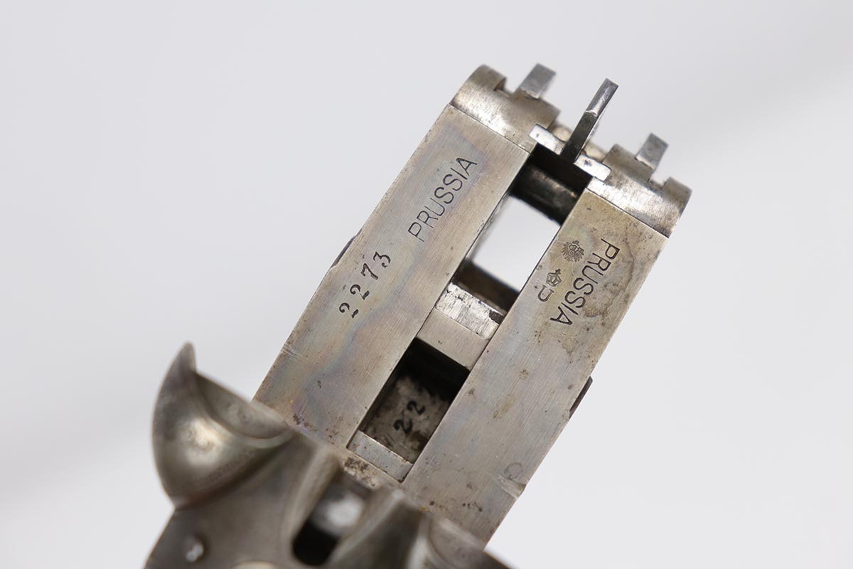 11/26/19 – This is a scarce Charles Daly SXS shotgun from the 1910s. It is PRUSSIA marked with Crown/U proofs, and chambered for 20 gauge shells. One barrel is cyl, the other is IM (improved modified). 28 inch barrels with 14.25 inch pull. Von Lengerke & Detmold have two records of receiving the shotgun in the 1910s and 1920s, with records of sale to private customers. The bluing on the barrels shows only minor finish loss, but there is notable patination towards the receiver end, and some oxidation. Nice engraving is present on the receiver. Stock is in very good condition with minor dings and nicks but no major cracks or chips. Bores are excellent.