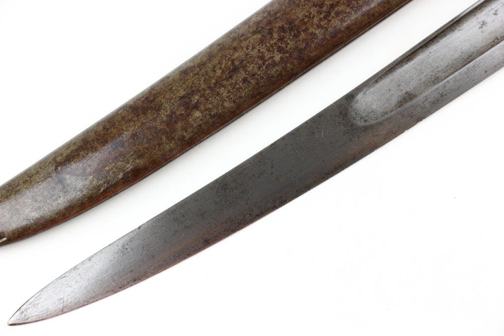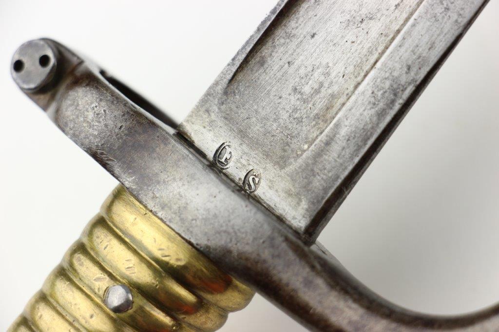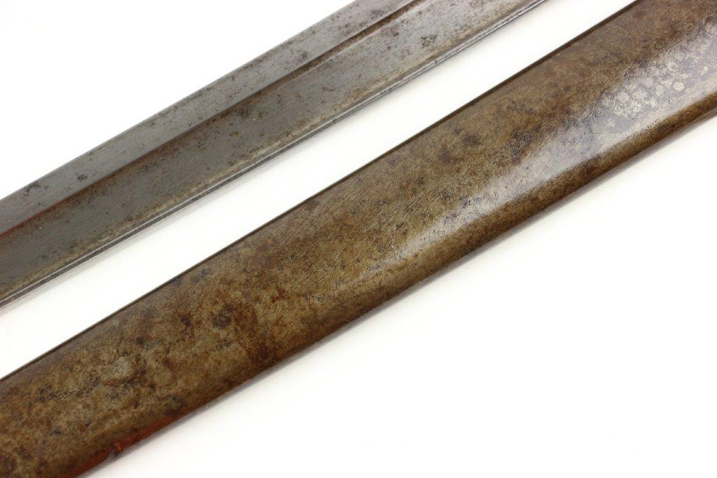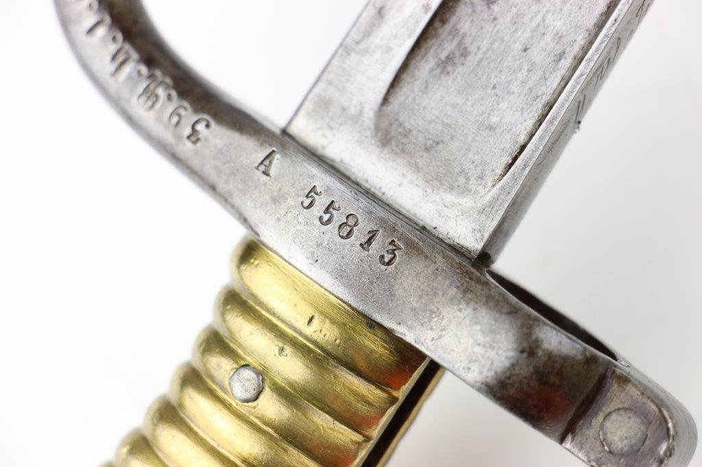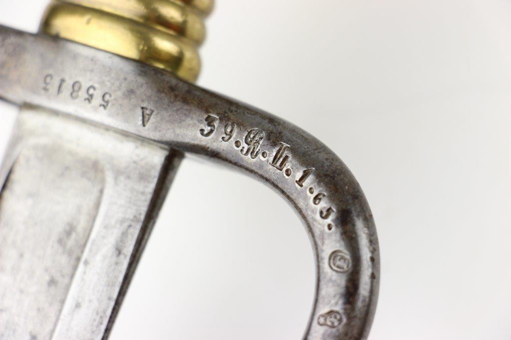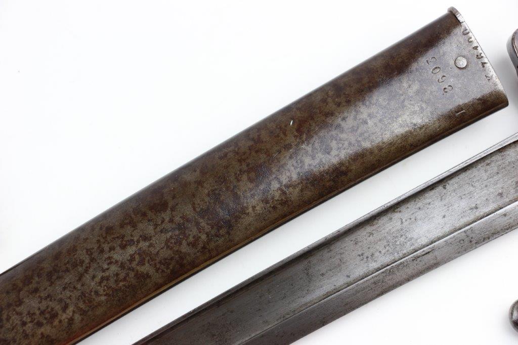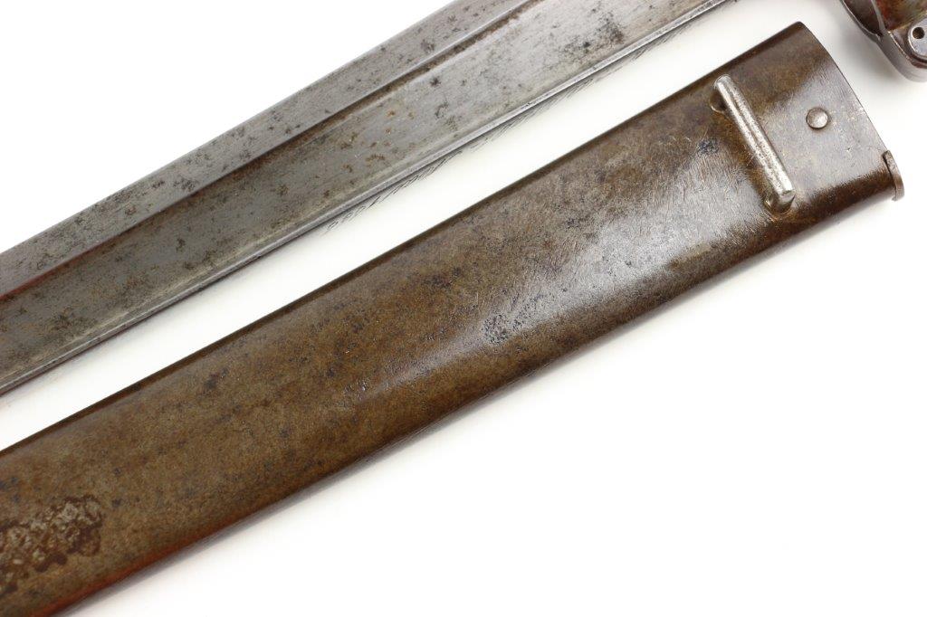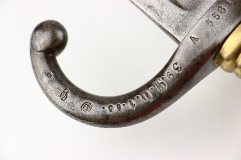 6/15/24 – This is an original 1868 production Chassepot M1866 Sword Rifle Bayonet. The bayonet is in very good overall condition and comes with an original scabbard (non-matching). The bayonet blade is in great shape with natural surface oxidation and light patina throughout. The edge is fairly clean and unsharpened, with a few small nicks and dings from use. The spine of the blade indicates this was made by Chatellerault arsenal. Great condition hooked quillion and brass handle. Functional release button. The scabbard has natural patina throughout and is well marked, as shown. No dents or major issues.