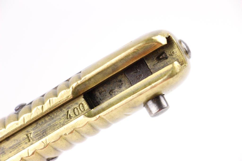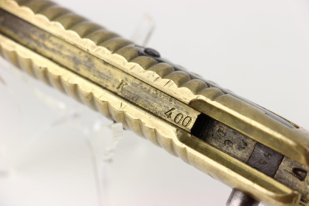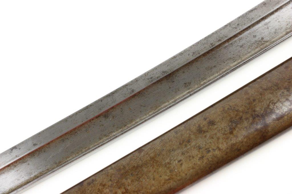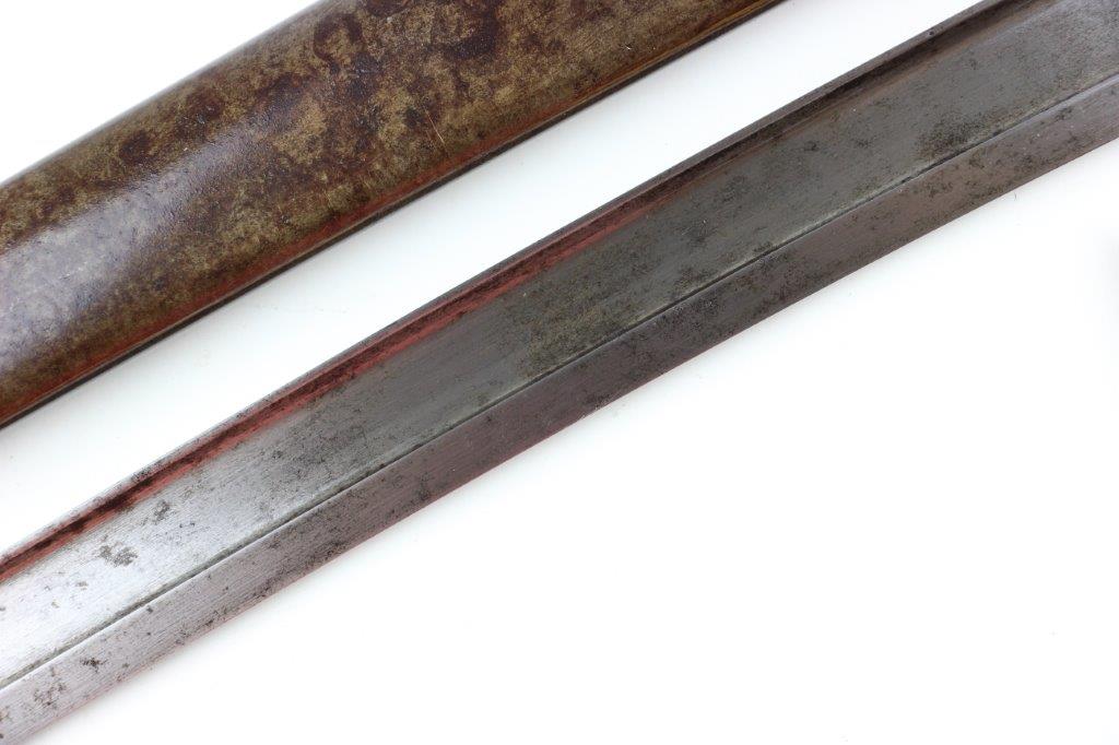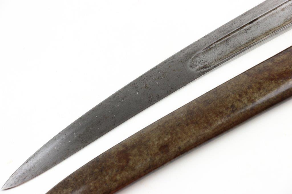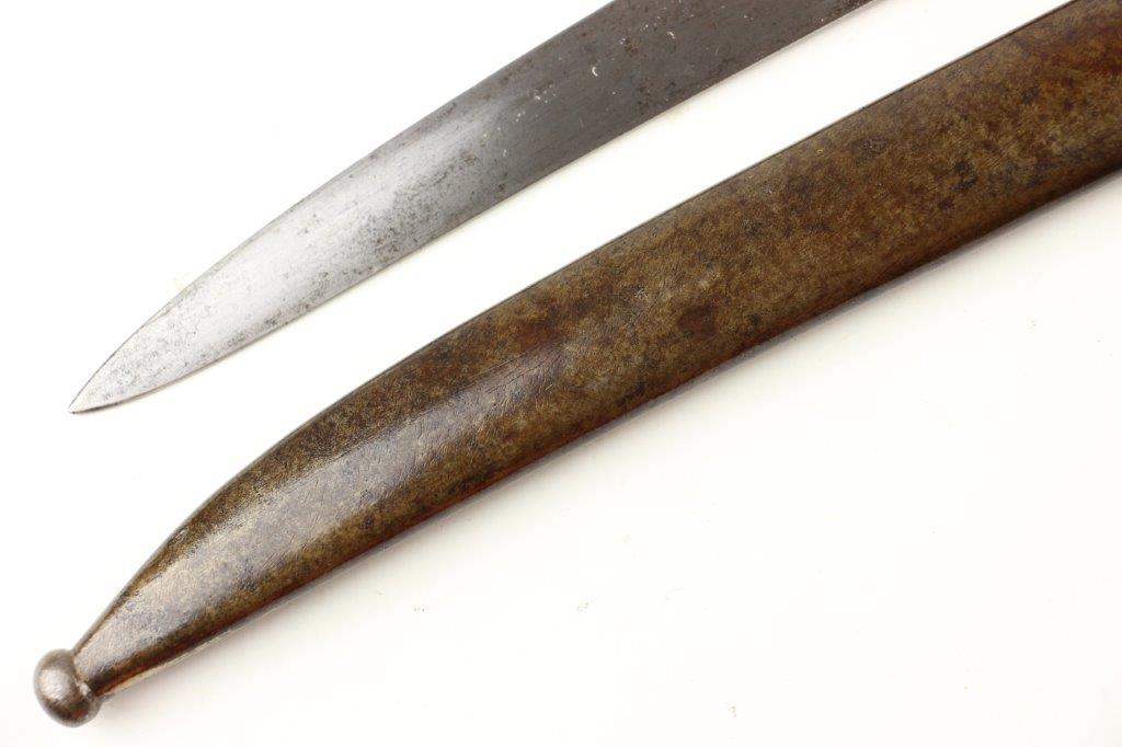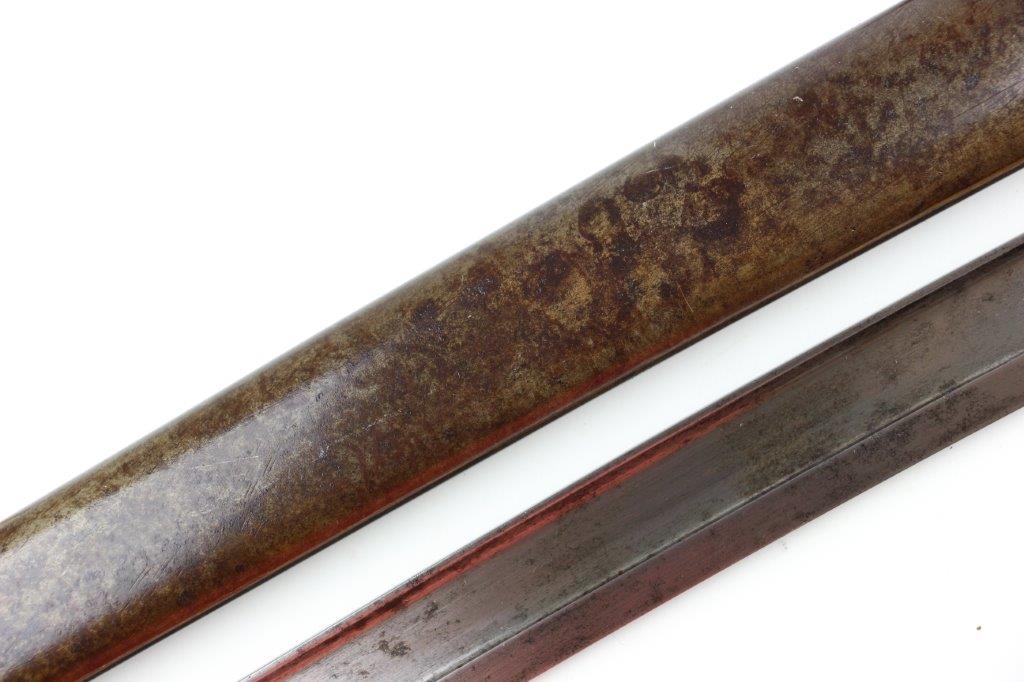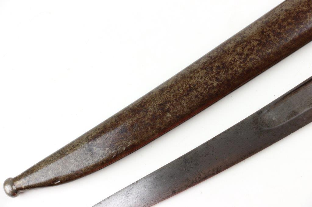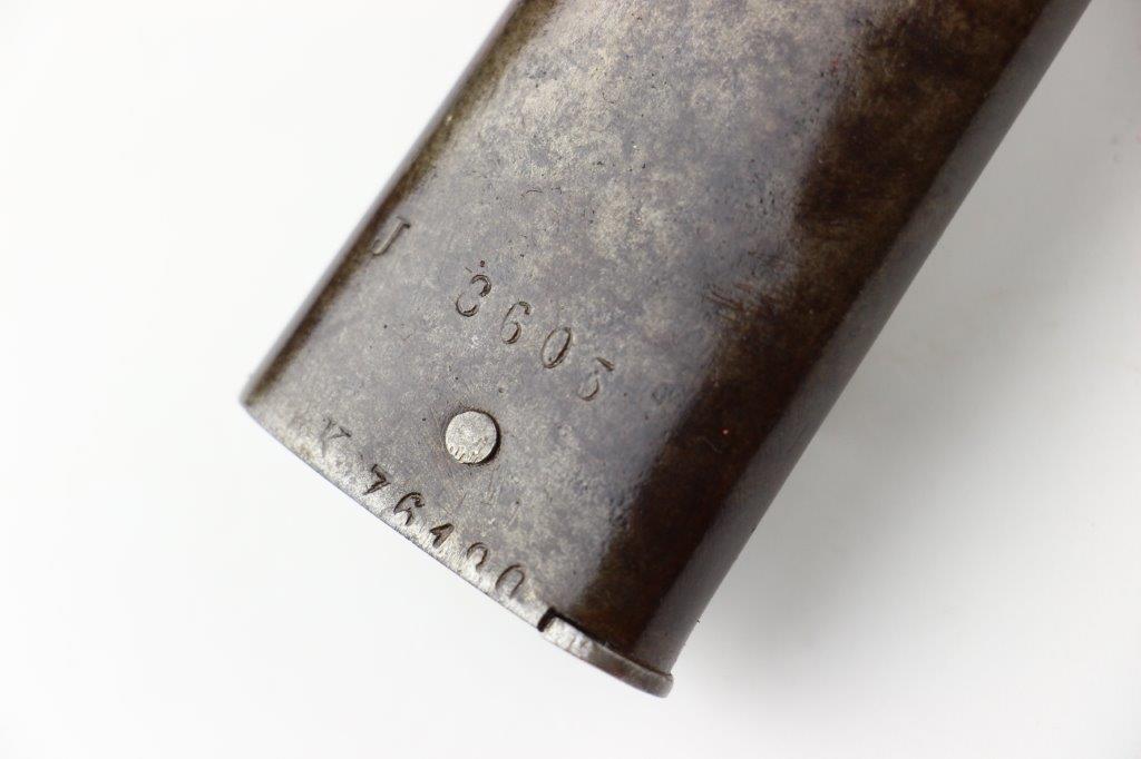 6/15/24 – This is an original 1868 production Chassepot M1866 Sword Rifle Bayonet. The bayonet is in very good overall condition and comes with an original scabbard (non-matching). The bayonet blade is in great shape with natural surface oxidation and light patina throughout. The edge is fairly clean and unsharpened, with a few small nicks and dings from use. The spine of the blade indicates this was made by Chatellerault arsenal. Great condition hooked quillion and brass handle. Functional release button. The scabbard has natural patina throughout and is well marked, as shown. No dents or major issues.