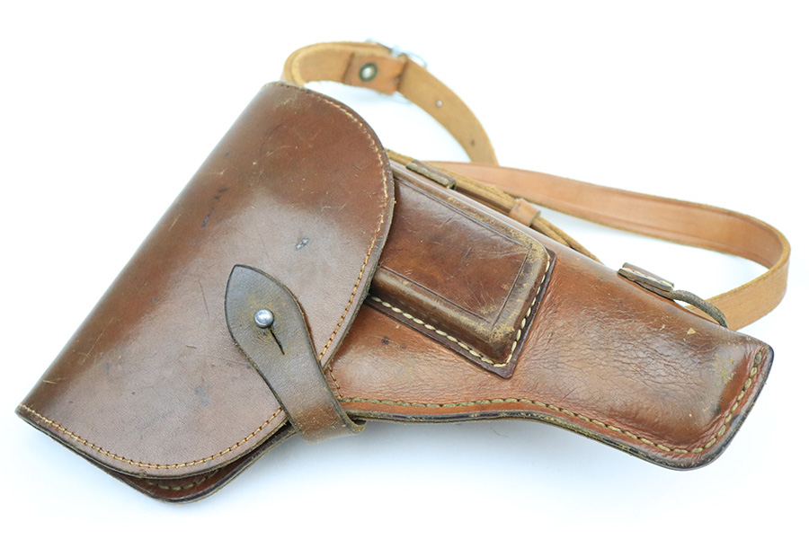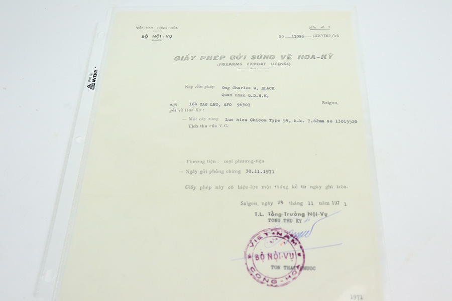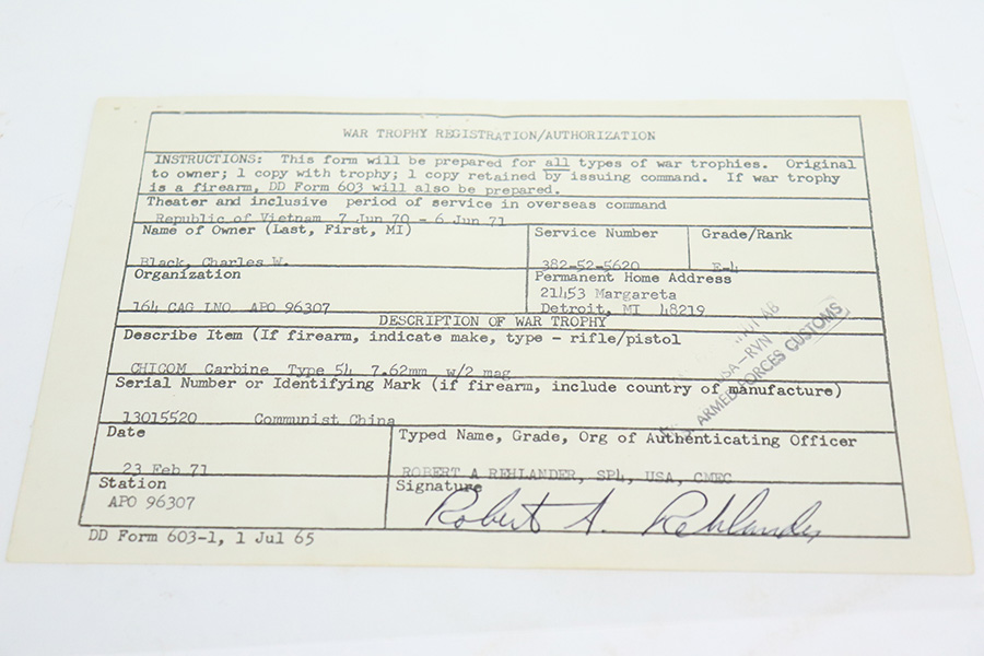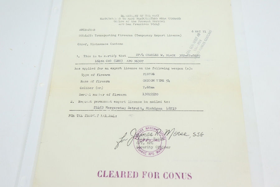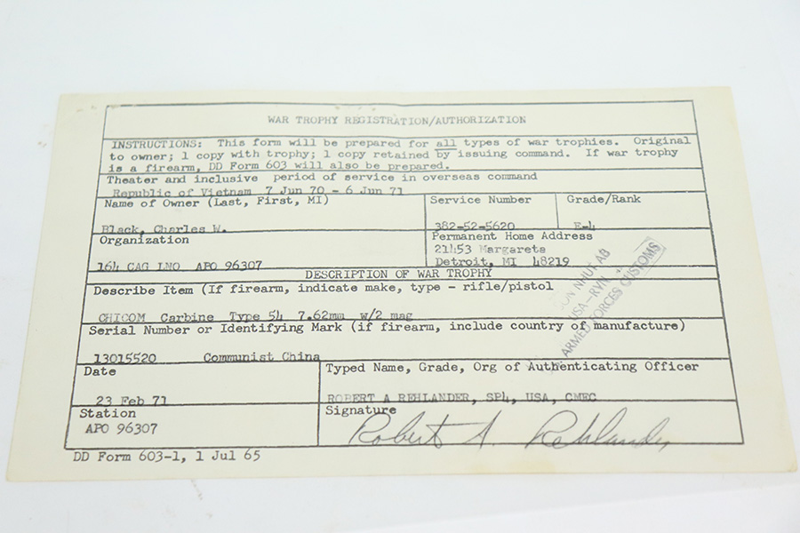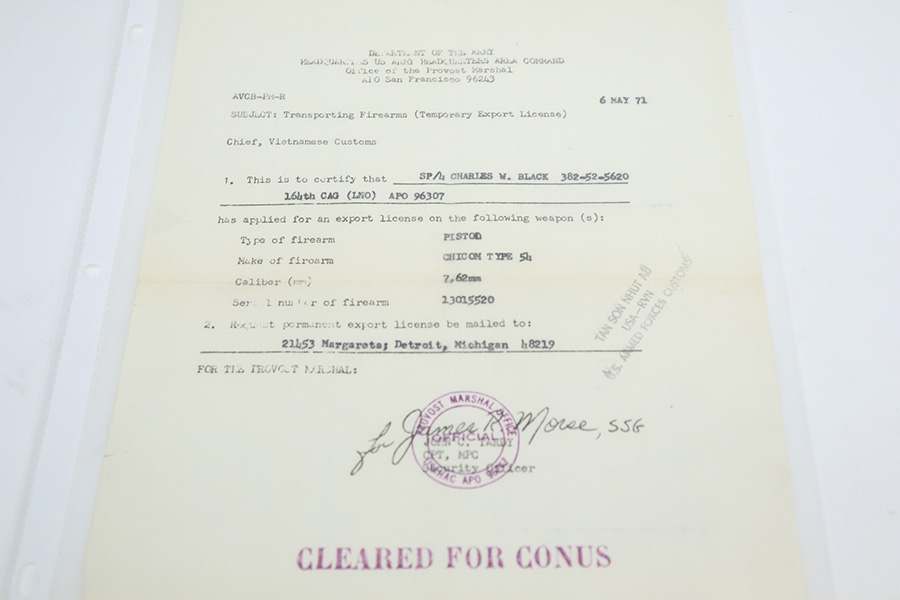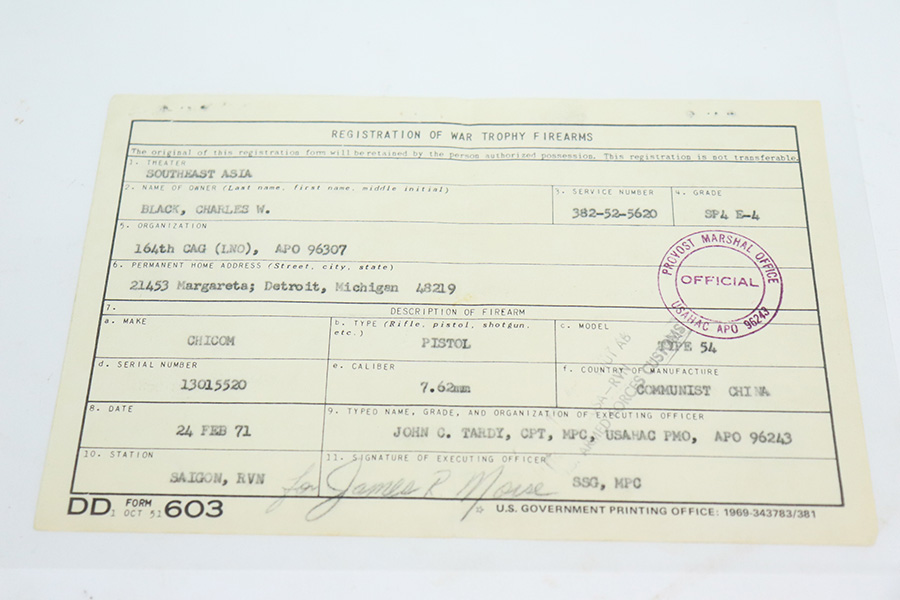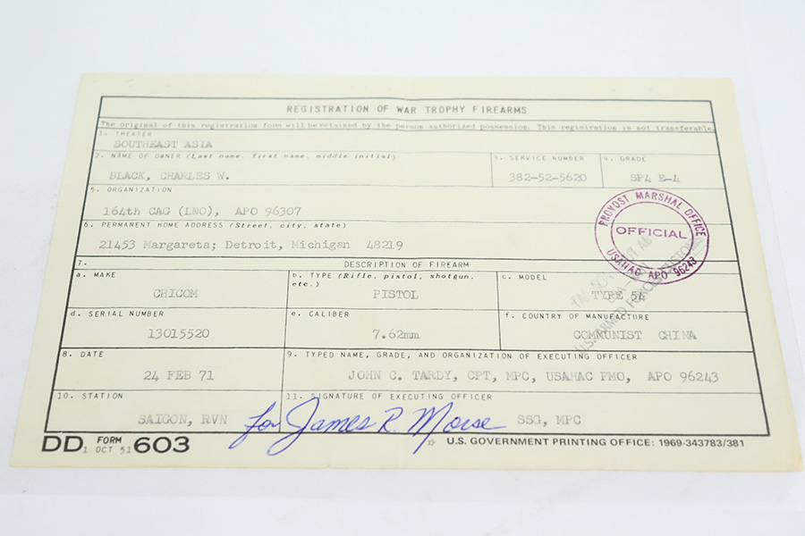 6/9/22 – This is a scarce Chicom Tokarev Type 54 rig with all of the export/capture documentation when it was brought back from Vietnam. Charles W. Black of the 164th CAG (LNO) captured this one, and kept the war trophy registration paperwork, as well as export licenses for the item. The pistol doesn’t have a ton of bluing loss but the patina on the straps is noticeable and there is oxidation throughout on the slide. The pistol is matching numbers but both magazines are mismatched. Terrific bore and grips. Comes with the original holster and has a belt included. No import marks.