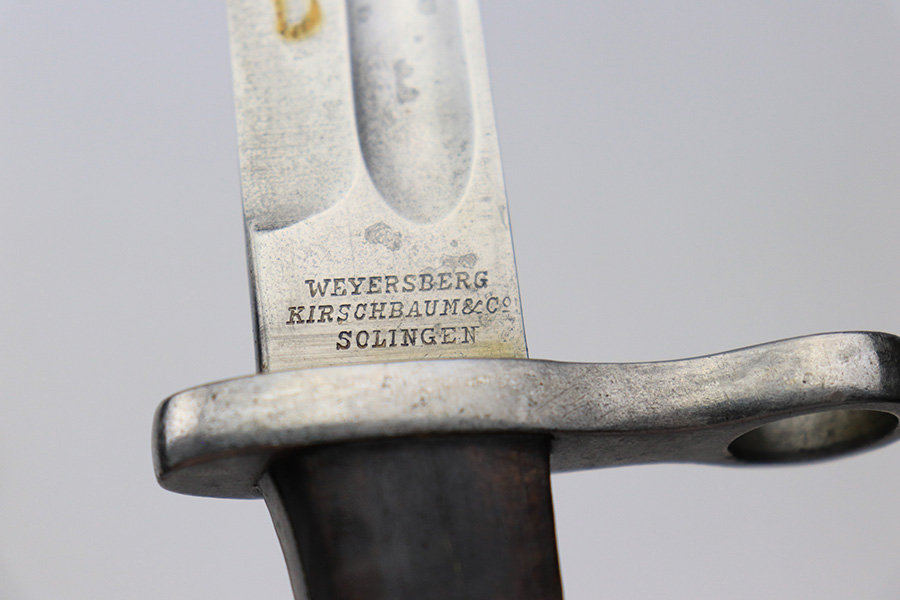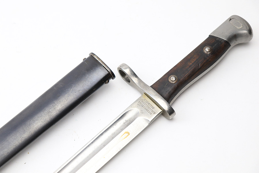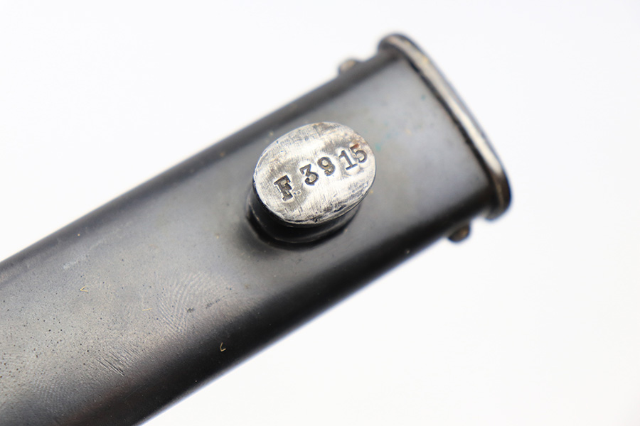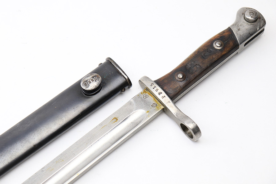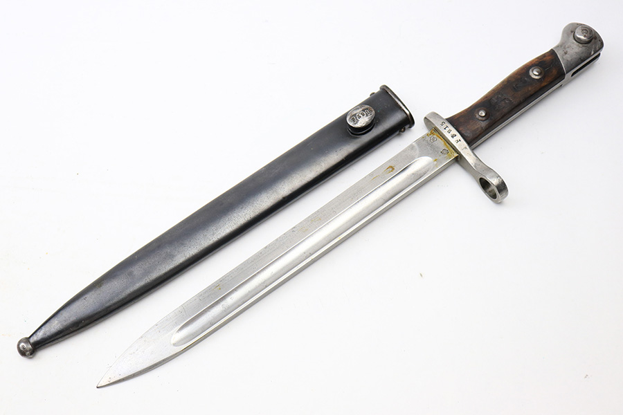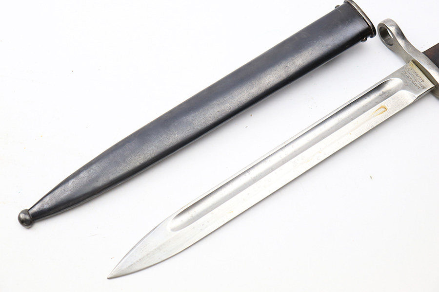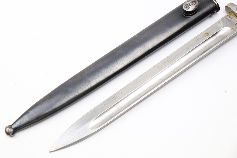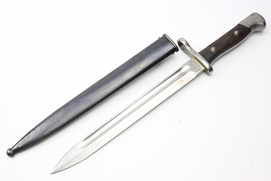 5/31/22 – This is an original Chilean Mauser K98 bayonet. The bayonet comes with an original matching numbered scabbard. The blade on this example is very clean with a Weyersberg Kirschbaum maker stamp on one side of the ricasso, and a Chilean proof on the other side. No signs of sharpening. There’s some mild surface oxidation on the blade and hilt, but no rust or pitting. Great overall condition as shown. Nice bluing throughout the scabbard.