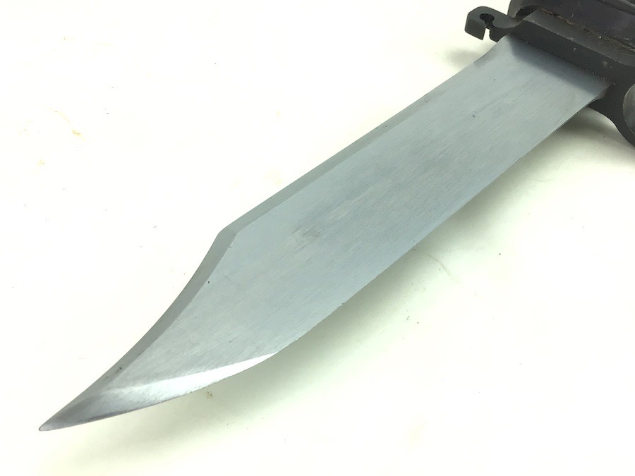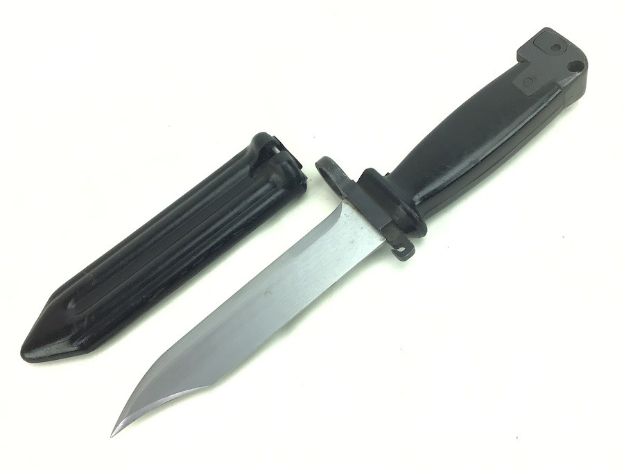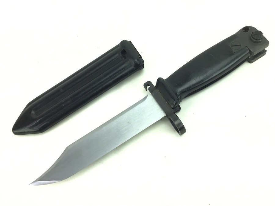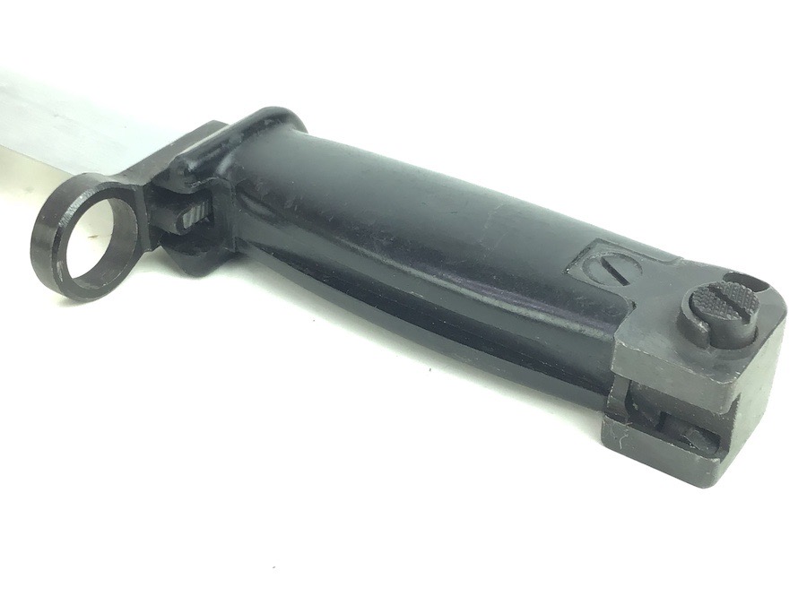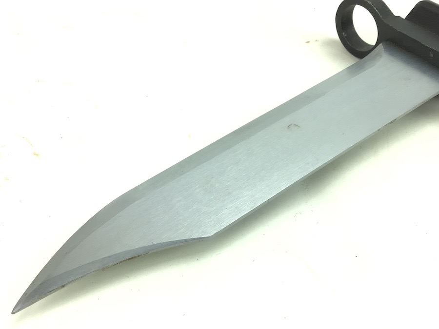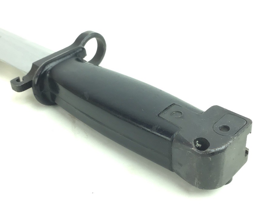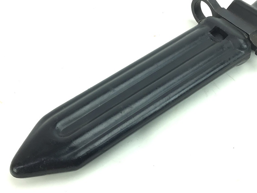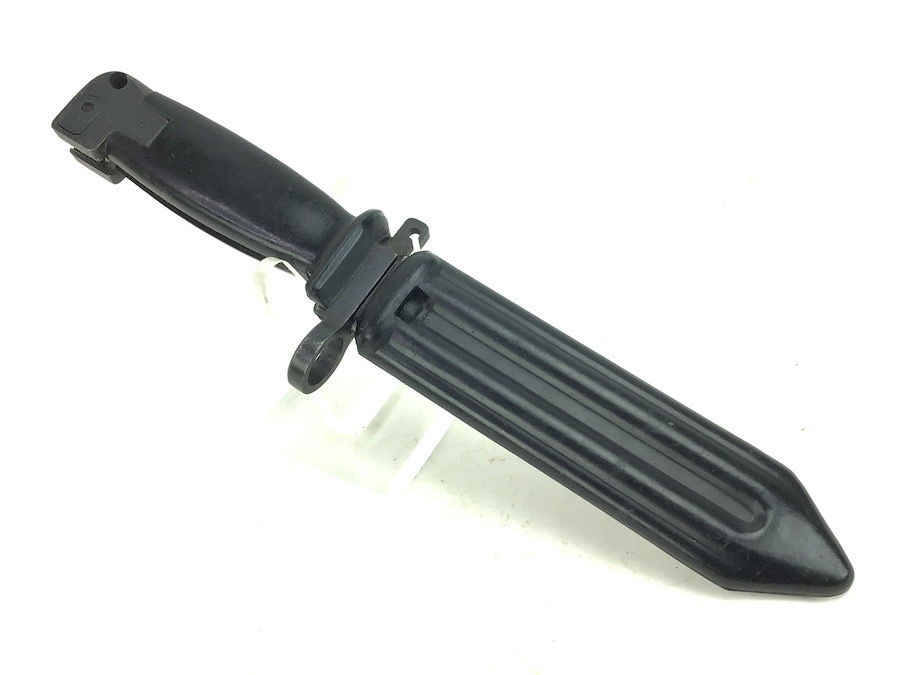 9/5/24 – Excellent condition. We believe this to be a Chinese made, AK-47 AKM Type II Bayonet w/ Scabbard. There are no markings on the knife or the scabbard. Knife features clip point blade, plastic handle, and square metal pommel. Scabbard is made of hard mold injected plastic. Minimal wear. Blade length of 6in and overall length of 10-3/4in.