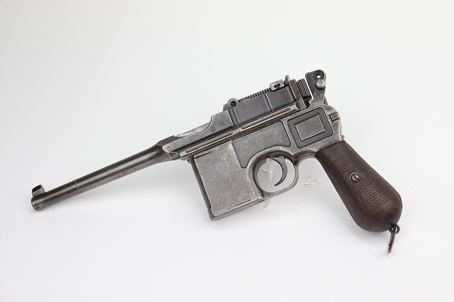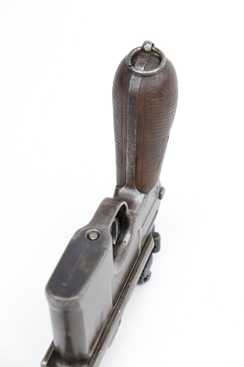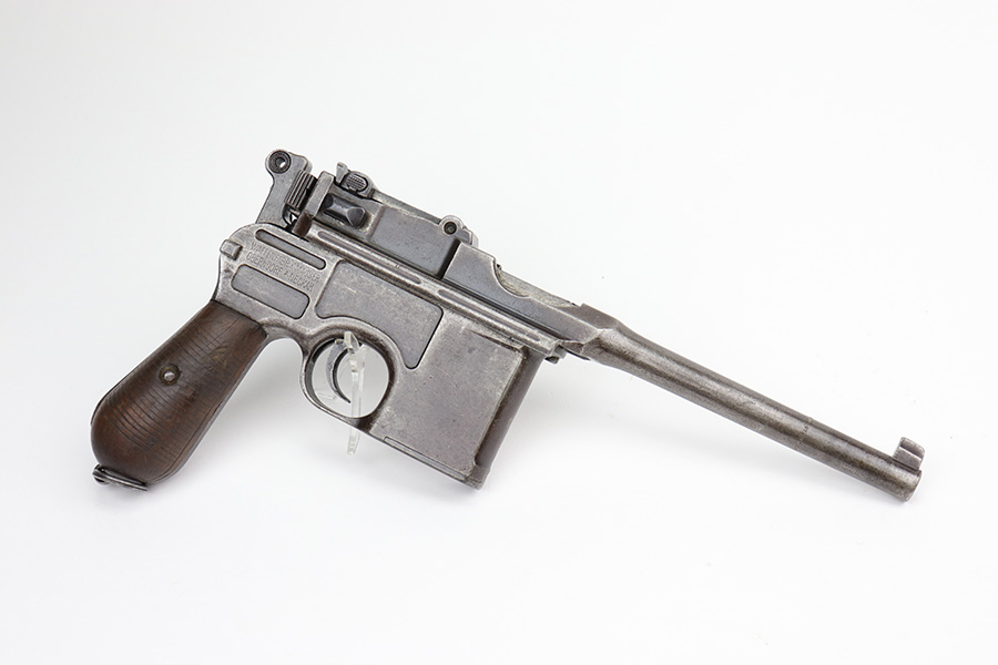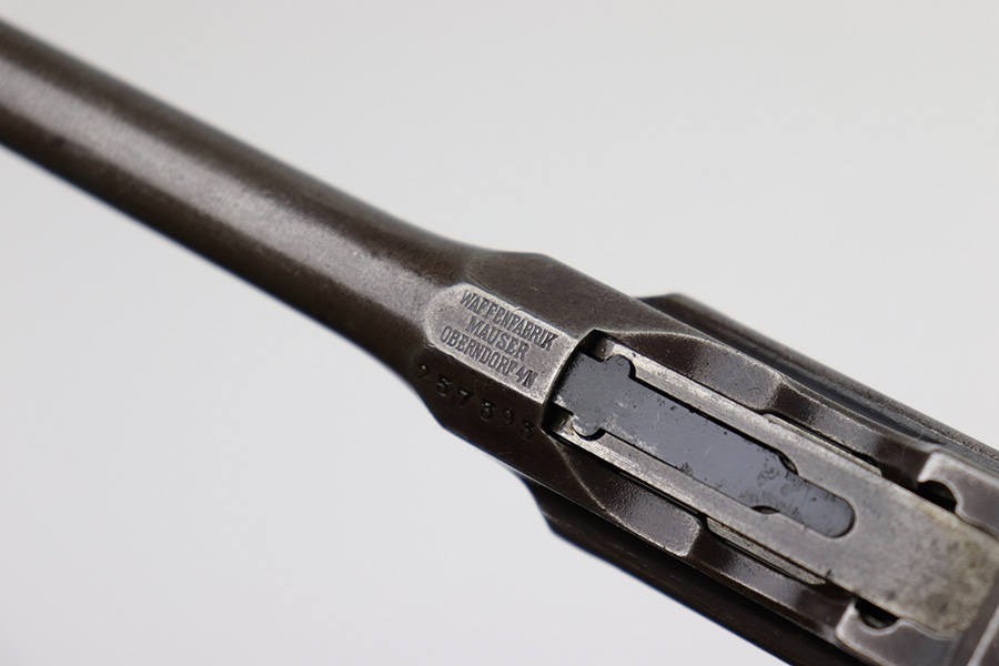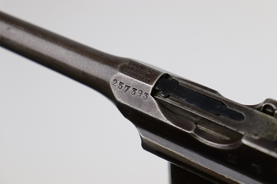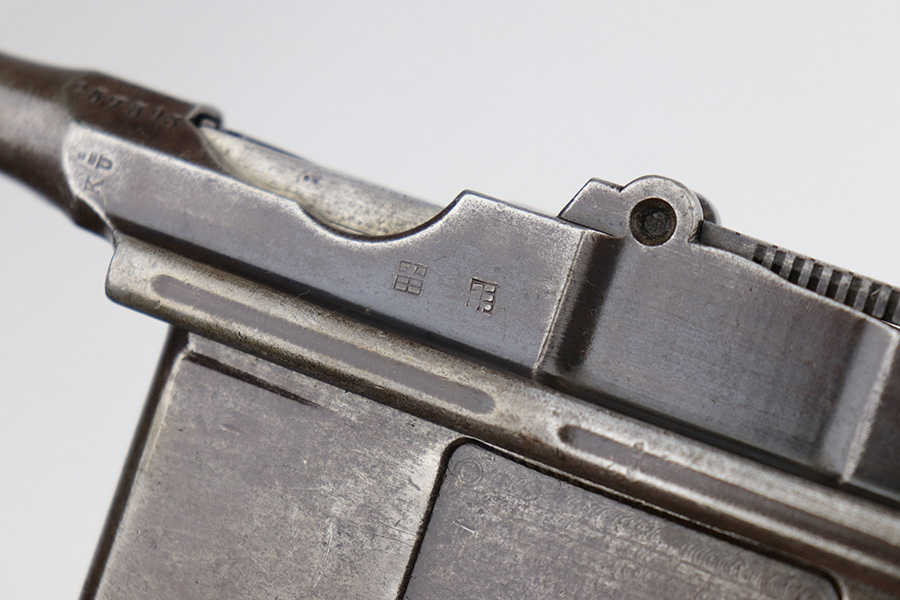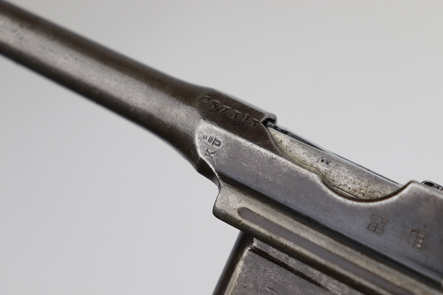 12/19/22 – This is a Mauser C96 Broomhandle manufactured between 1911-15 and was likely sold in China, as evidenced by the Chinese characters on the left side of the slide. The gun is entirely mismatched and has an import mark on the barrel. It has lost virtually all of its finish with noticeable spotty brown patina and light scratching throughout. Fitted with un-numbered wood grips. Both panels show signs of wear and bruising. The rifling in the bore is worn with minor pitting throughout.
