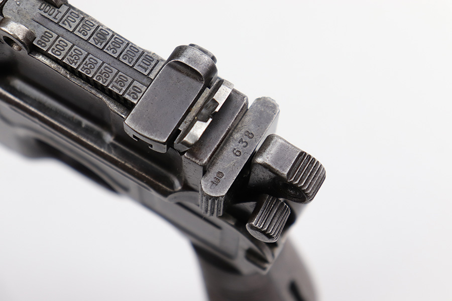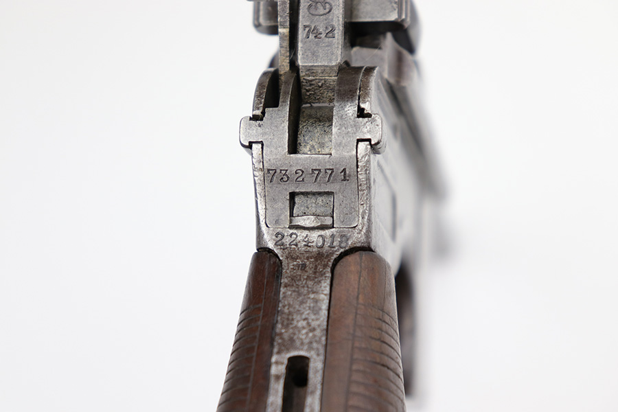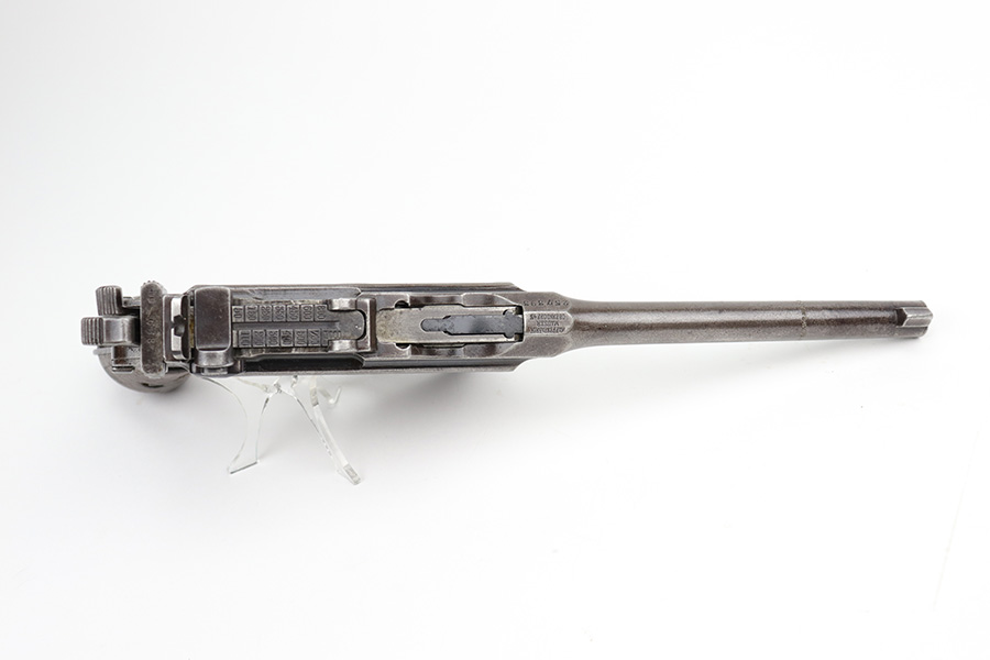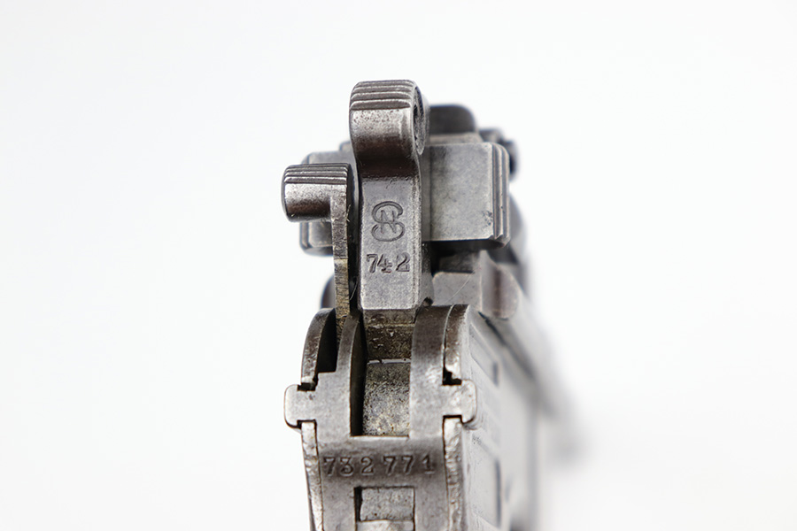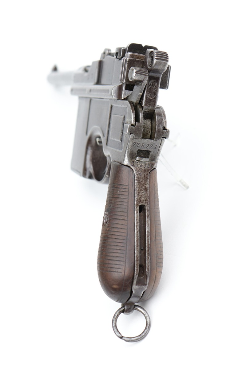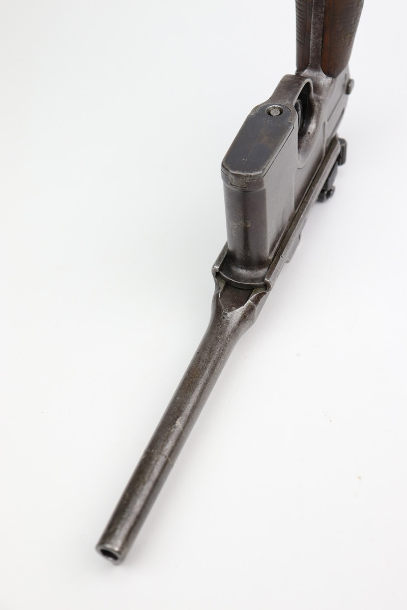 12/19/22 – This is a Mauser C96 Broomhandle manufactured between 1911-15 and was likely sold in China, as evidenced by the Chinese characters on the left side of the slide. The gun is entirely mismatched and has an import mark on the barrel. It has lost virtually all of its finish with noticeable spotty brown patina and light scratching throughout. Fitted with un-numbered wood grips. Both panels show signs of wear and bruising. The rifling in the bore is worn with minor pitting throughout.
